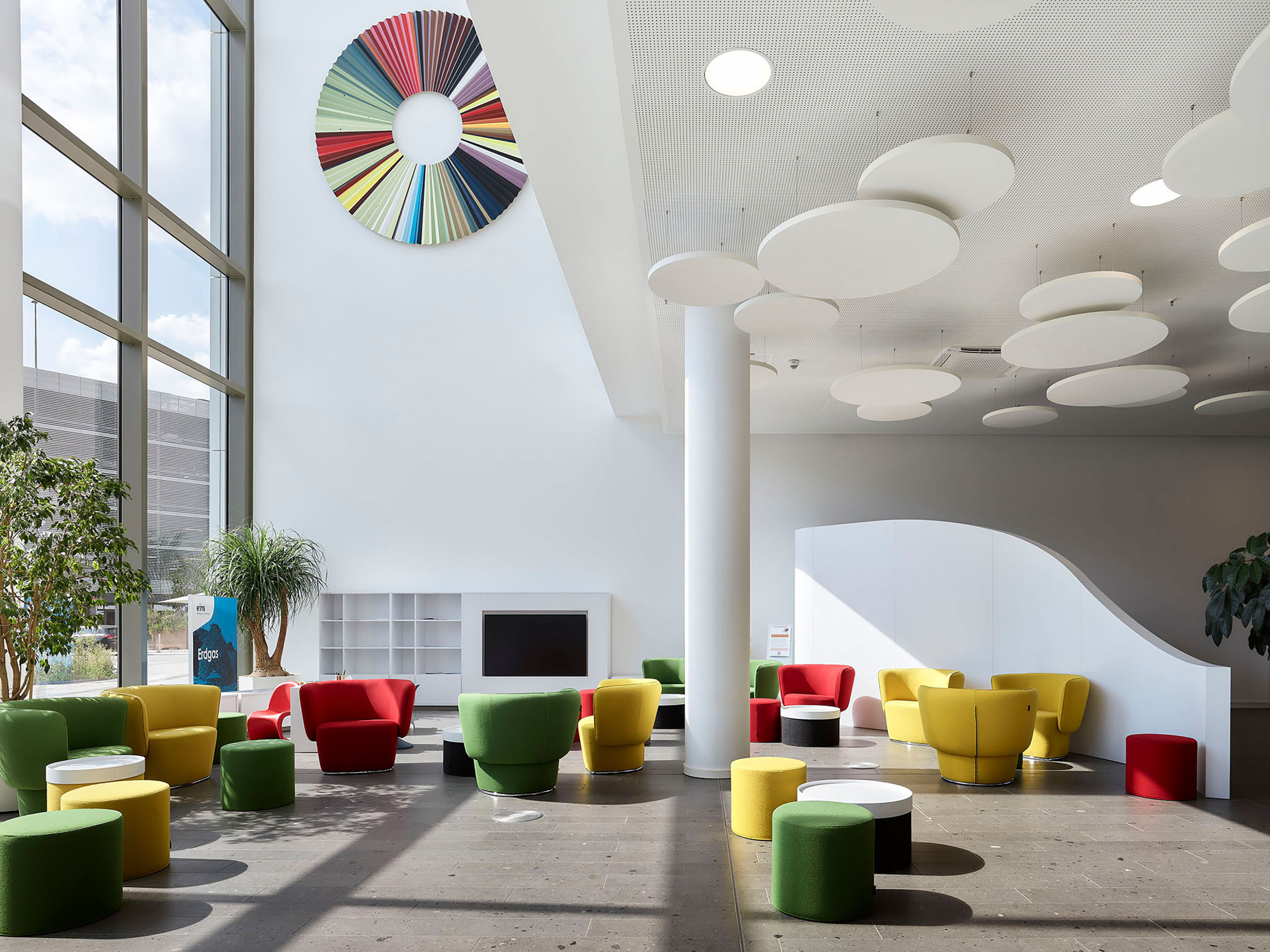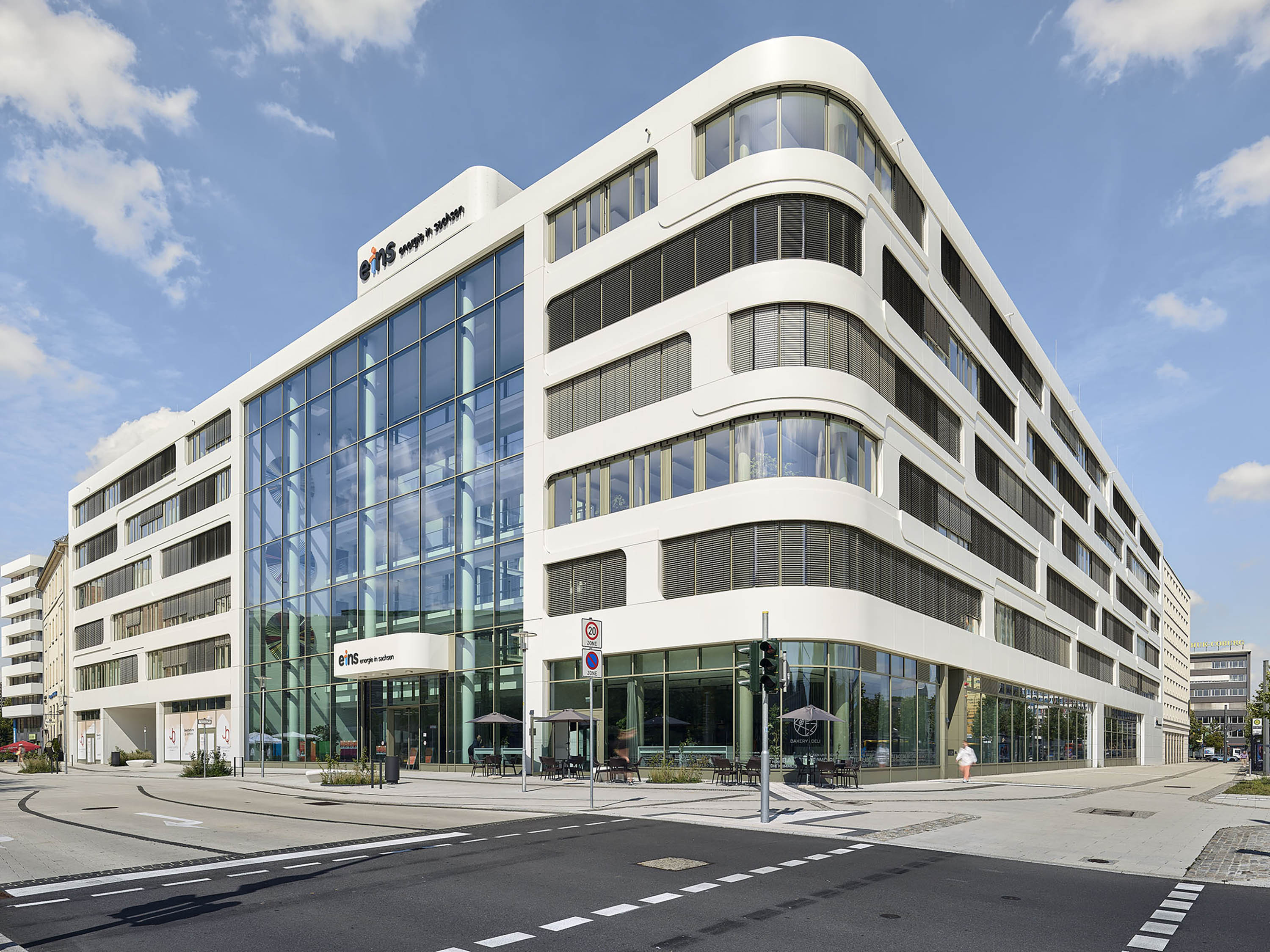 Das Volumen ist horizontal ausgerichtet: Panoramafenster ziehen sich, umrahmt von weißen, skulptural geformten Bandstrukturen, über die gesamte Fassade. Dabei interpretieren die Wellenmotive assoziativ die Gebäudenutzung und stehen für den Austausch, die Bewegung, den Energiefluss.
