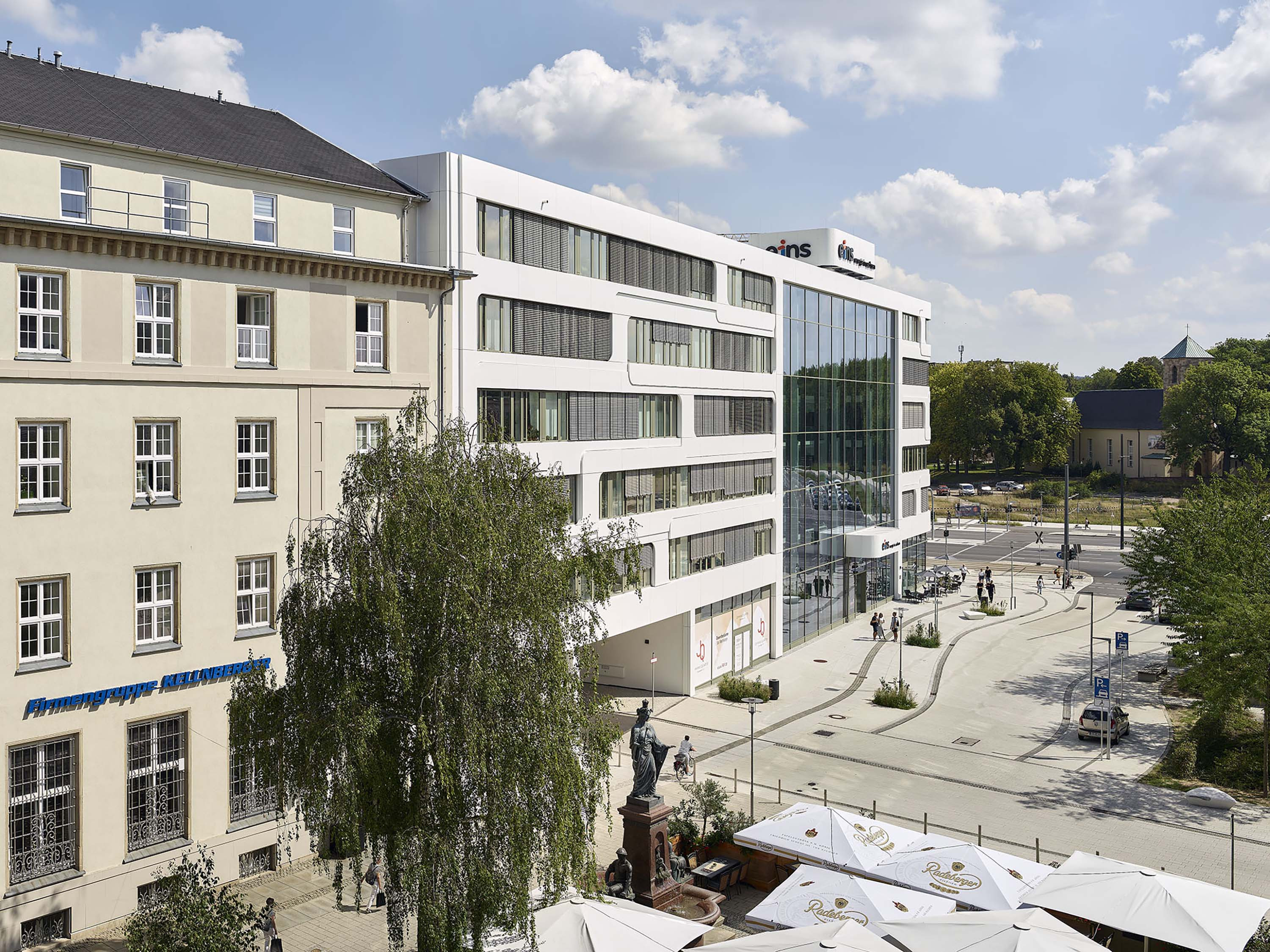 Der Neubau mit sechs Vollgeschossen orientiert sich an der Traufhöhe der Nachbargebäude. Das Gebäude nimmt den Wiederaufbau-Geist des Stadtzentrums aus der 1970er - 80er Jahren auf und entfaltet eine starke Wirkung hin zum Straßenraum.