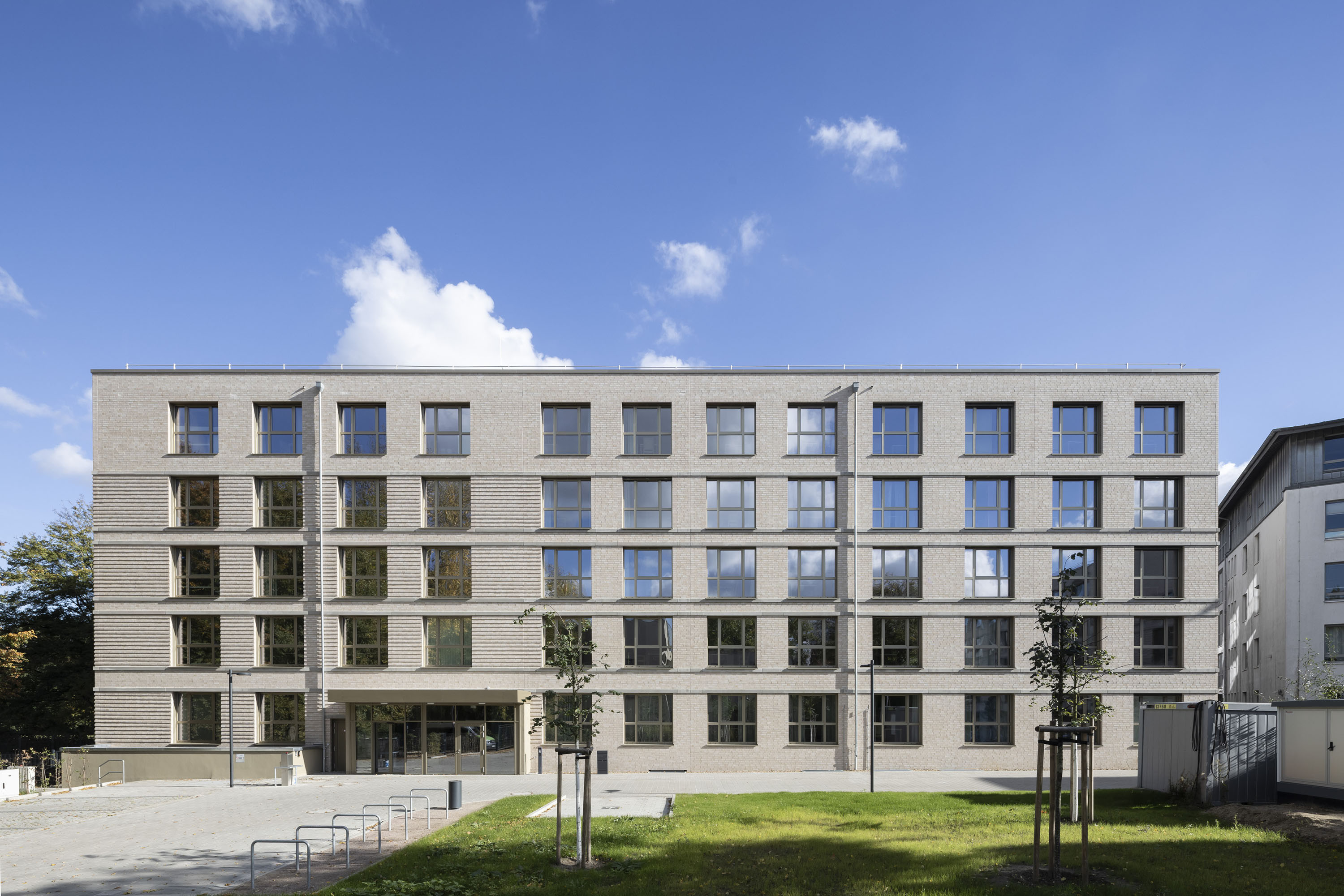 Wesentliches Material der Fassaden beider Gebäude ist ein hellbeiges und hell verfugtes Verblendmauerwerk mit feiner Farbnuancierung. Es wurde bewusst auf eine starke farbliche und materielle Differenzierung der beiden Gebäude verzichtet, um den Zusammenhalt und die Ablesbarkeit der Gebäudekubaturen zu stärken. Kleine, auf den zweiten Blick erkennbare Differenzierungen der Detaillösungen sorgen für eine stärkere Lebendigkeit und Vielfalt des Ensembles.