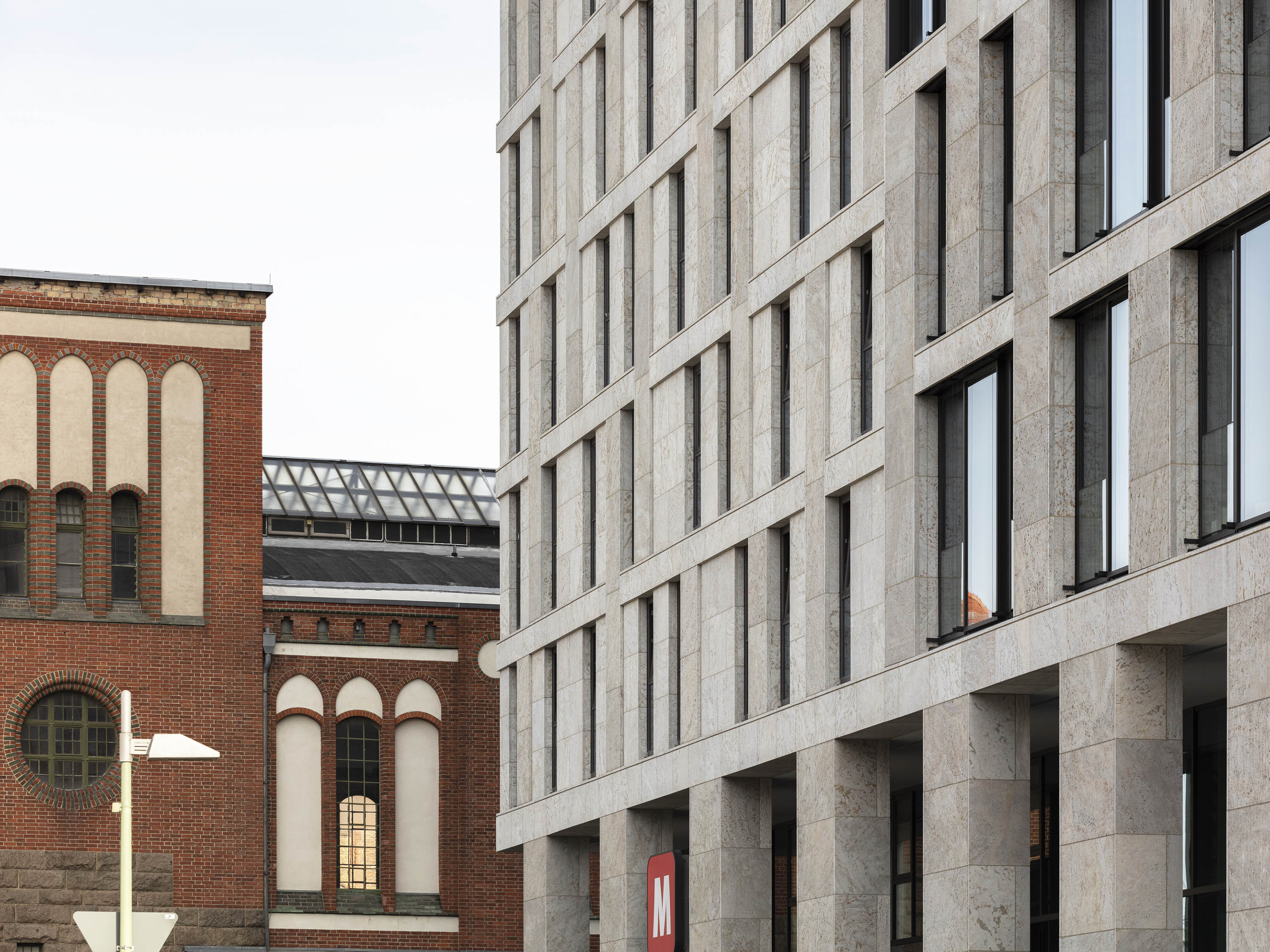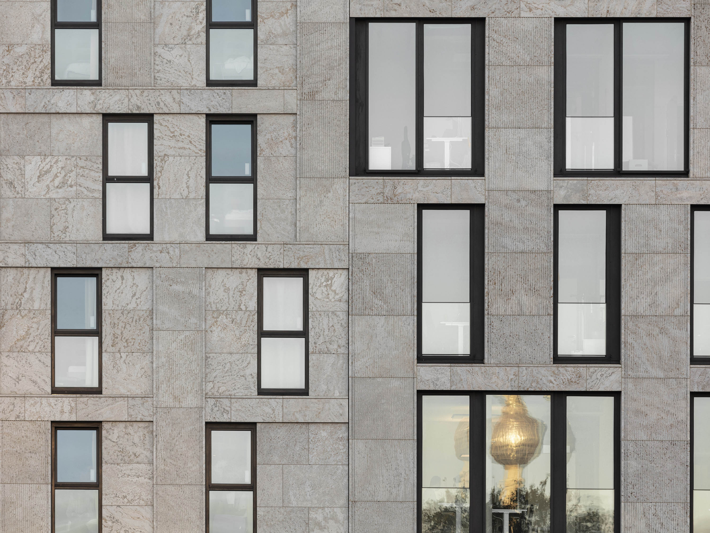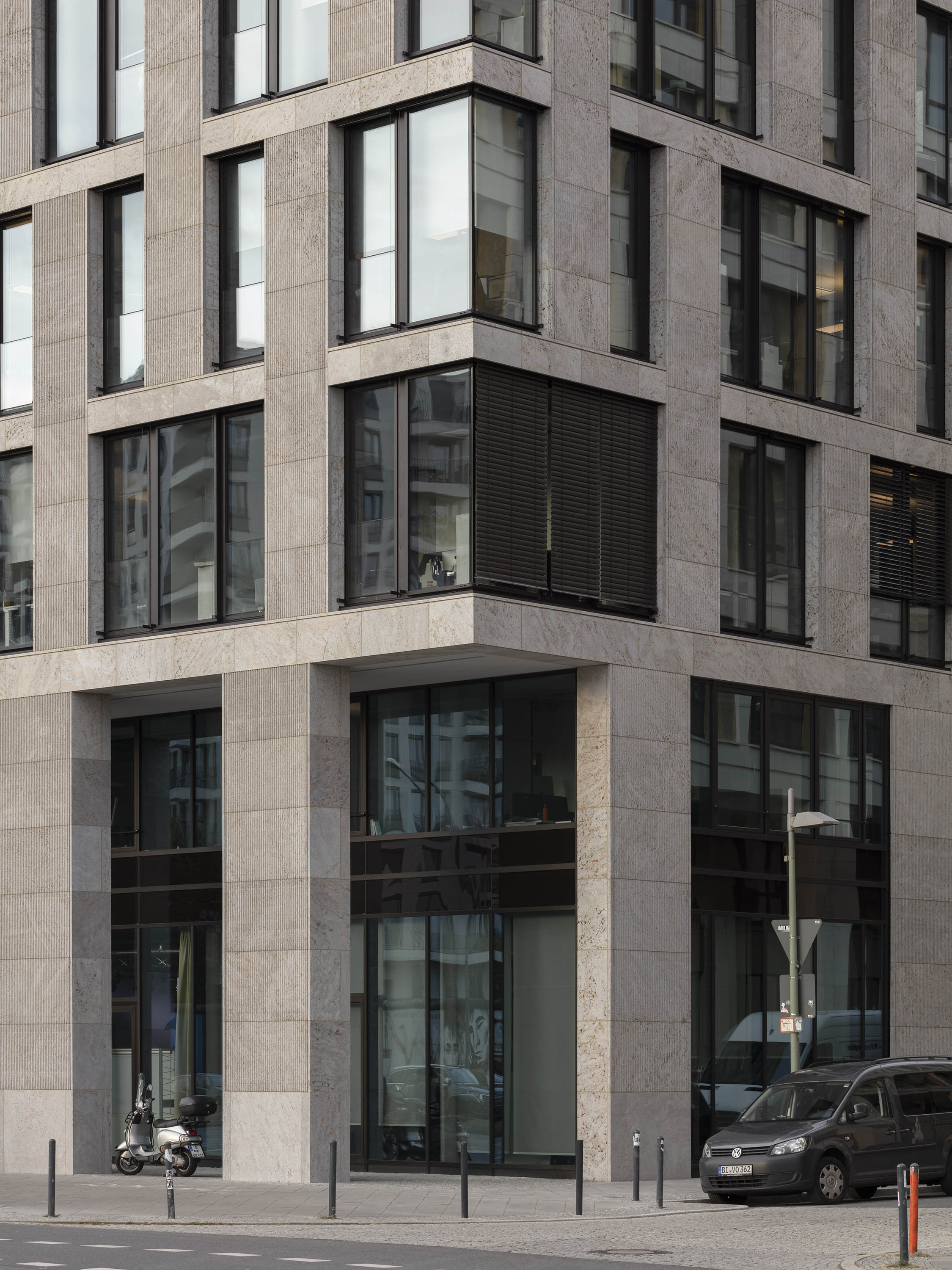 Wie beim benachbarten Hotel besteht die Natursteinfassade des Bürohauses aus glatten Steinflächen aus geschliffenem, teilweise kanneliertem Kohlplatter Muschelkalk und ist in zwei Bereiche gegliedert: Einen zweigeschossigen Sockelbereich vom Erdgeschoss bis zum ersten Obergeschoss und die Fassade der darüber liegenden Regelgeschosse. Auch nimmt die Bürohausfassade die Fassadenstruktur des Hotels wieder auf, das Grundraster aus einander überlagernden Pilastern und Gesimsen wurde beibehalten.