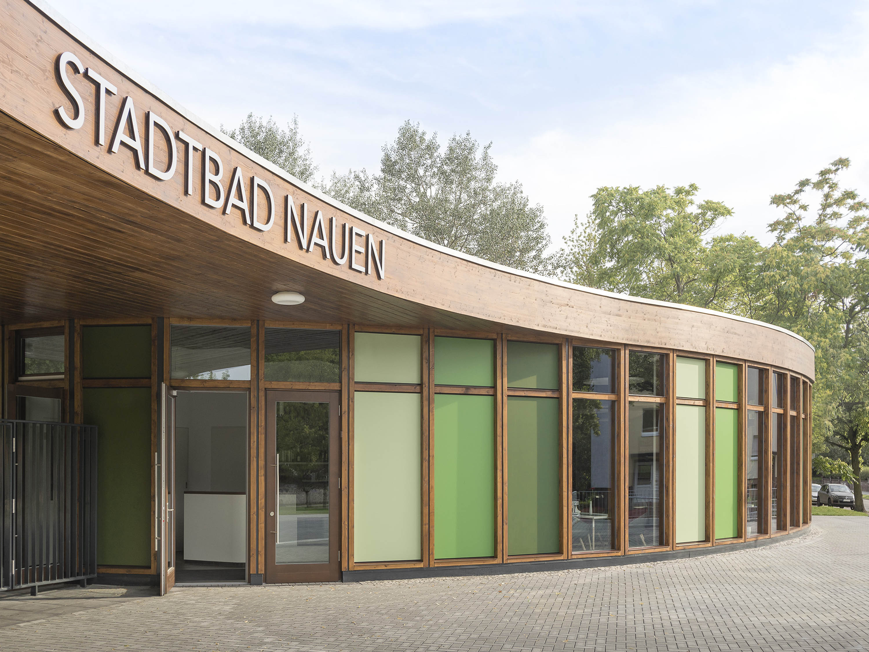 Die organische Form der beiden eingeschossigen Baukörper sowie die Farbpalette der Fassaden harmonieren mit der naturnahen Landschaftsgestaltung. Das markante, geschwungene Attikaband umläuft die beiden Volumen, verbindet sie gleichzeitig und schafft damit eine Torsituation am Eingang zum Stadtbad. Holzrahmen bilden die Tragstruktur und gleichzeitig die Fassade des Gebäudes. Sie besteht aus vorgefertigten polygonalen Holzrahmen mit Zweifachverglasung und gedämmten Holzpaneelen in geschlossenen Fassadenbereichen.