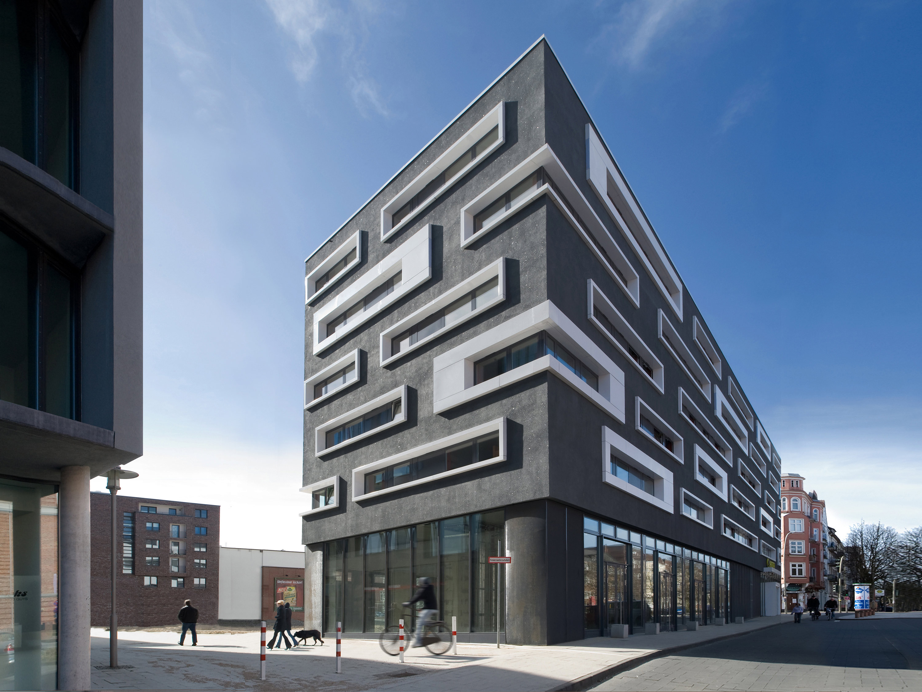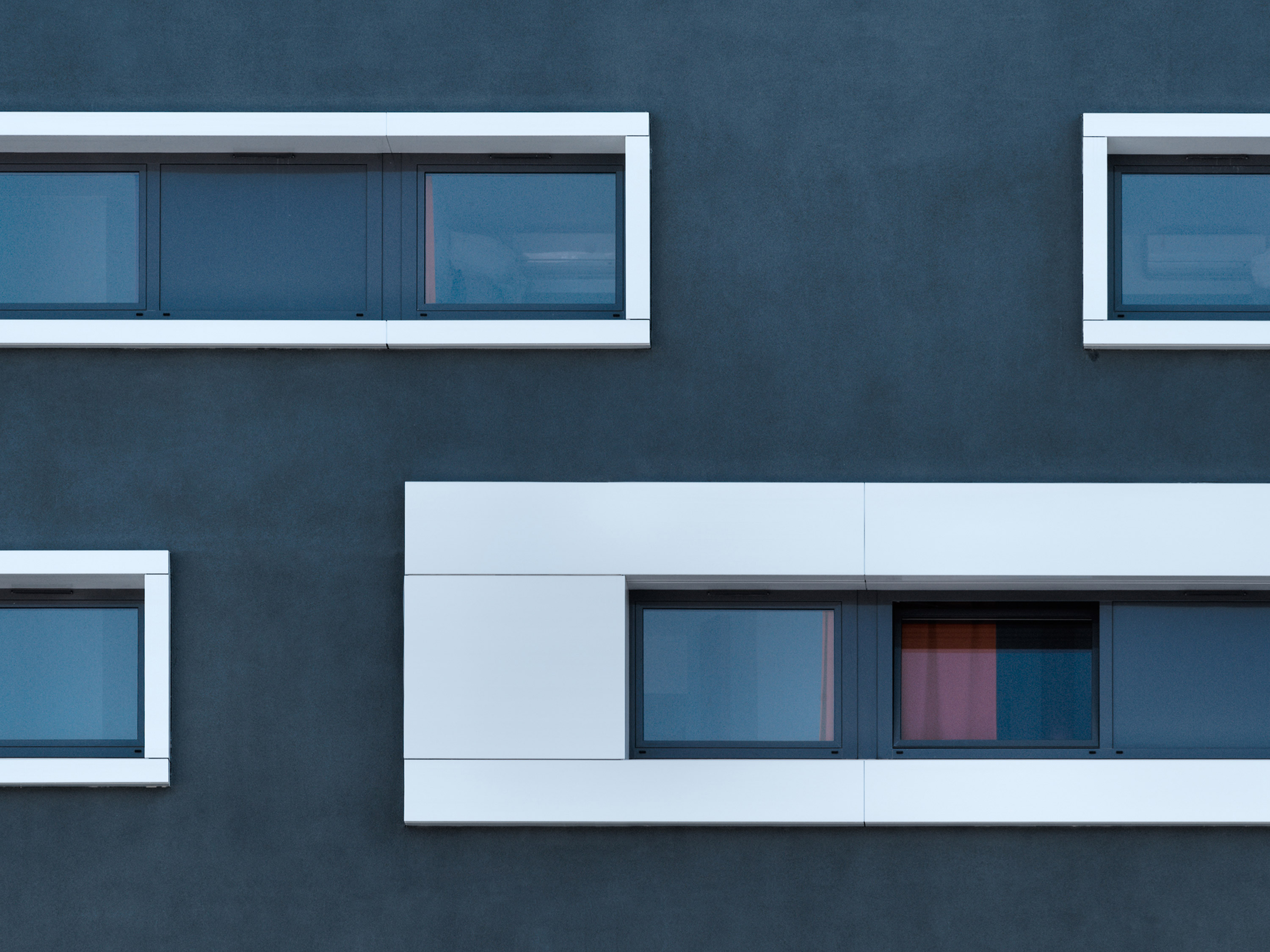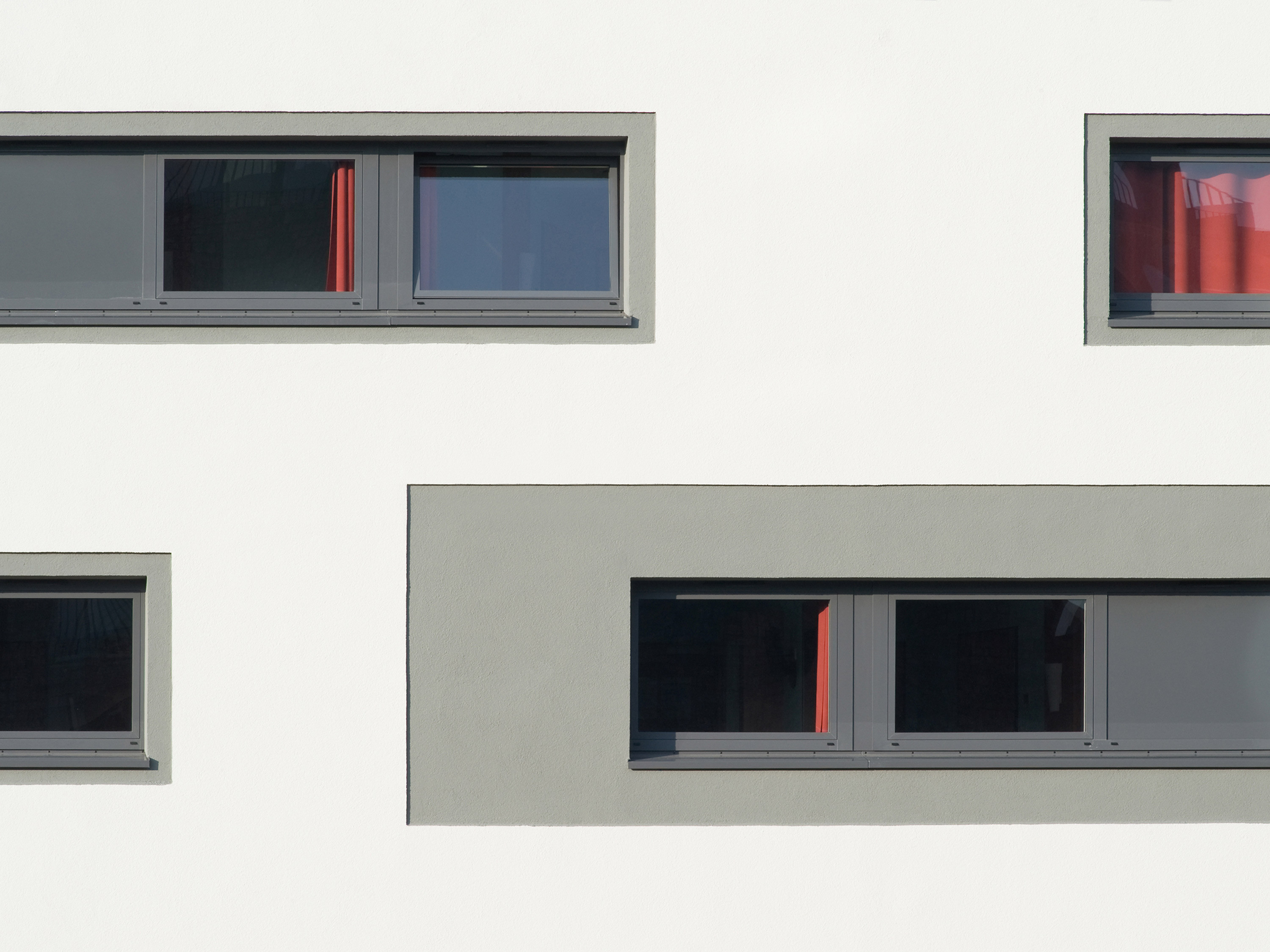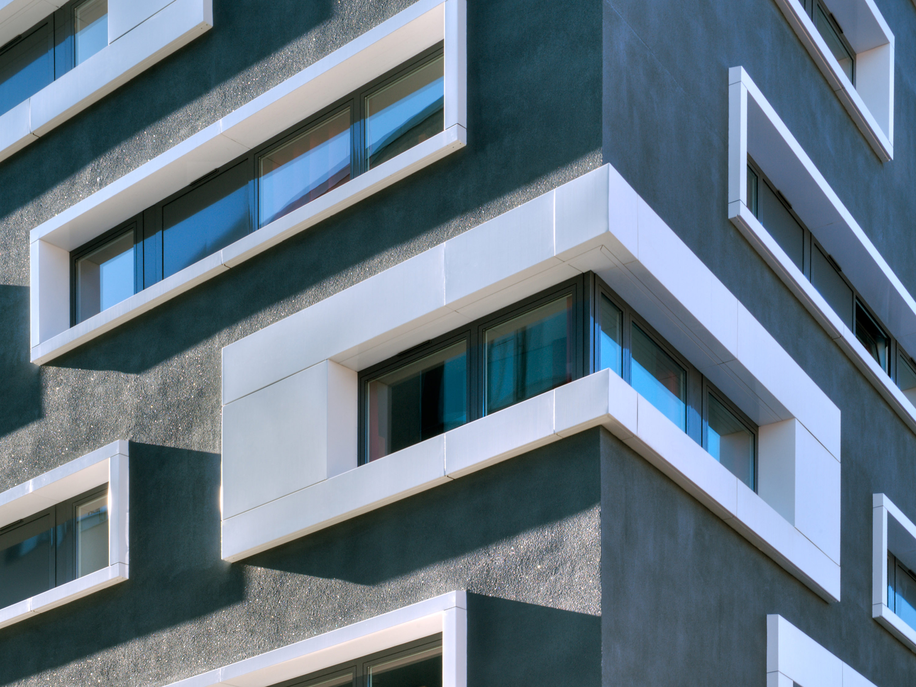 Inspired by neighboring façades that contrast in color and sculpturally, the window bands are framed with frame-like passe-partouts made of white aluminum, giving the building its own characteristics. The south façade was designed as a “negative” to the main façades with dark plaster panels on a white background.