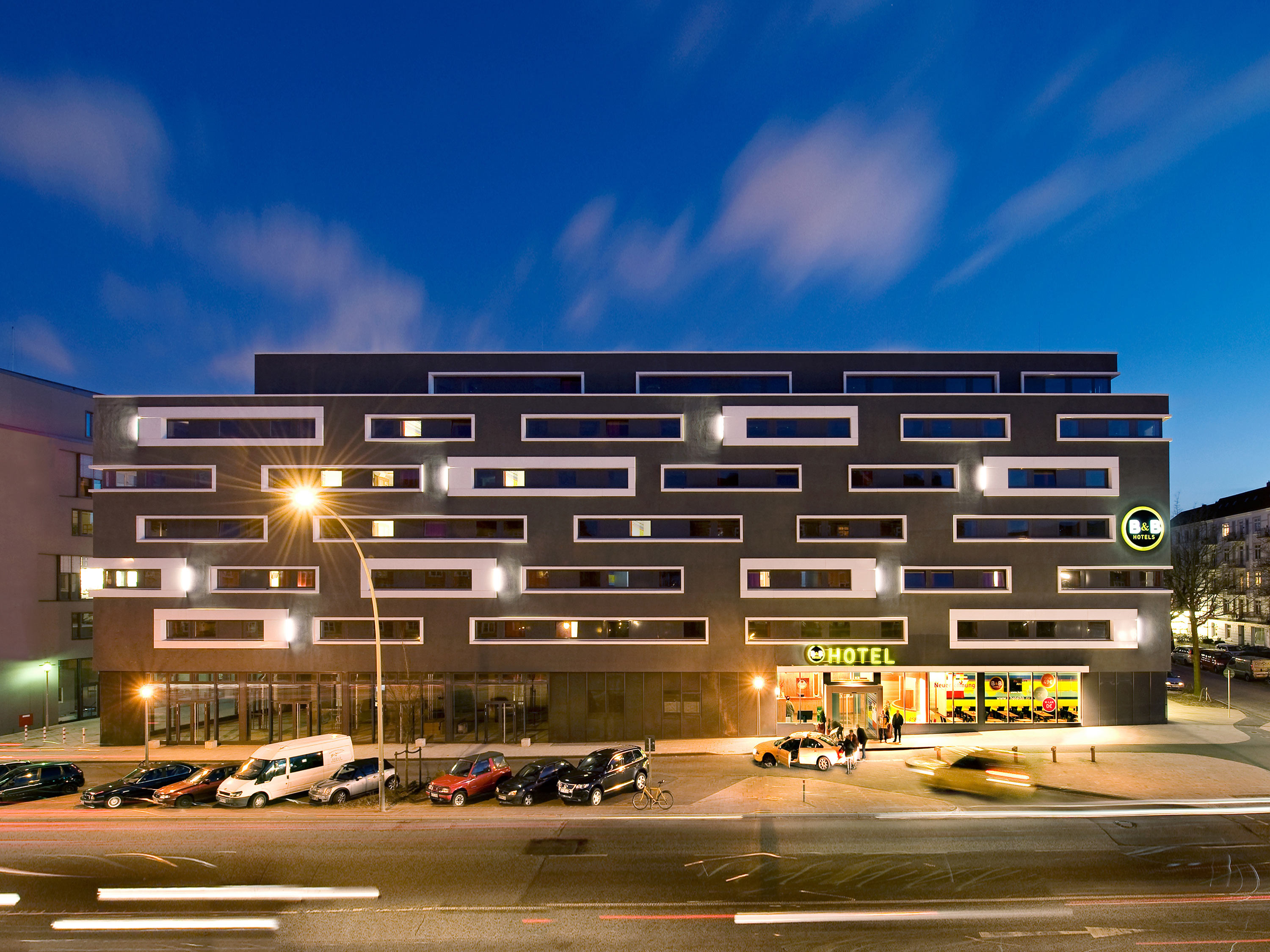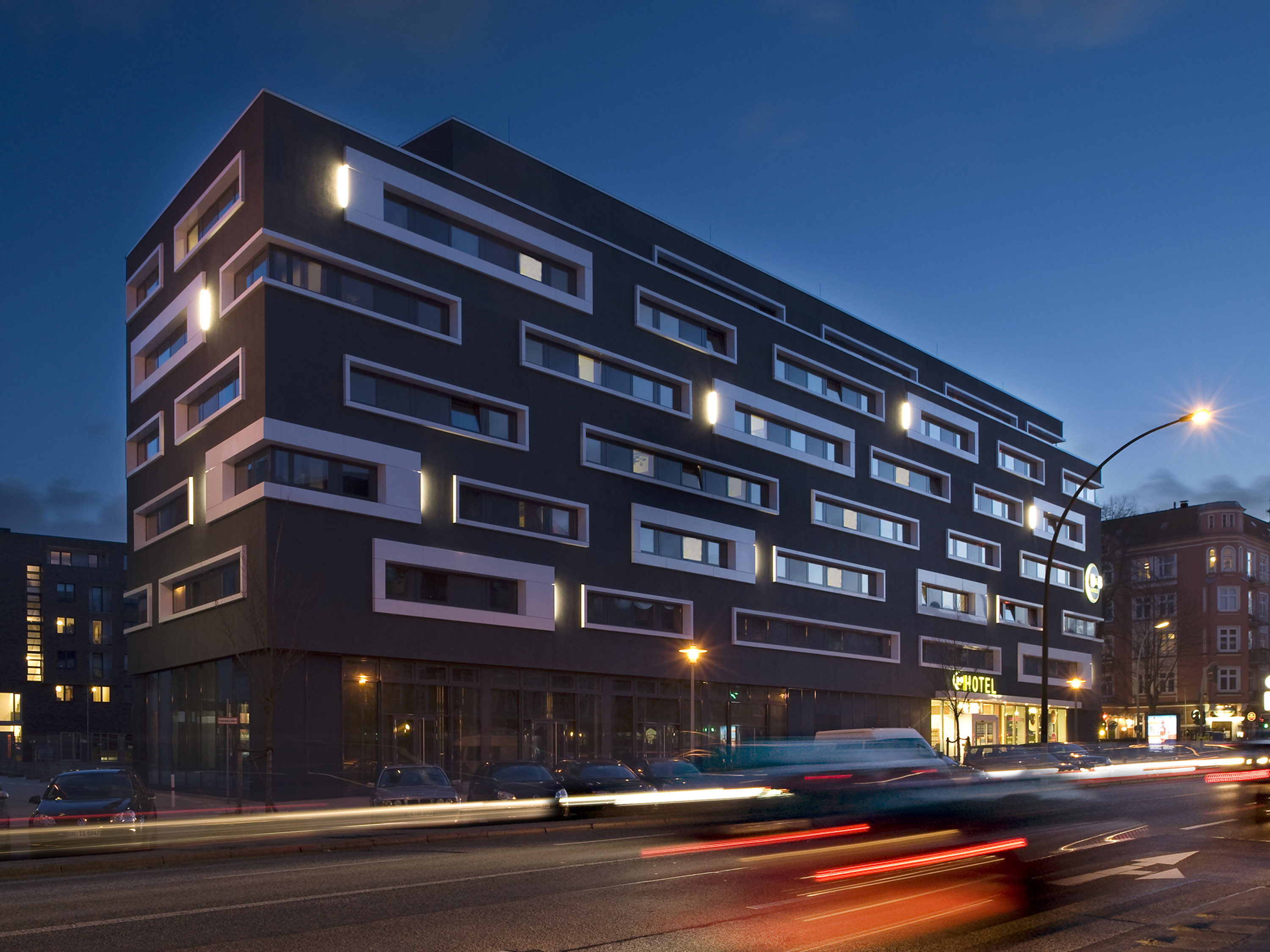 In dialogue with the existing development, a massive six story plastered building was created with a meandering ribbon façade in the area of the hotel rooms. The base zone, planned as a glass joint, accommodates various retail areas in addition to the hotel entrance, lobby and other public areas.