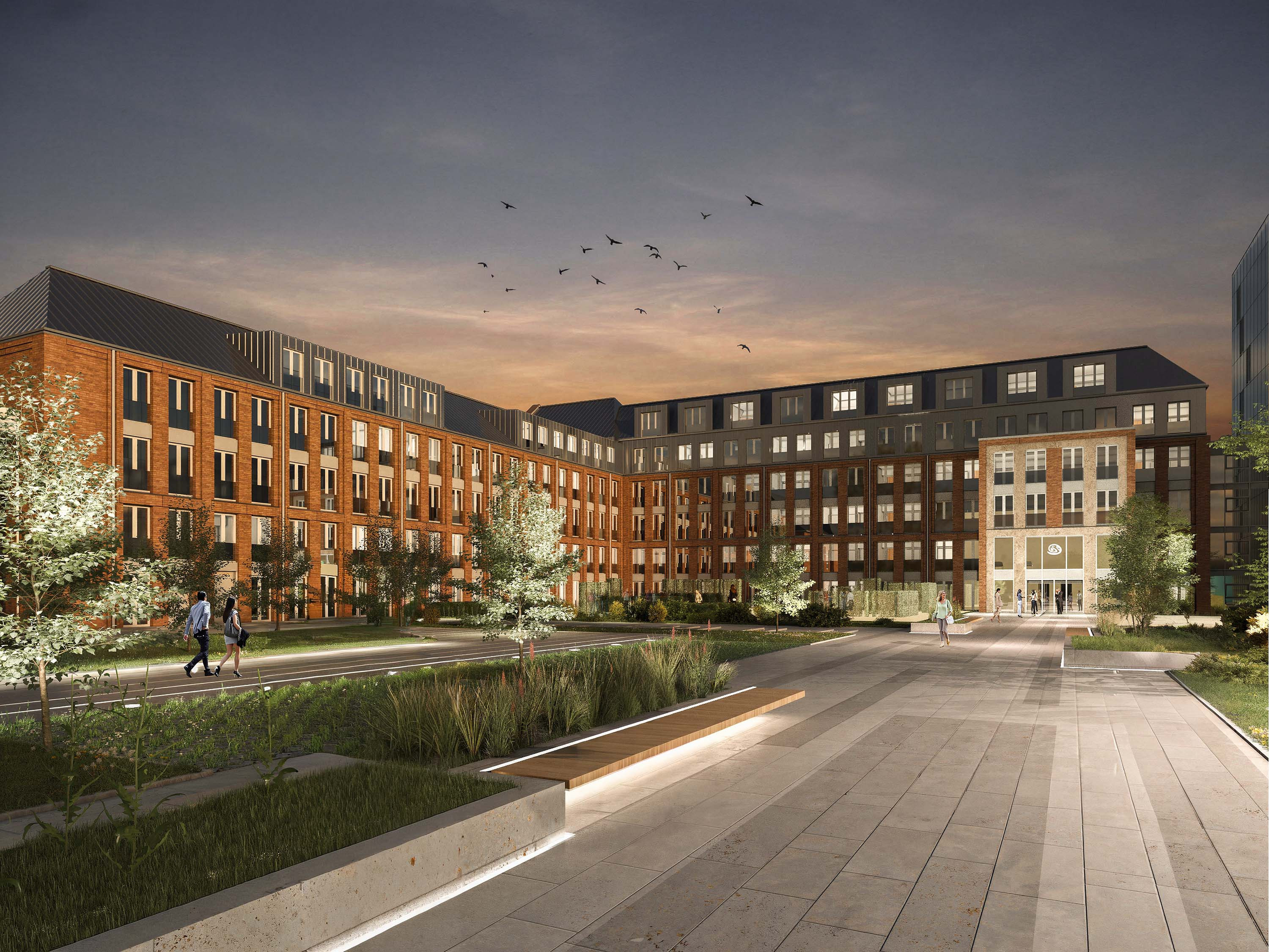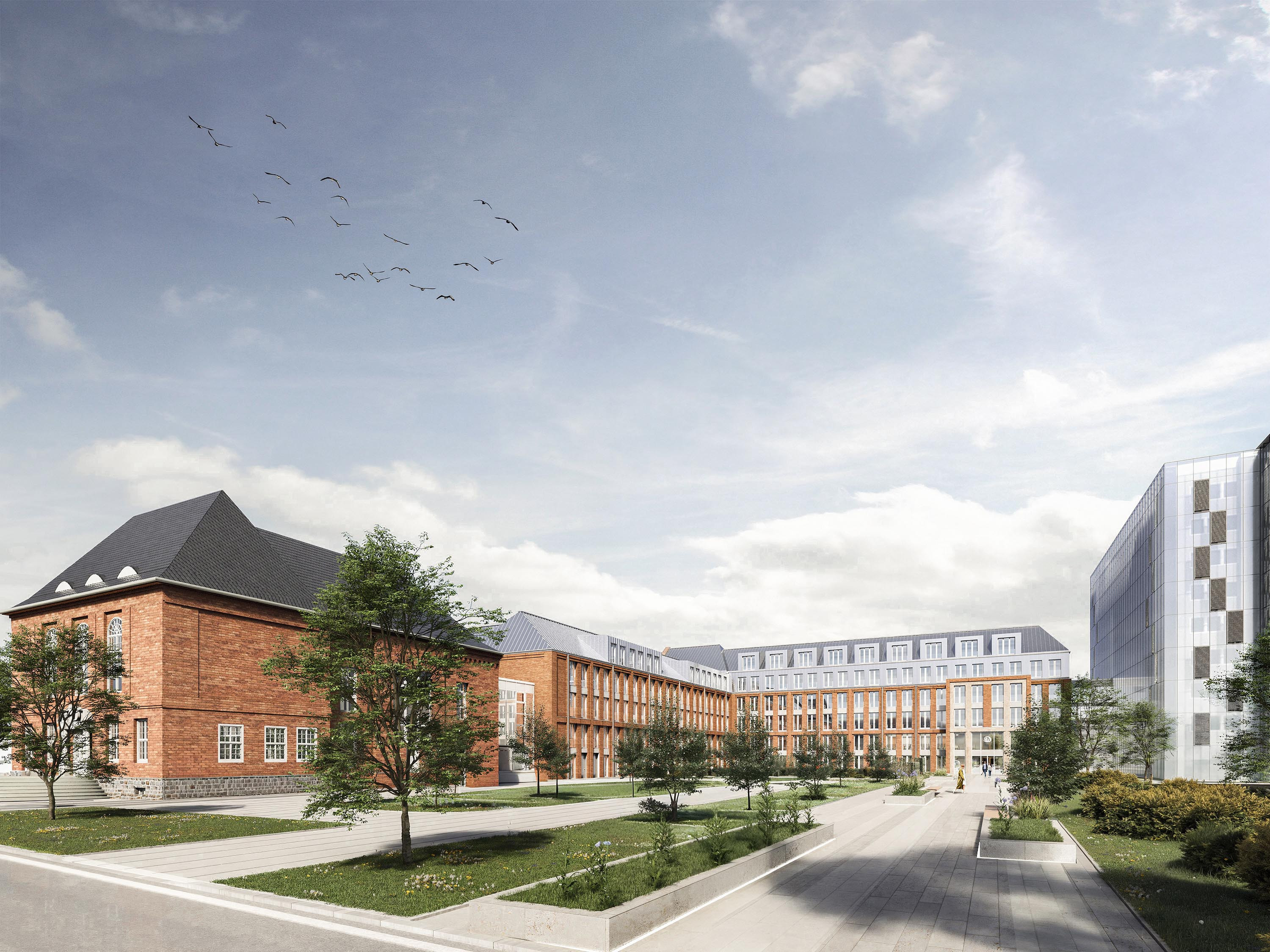 House A is planned as a fully basemented building with five to six storeys and a pitched roof. In addition, a new modular car park with 387 parking spaces arranged over twelve split levels is being constructed to the west of the existing House B.