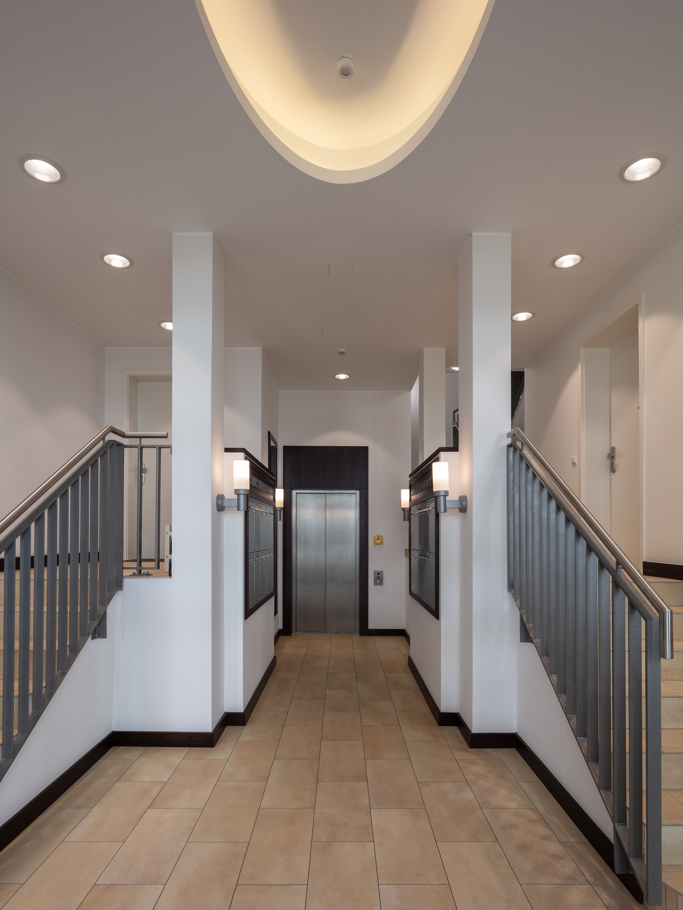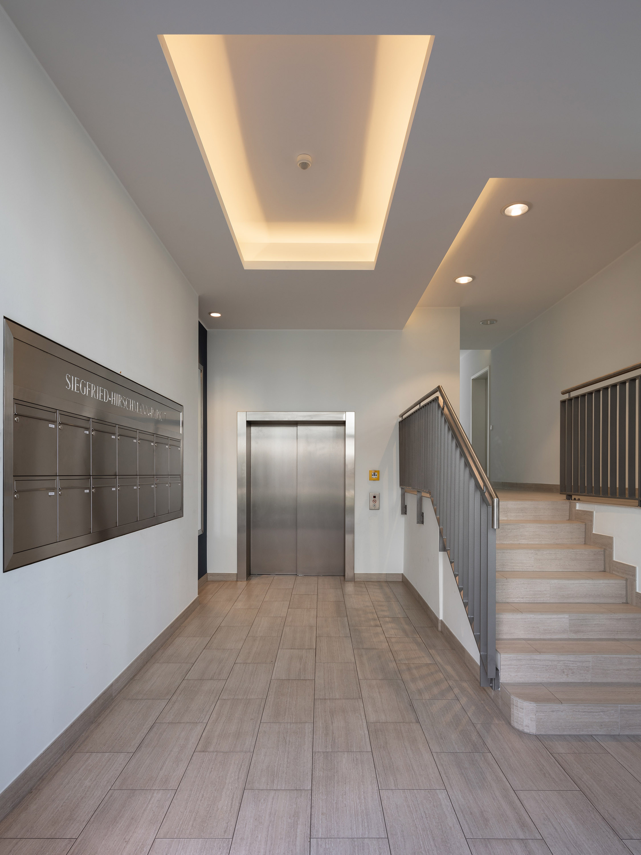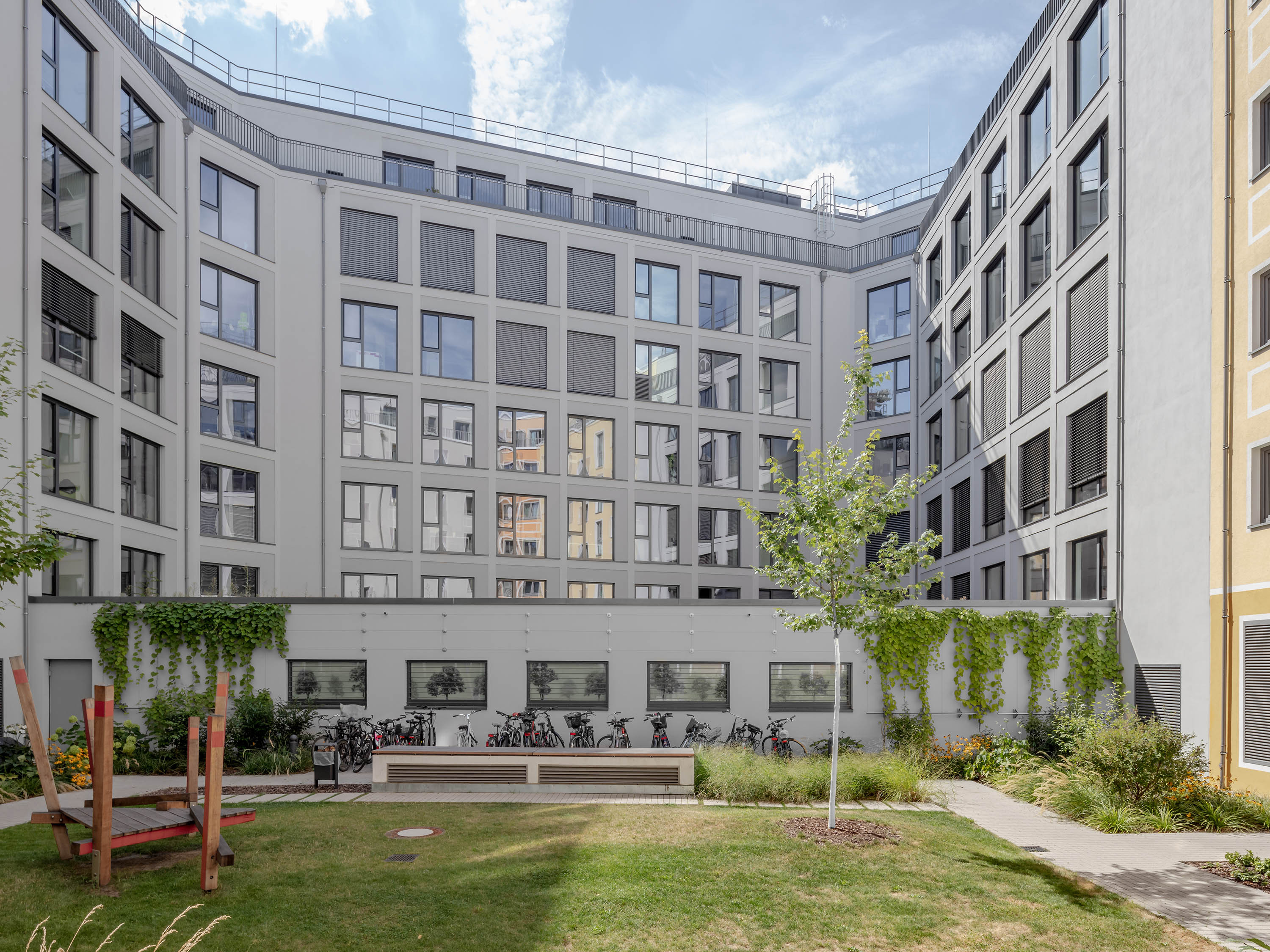 The BZ residential block, in cooperation with Bonnani Architekten, together with the BY office building, encloses a landscaped inner courtyard with private front garden areas. The block has six full storeys and a staggered storey with 73 residential units, two- to four-room flats with a clear room height of approx. 2.70 m and a total living space of around 6,500 sqm.