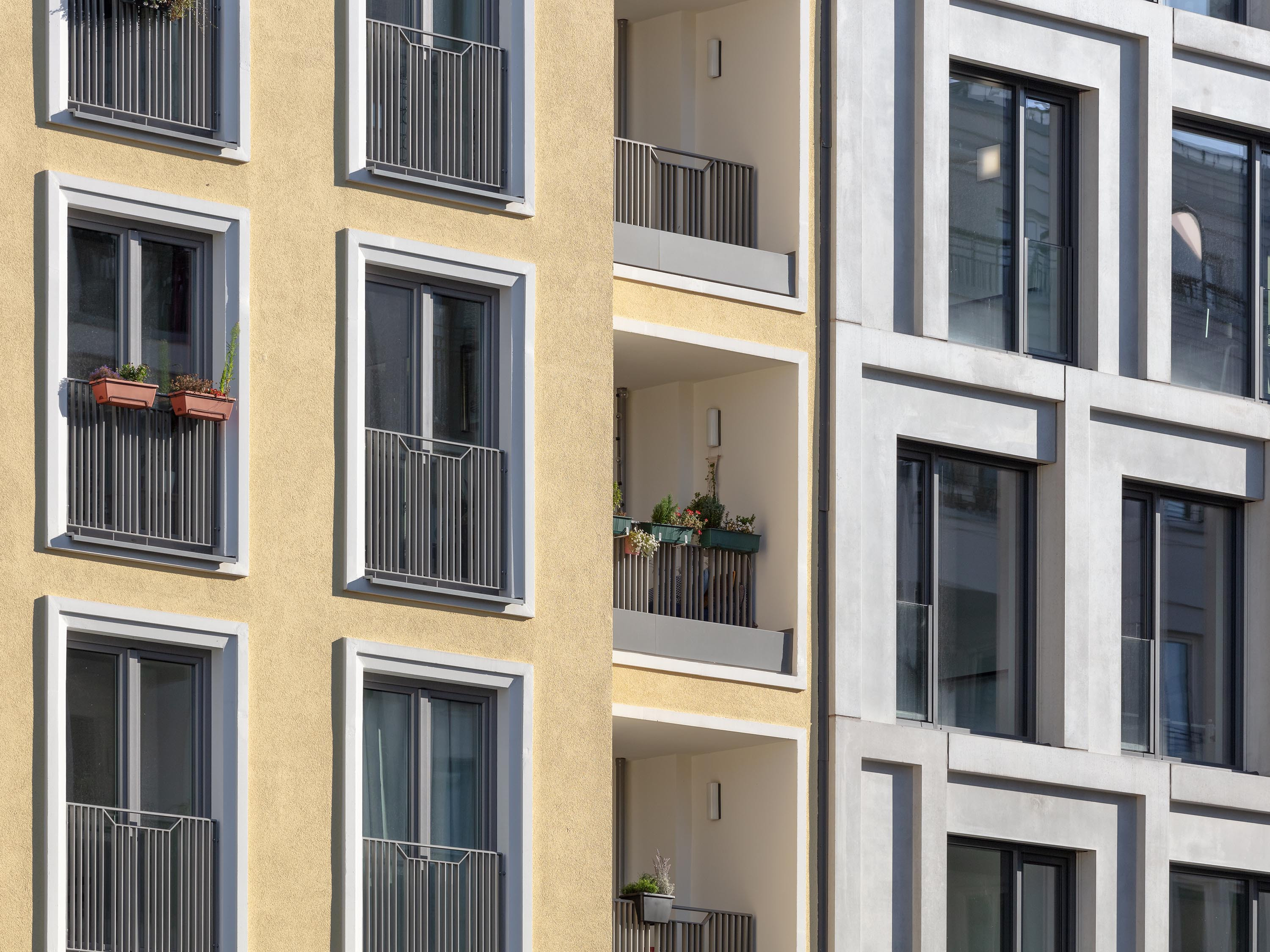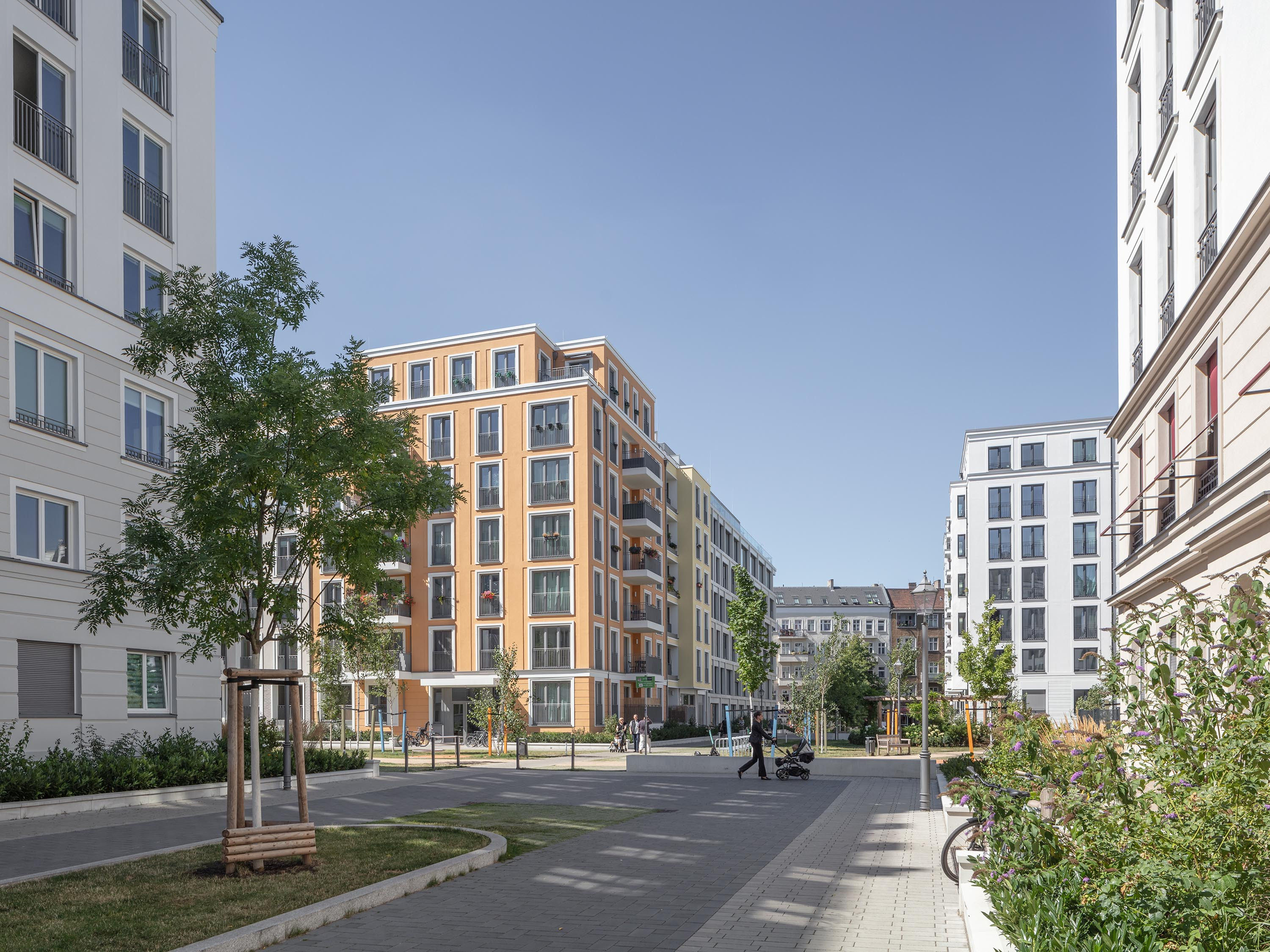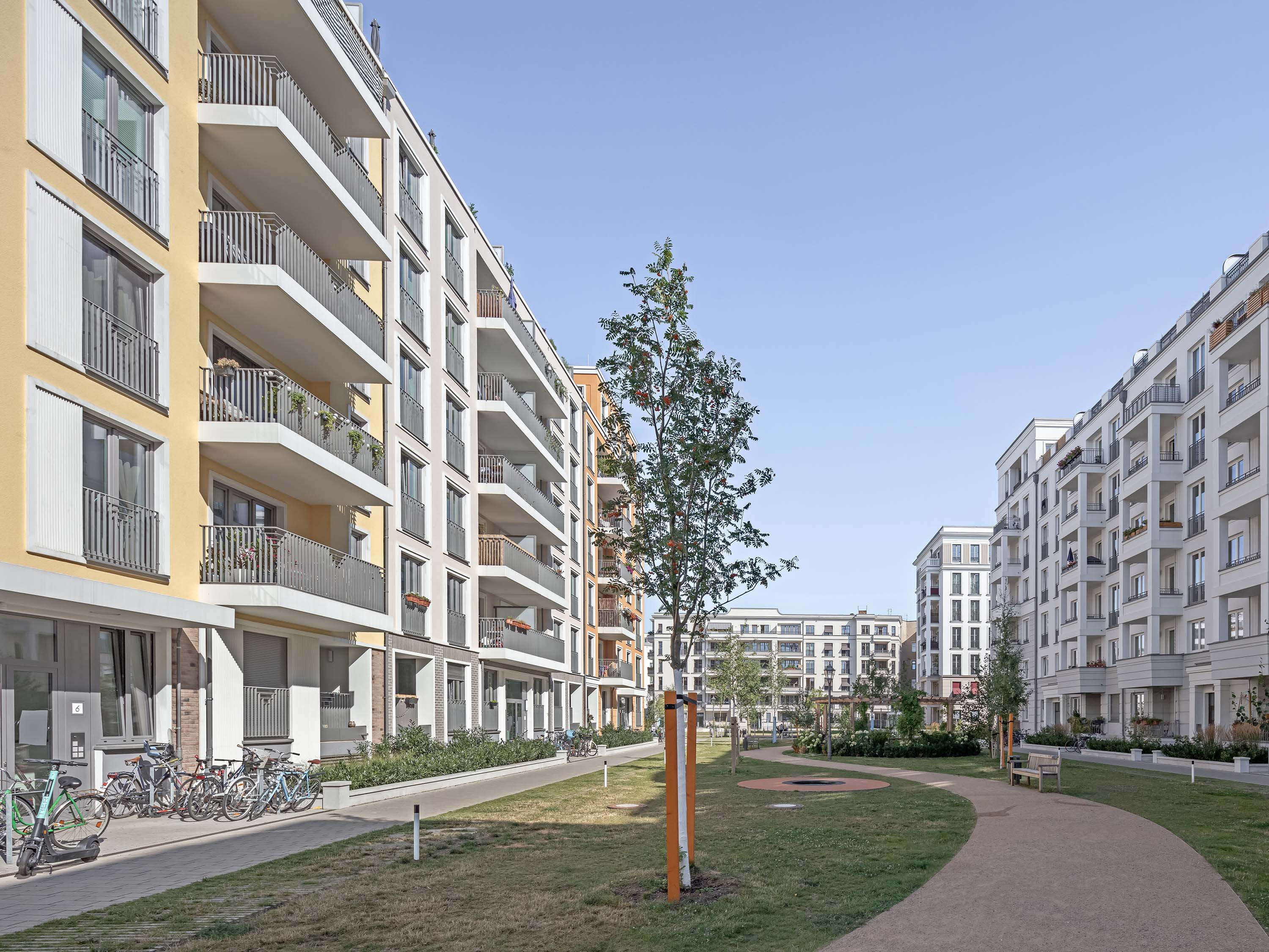 The façade design was developed separately by four façade architects in order to achieve the greatest possible design variety on the entire area. TCHOBAN VOSS Architekten were responsible for Block BY and BZ. The facades (BZ) were executed with a thermal insulation composite system with a fine-grained plaster layer and different colouring to delimit the individual units within the block.