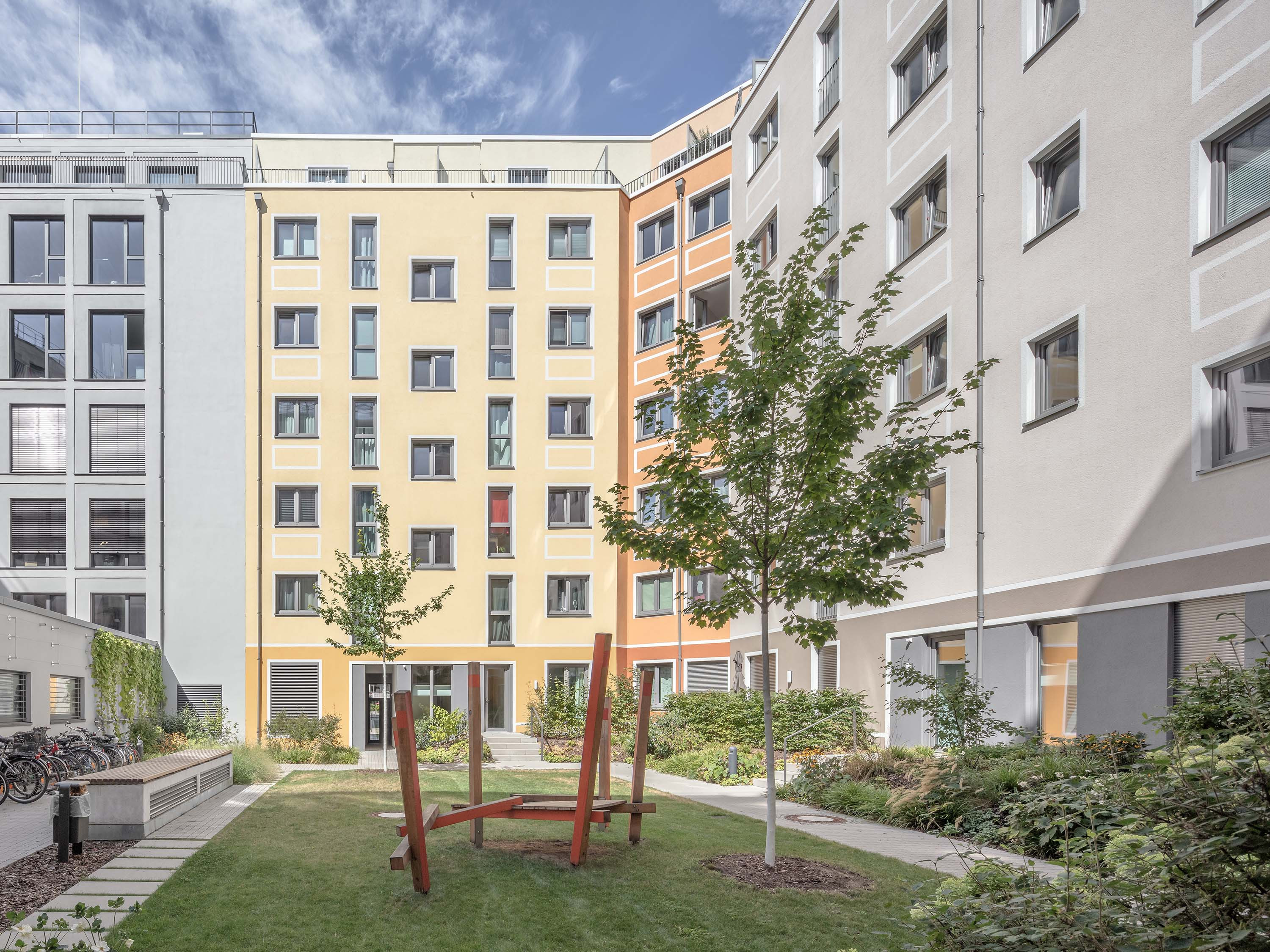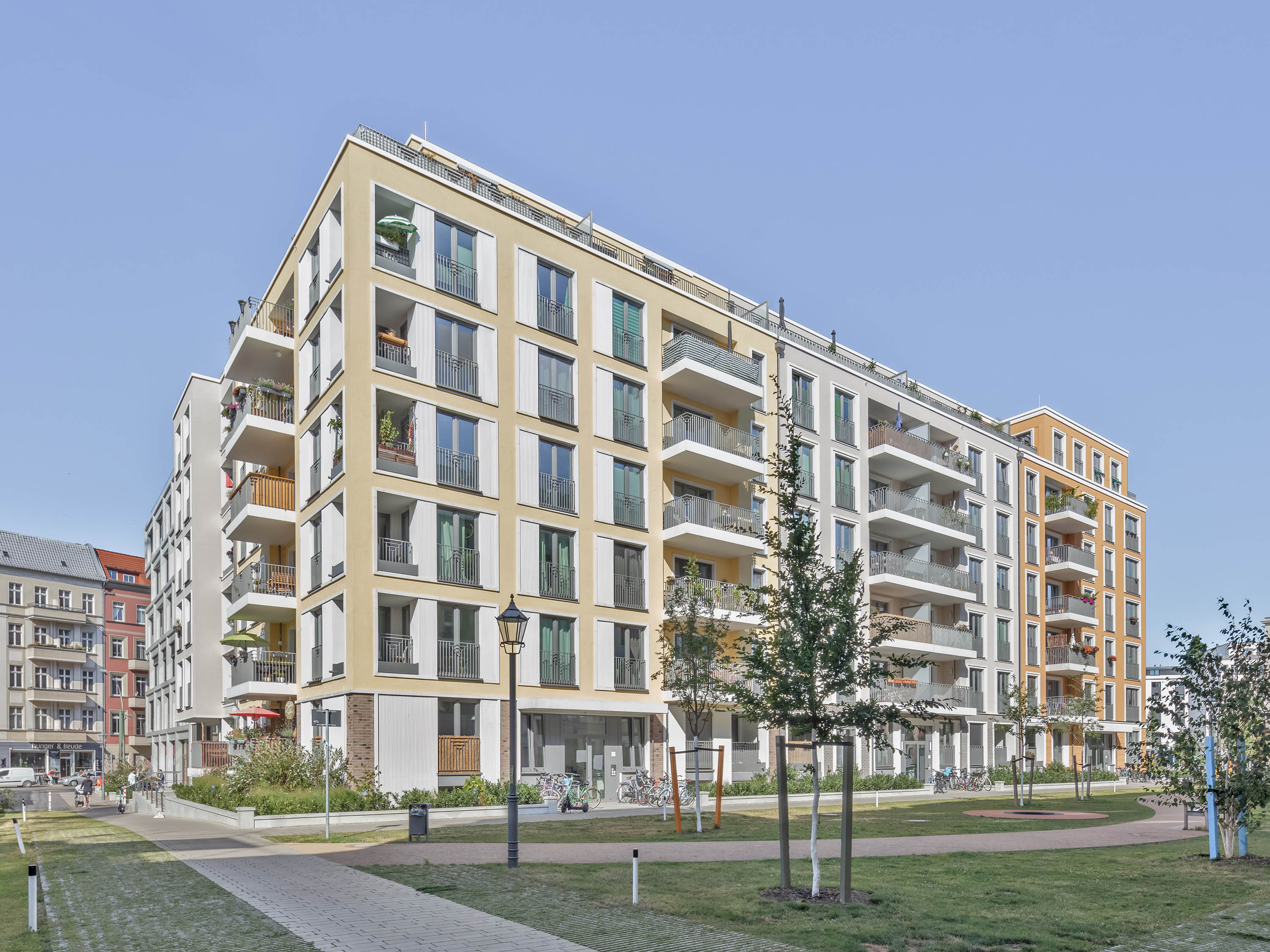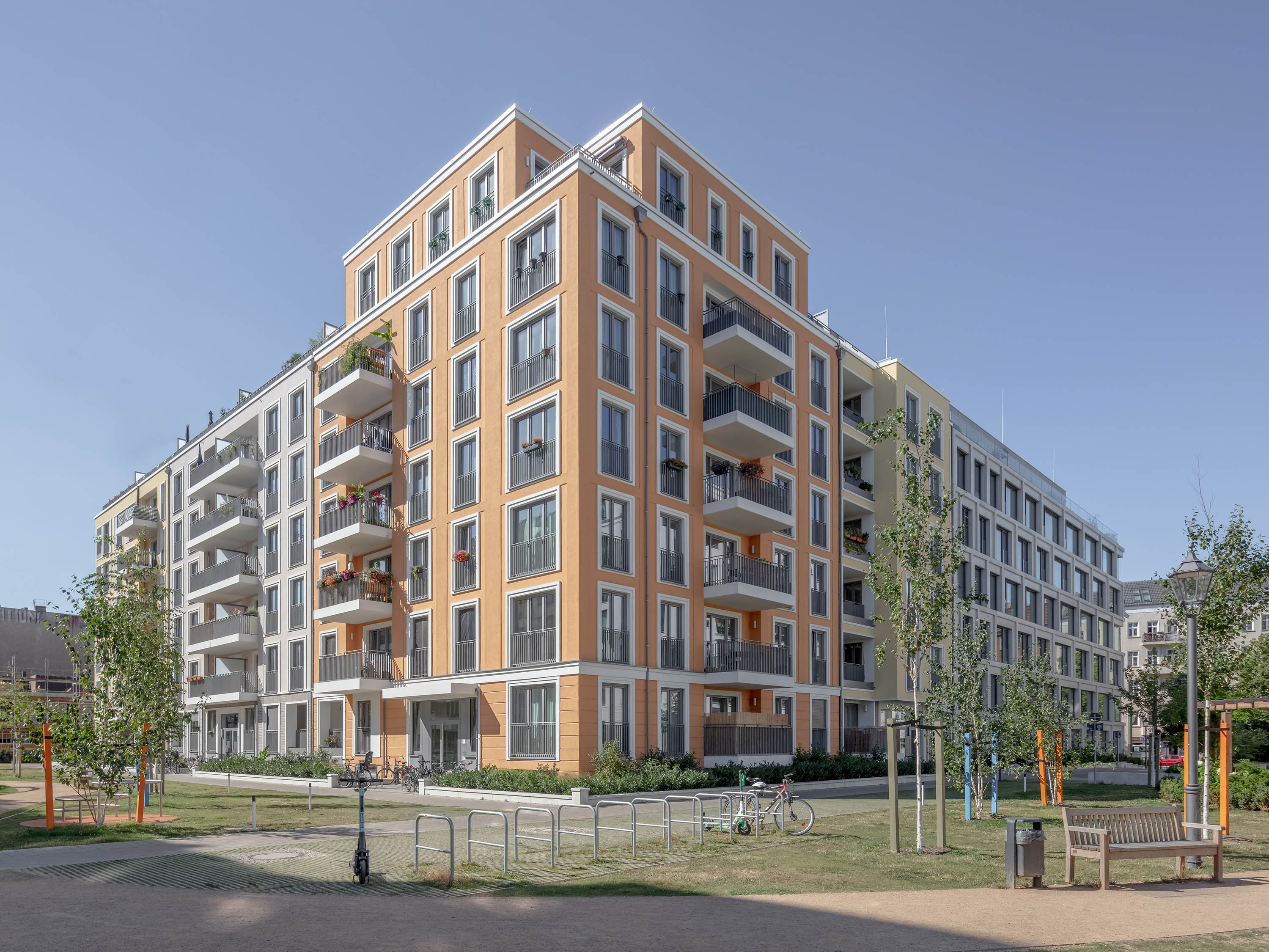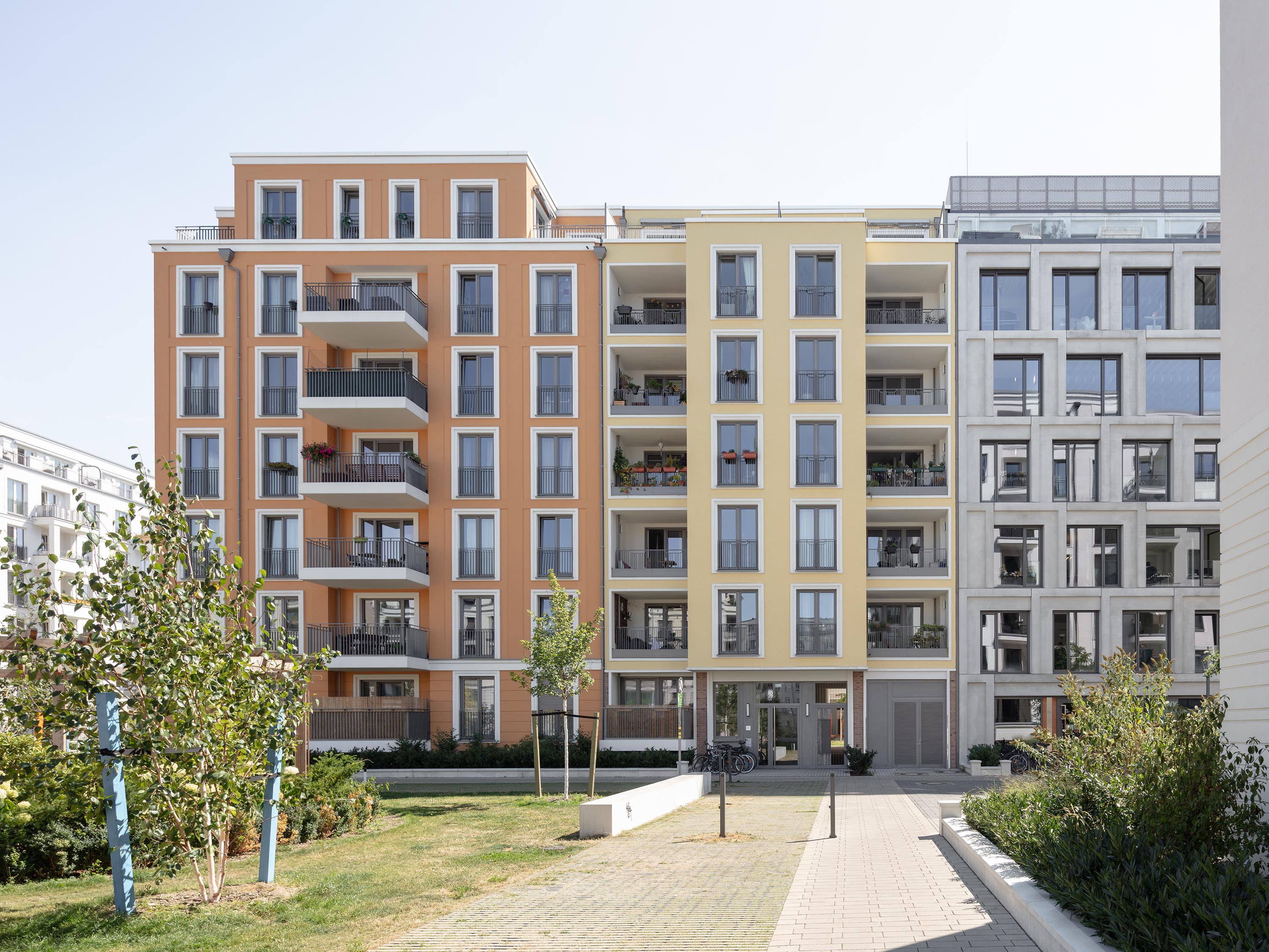 In comparison to the elaborately designed façade surfaces oriented towards the street and the city garden, the courtyard oriented façades are more restrained. There is also a gradation in the external façades of building block B: the office façade (BY) towards Boxhagener Strasse is expressive and striking, the colour-accentuated façades of the adjoining residential block BZ appear as background architecture in the structure.