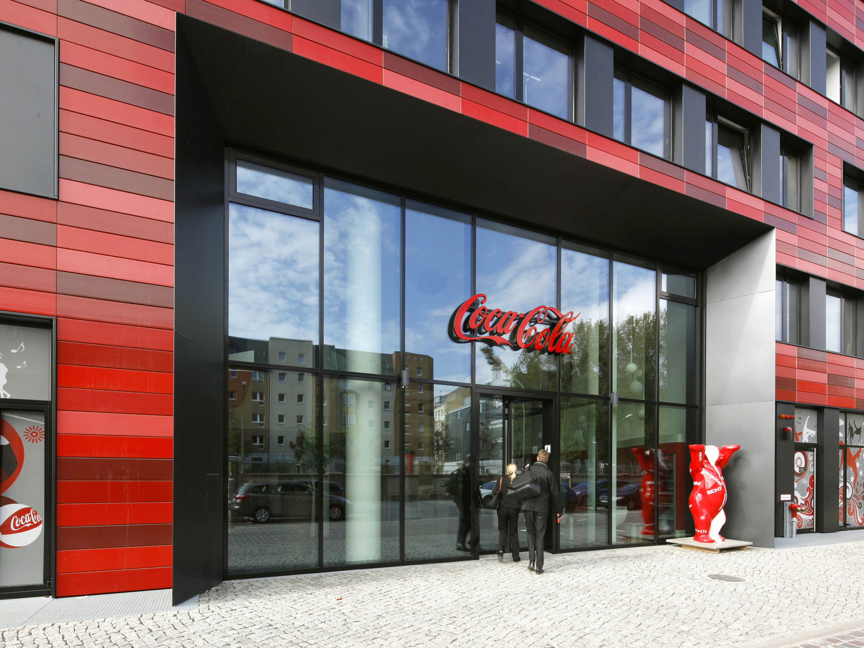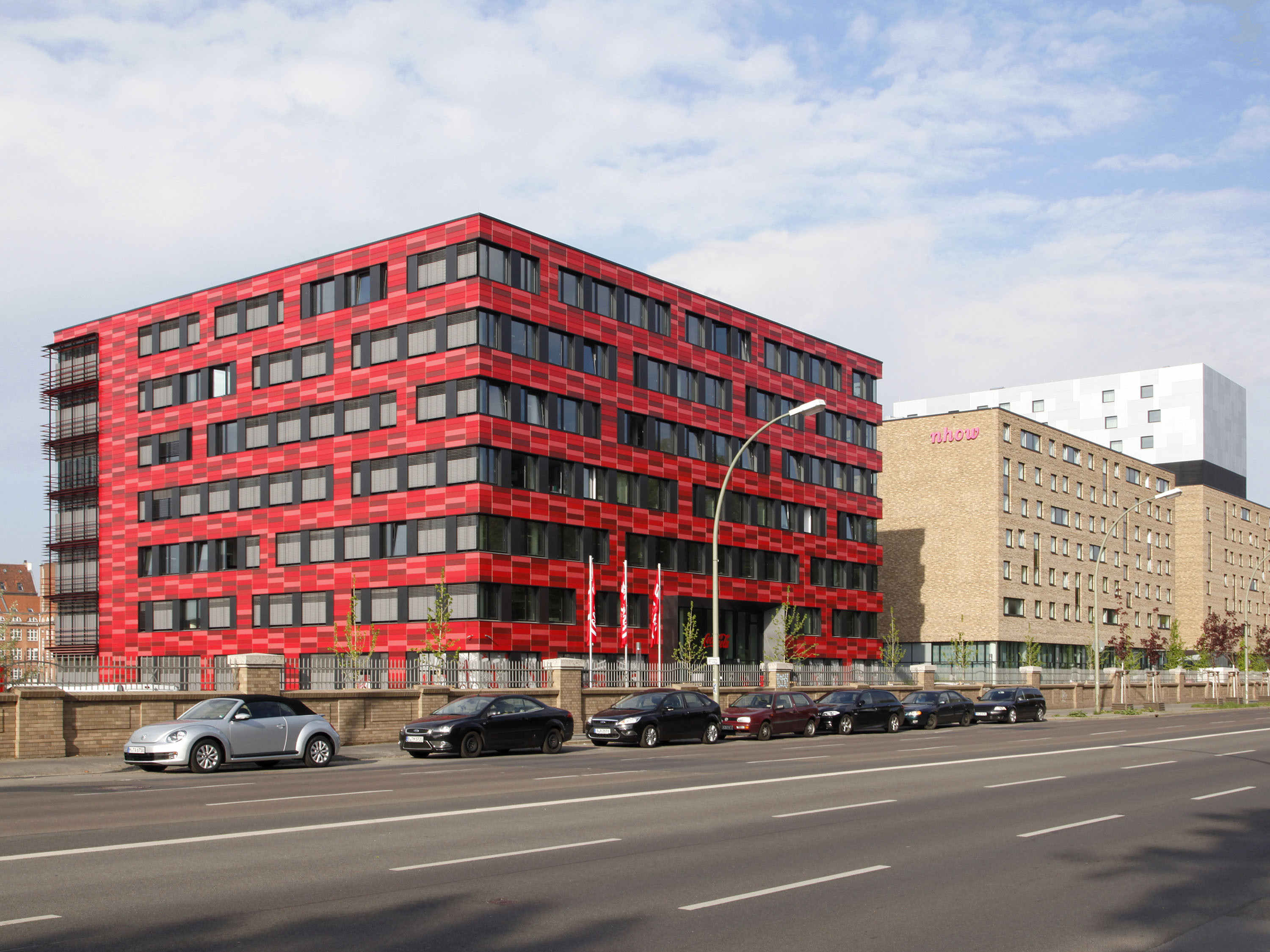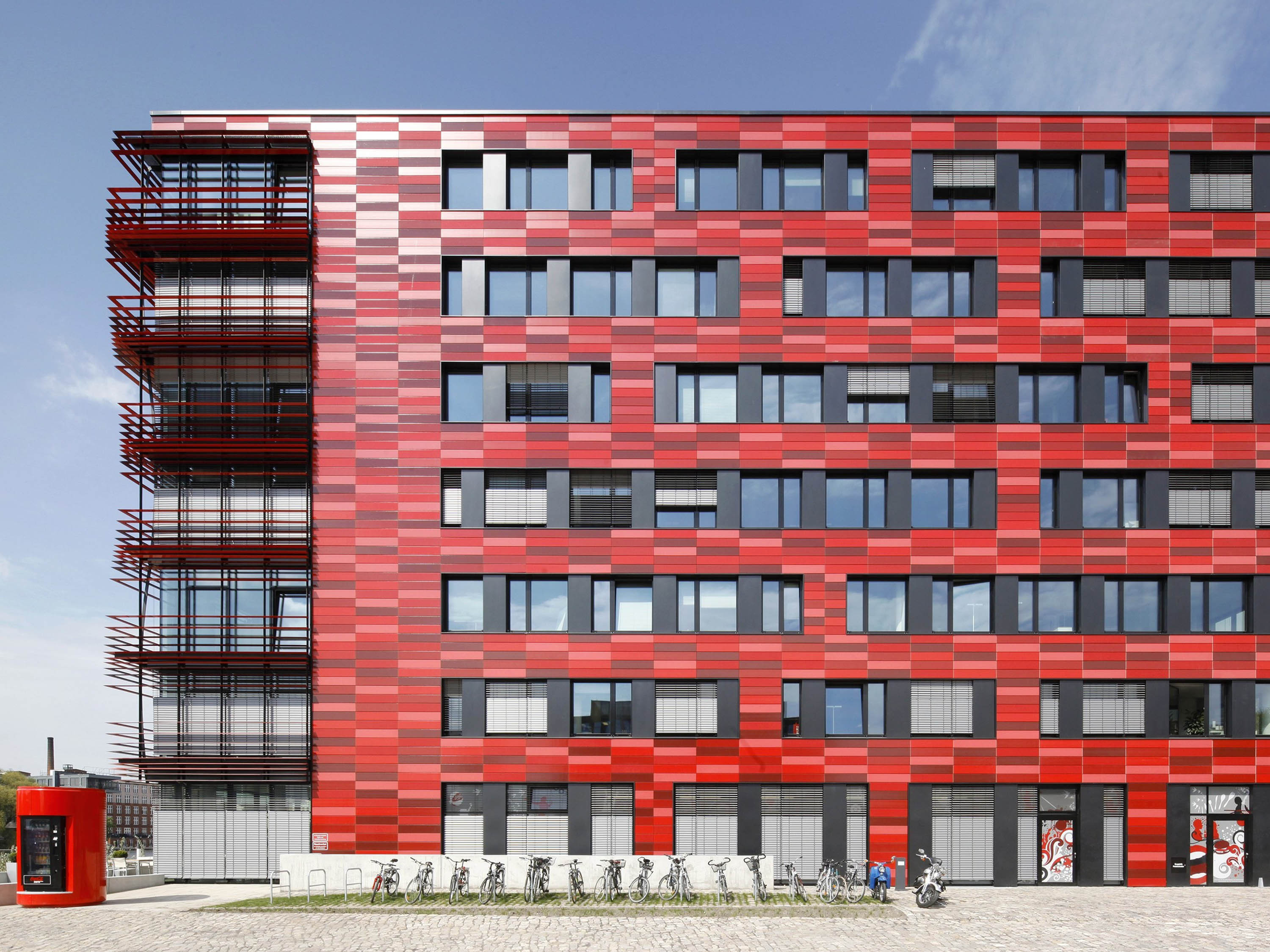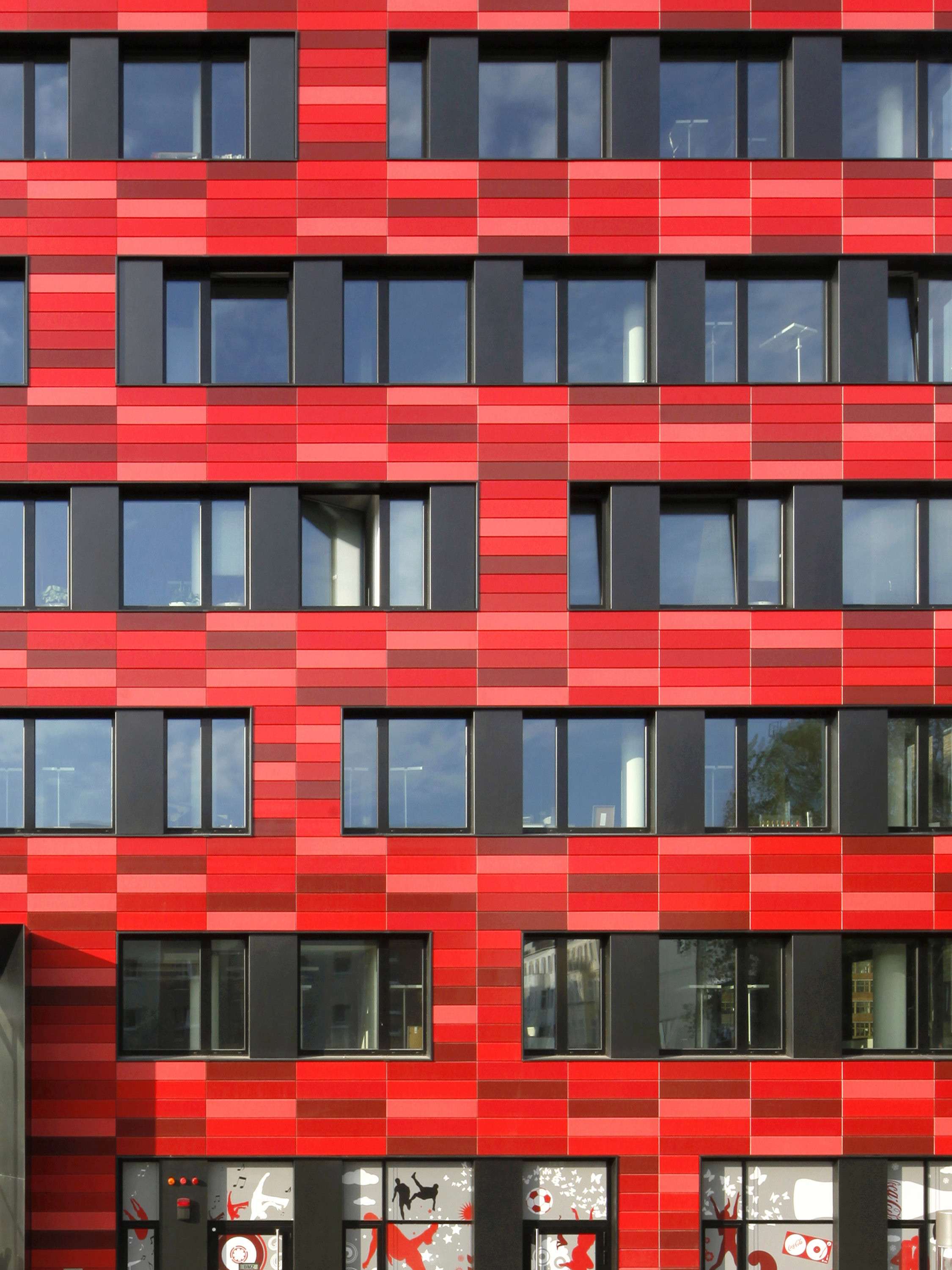 The other three façades are flat, divided into storeys by differently positioned window bands and clad with glazed ceramic elements in various shades of red.