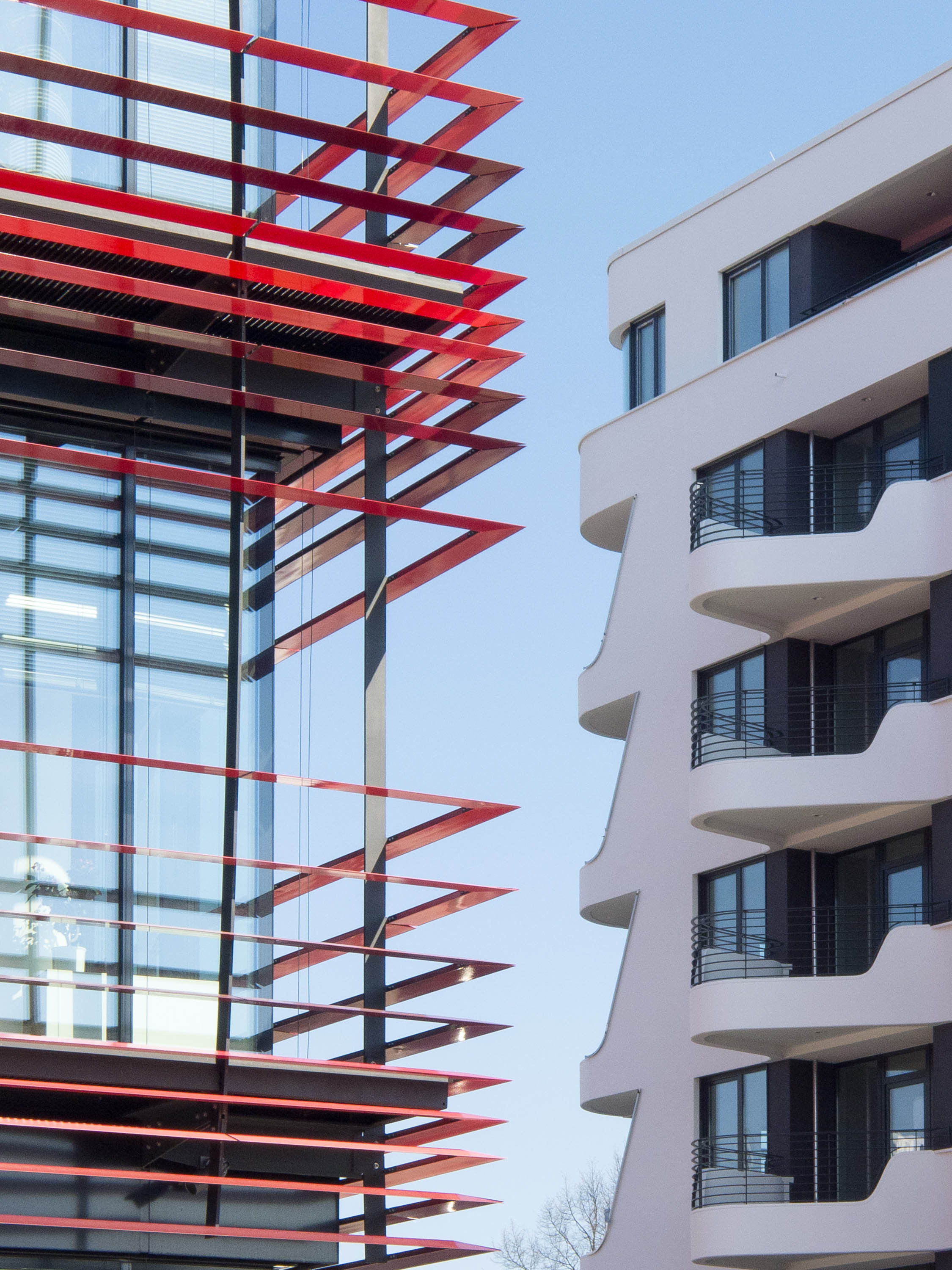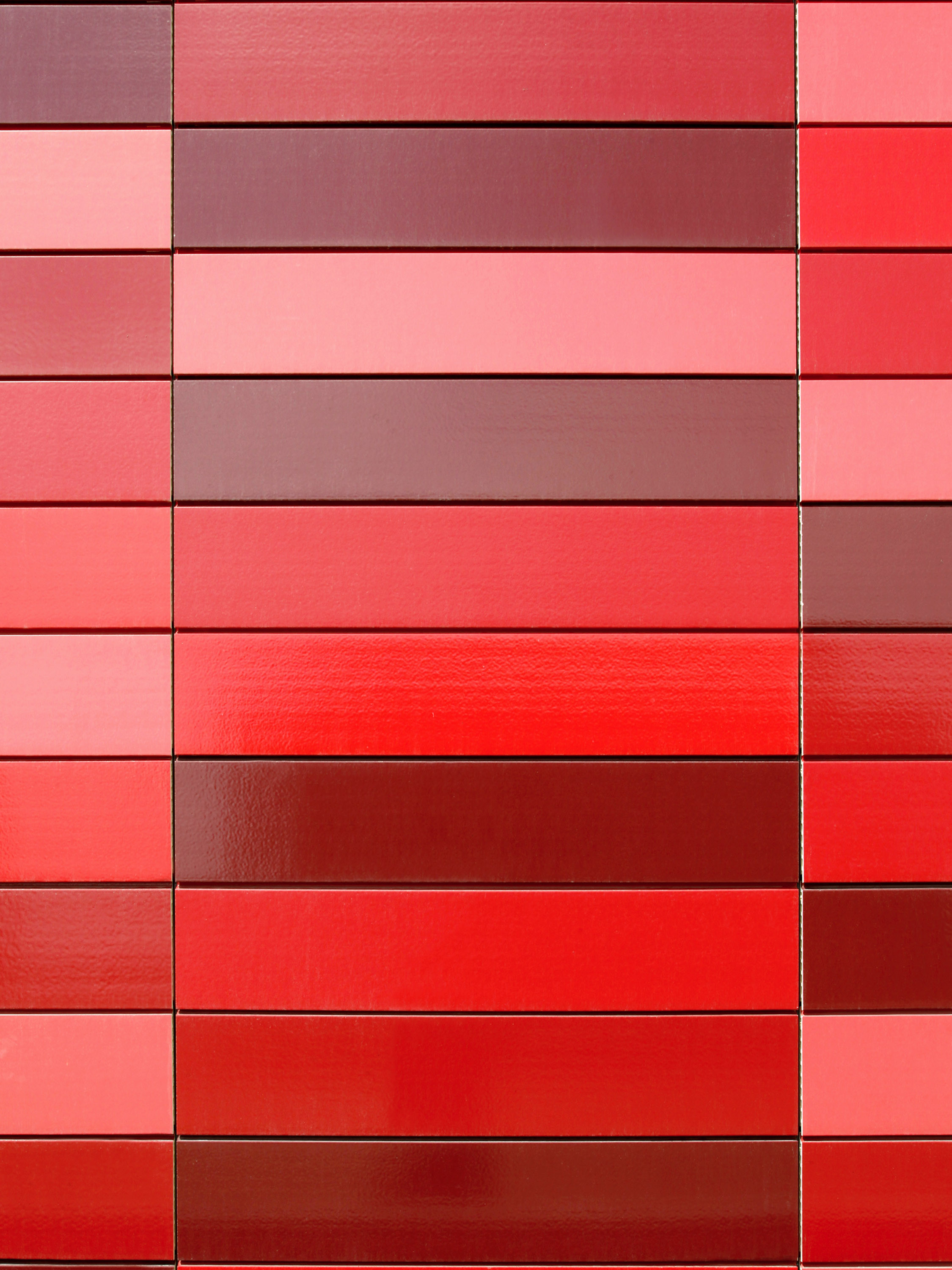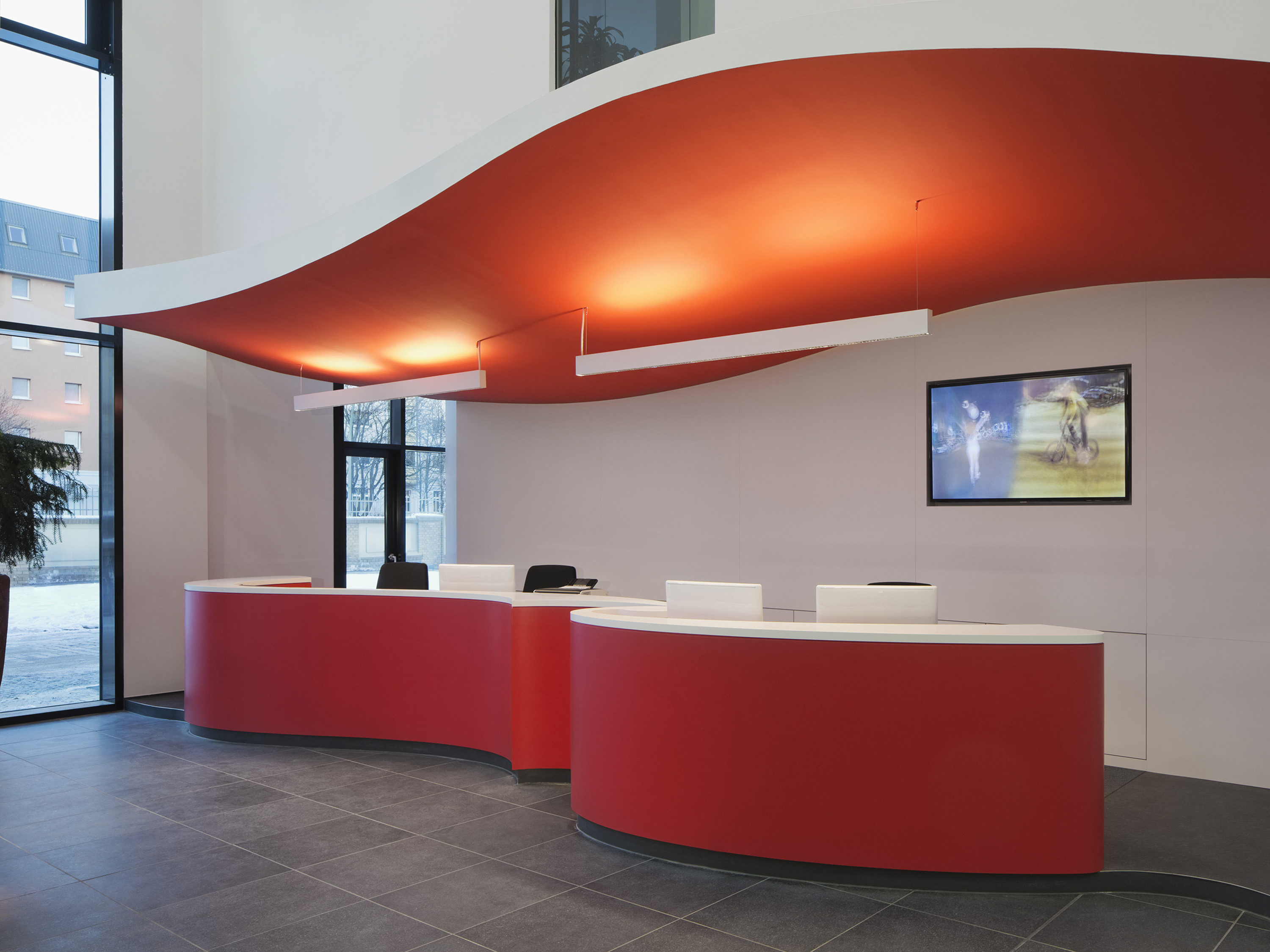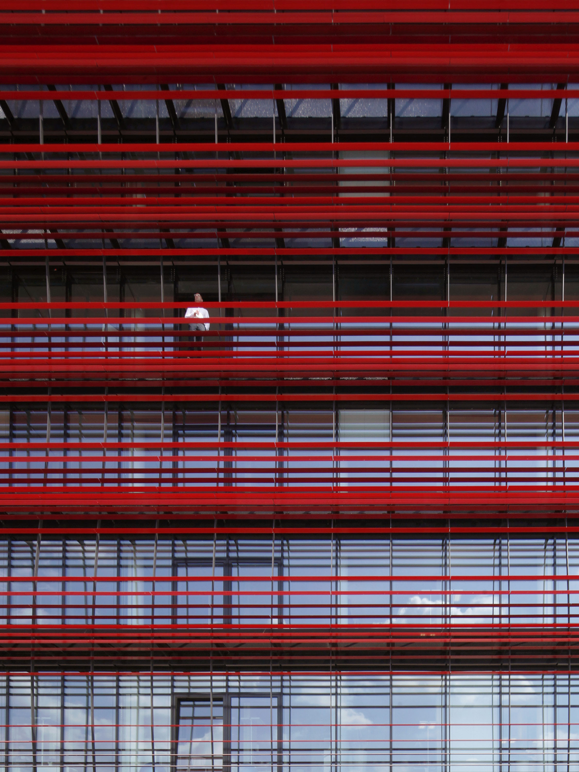 The other three façades are flat, divided into storeys by differently positioned window bands and clad with glazed ceramic elements in various shades of red.