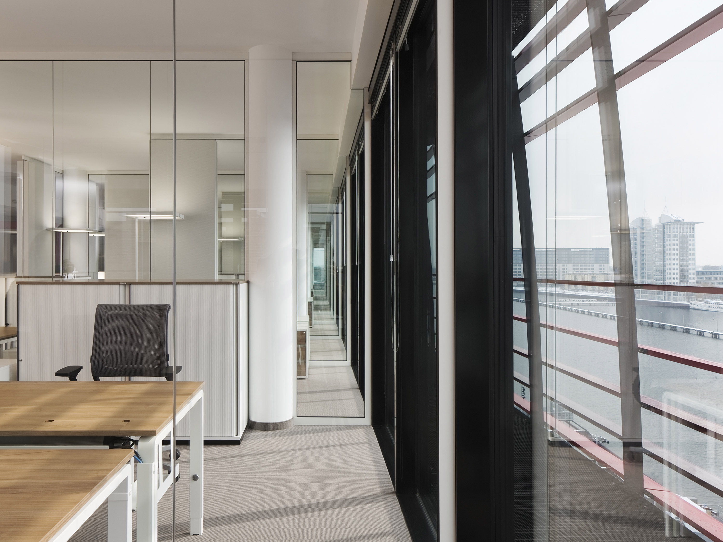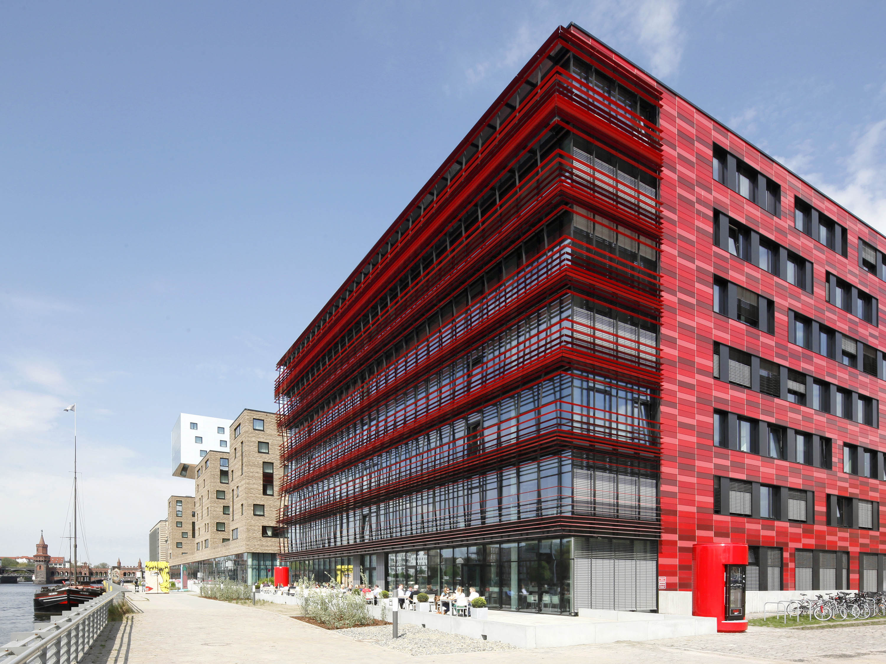 The shape of the building resembles a box with three similar façades and an open side facing the Spree. The southern façade facing the river is fully glazed; it is fronted by gallery-like balconies the full width of the building and covered with a building-high structure as rigid sun protection.