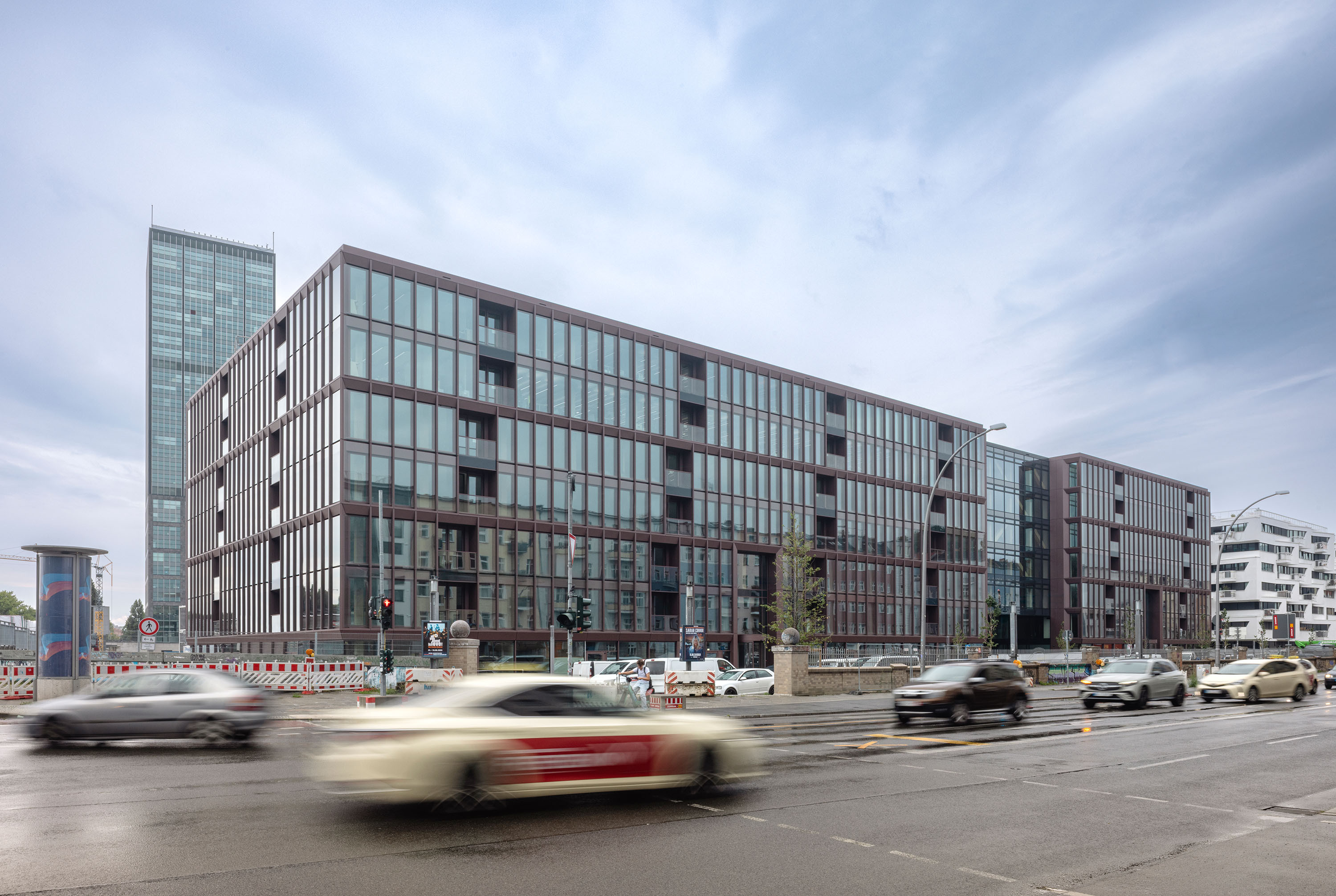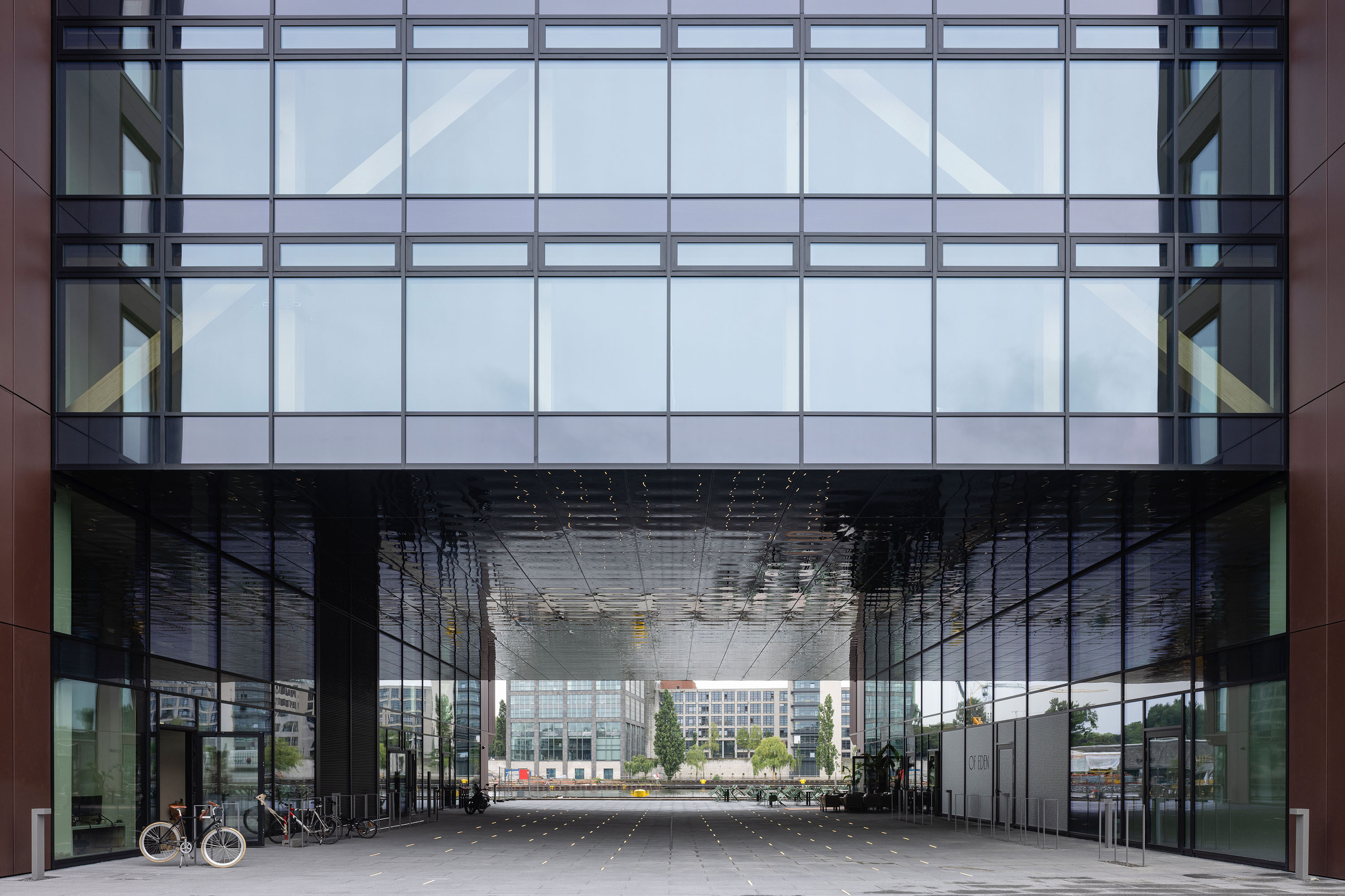The main façades from the first to the sixth floors are glass unitized façades with a two-storey grid of cornices and pilaster strips. The south façades overlooking the Spree are articulated by projecting bay windows that are offset every two floors and support balconies. The glass façades on the west, north, and east sides have partly recessed loggias, which are likewise offset every two floors.