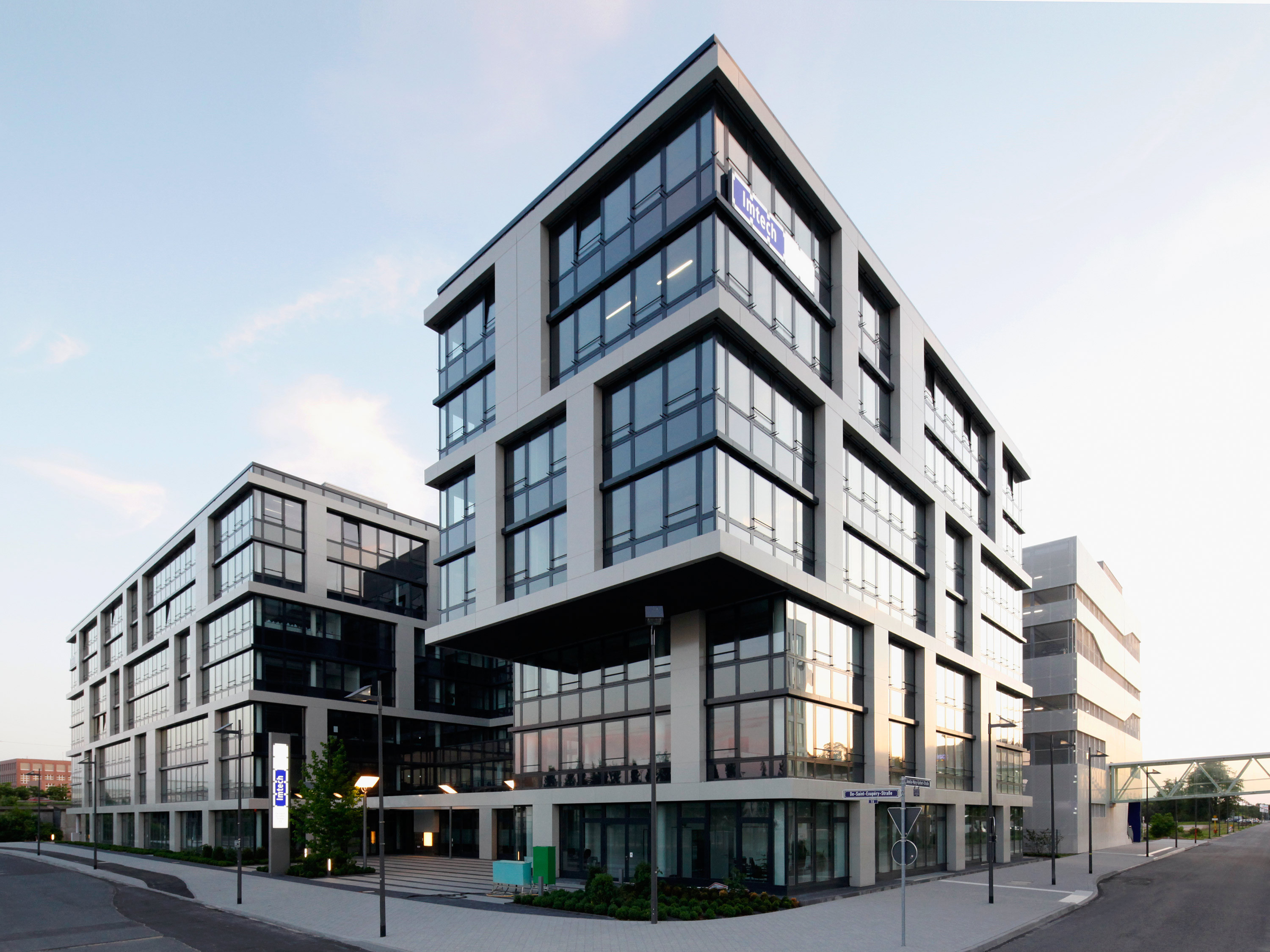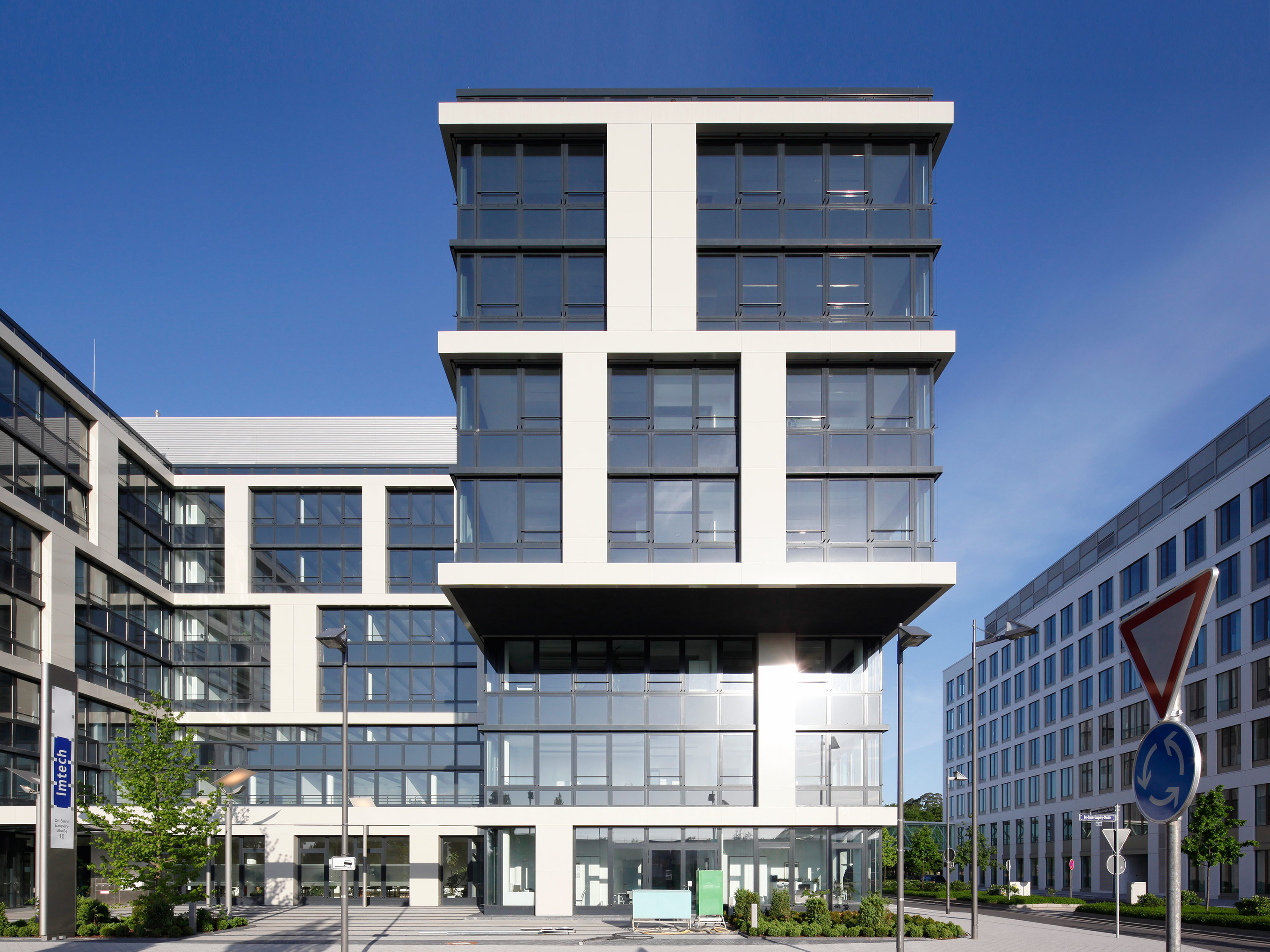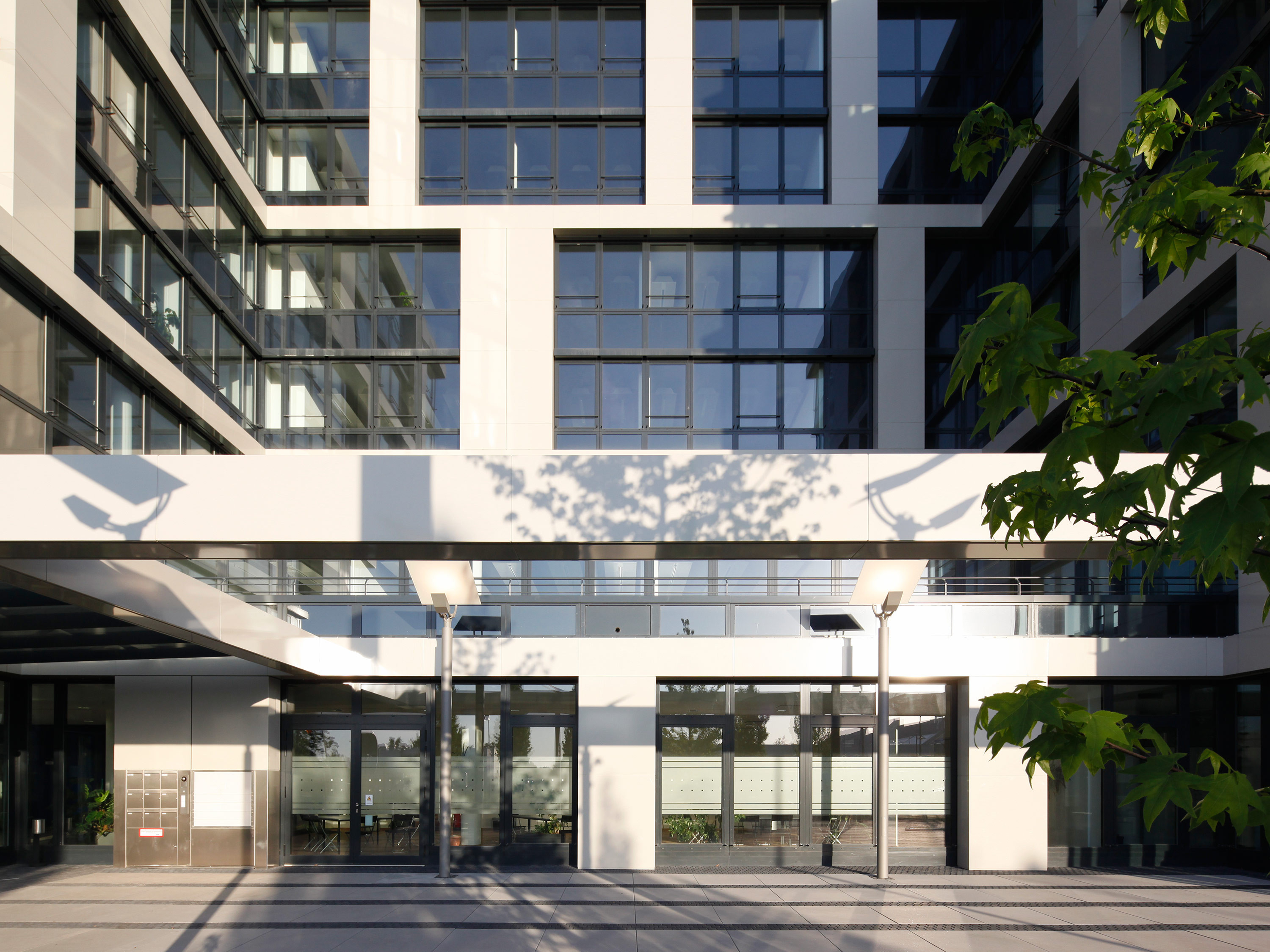 The basic shape of the building corresponds to an elongated block, from which two small courtyards enclosed on three sides are cut out alternately, creating an S-shaped floor plan. One courtyard faces the De-Saint-Exupery-Strasse and forms the main entrance to the building.