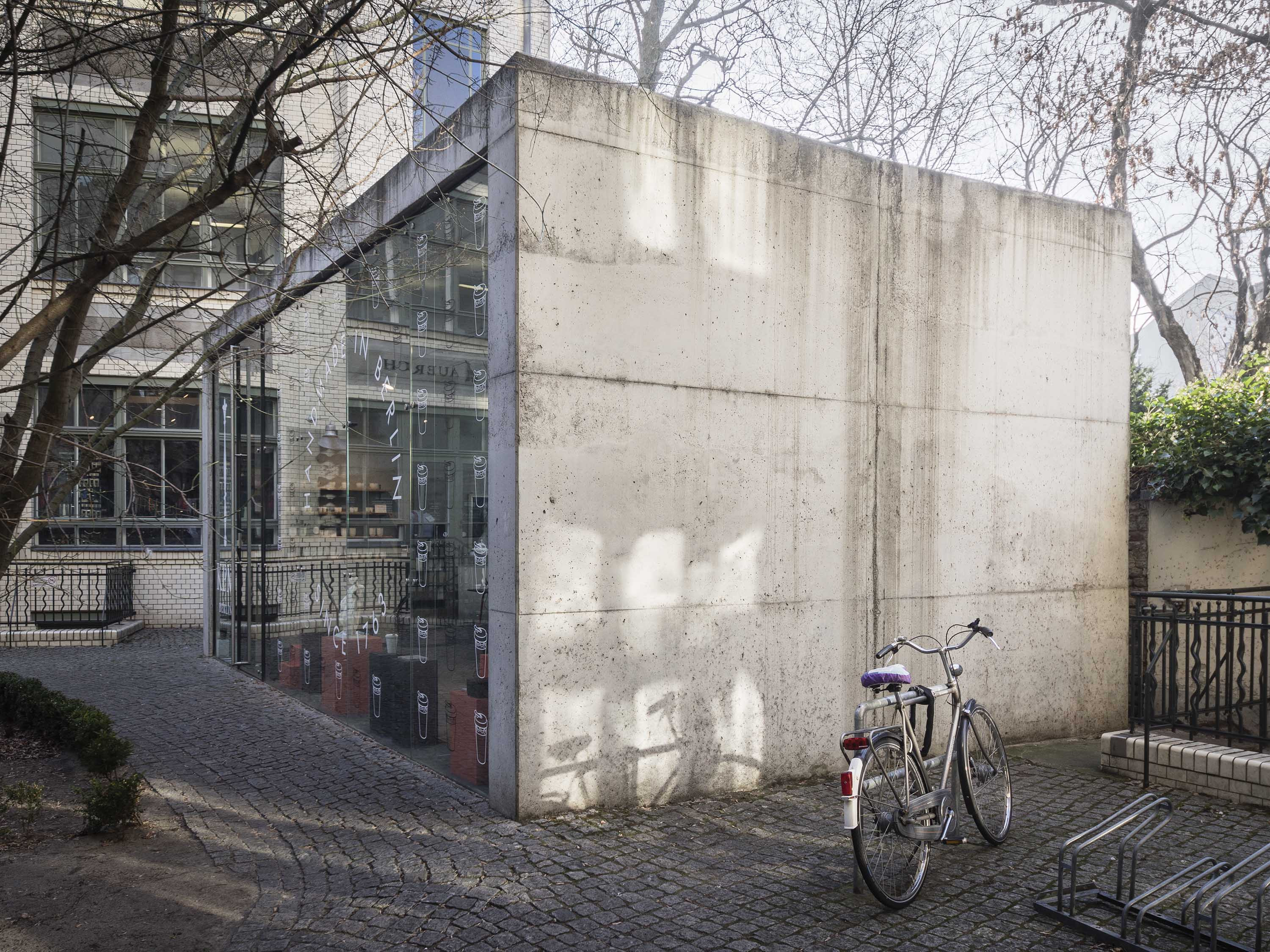 Just before the yard wall there is a monolithic stirrup made from exposed joint, laconically fanned out by panes of frameless security glass. A minimum crease within the massive side walls smoothly extend to the roof and gives an optical impression of tension. Additionally, it drains the surface area of the roof. All the various interior fixtures are one storey high and lend the small building a surprisingly presence.