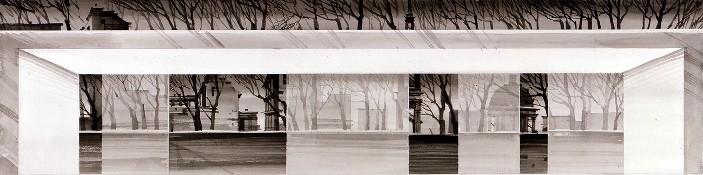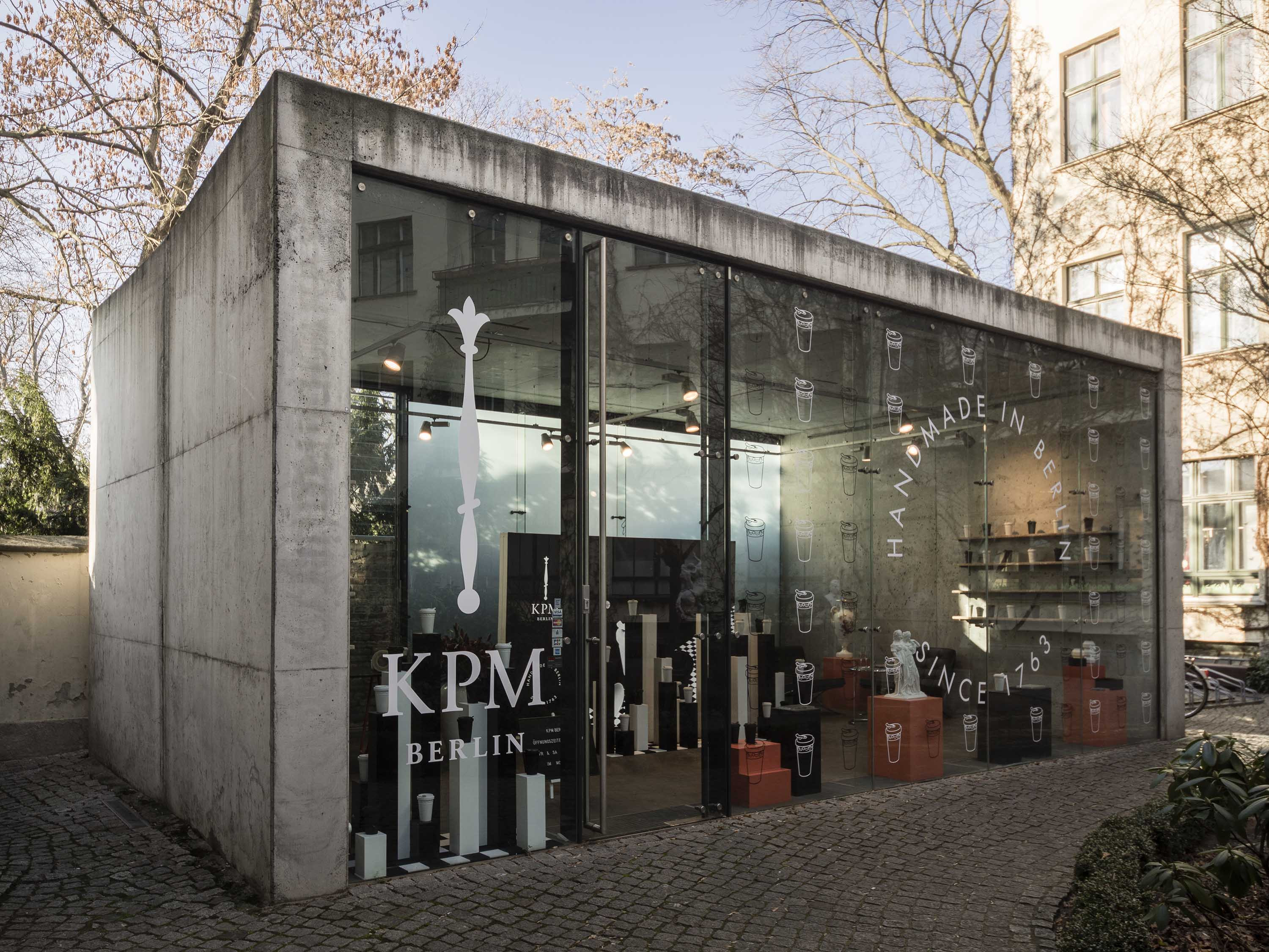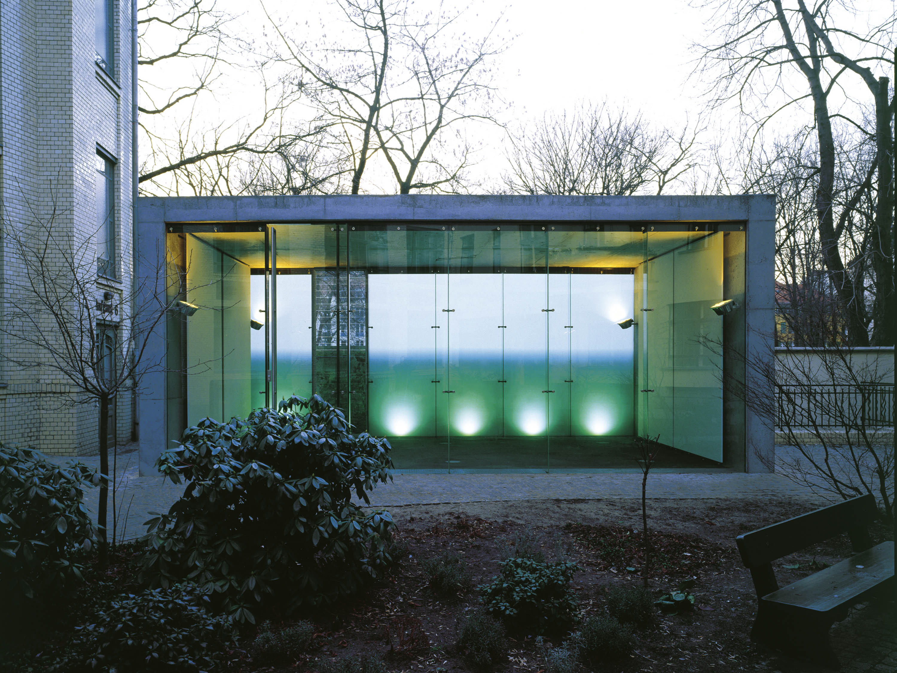 A crystal-clear glass section in the rear opal glass façade of the gallery is the frame of an old tree in the neighboring park. It is at the end of the path through the Hackeschen Hoefe and points to the outside world.