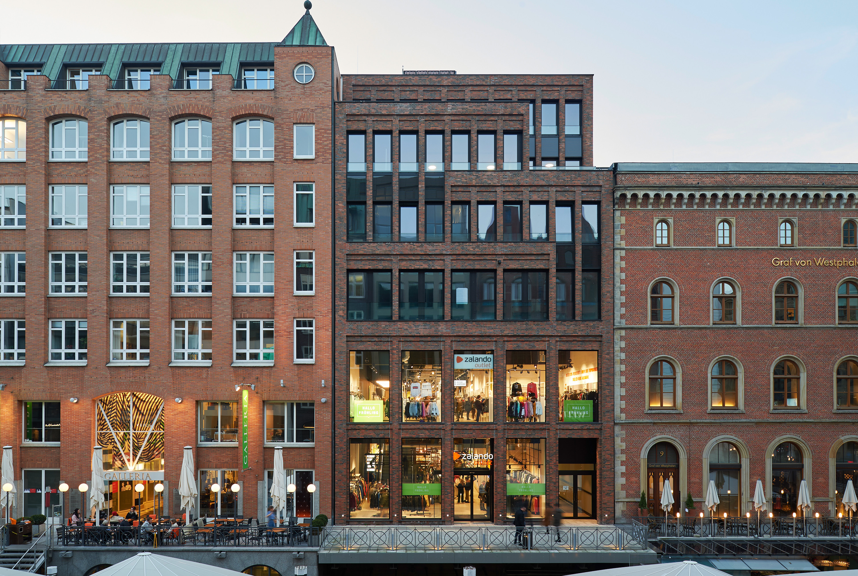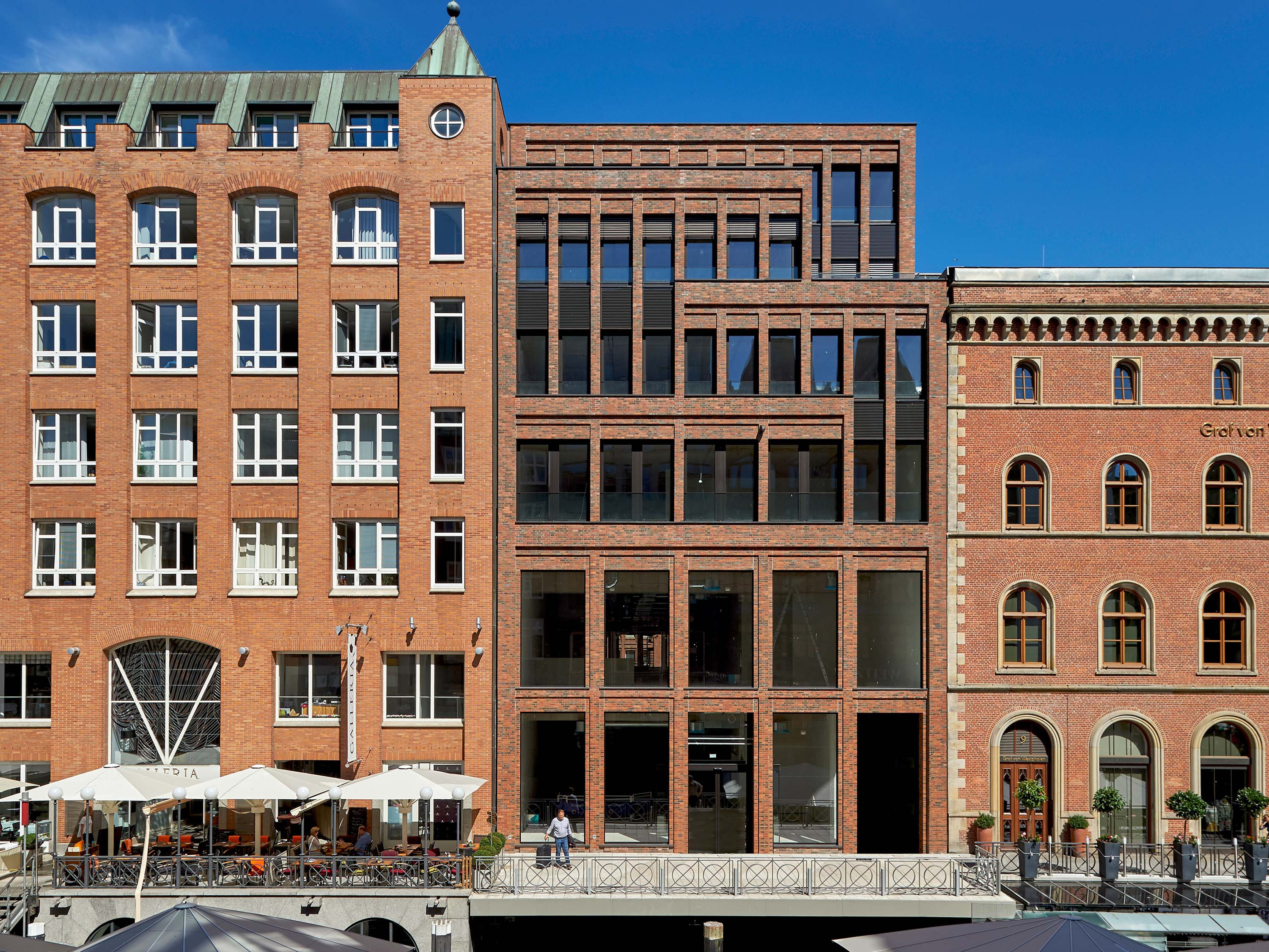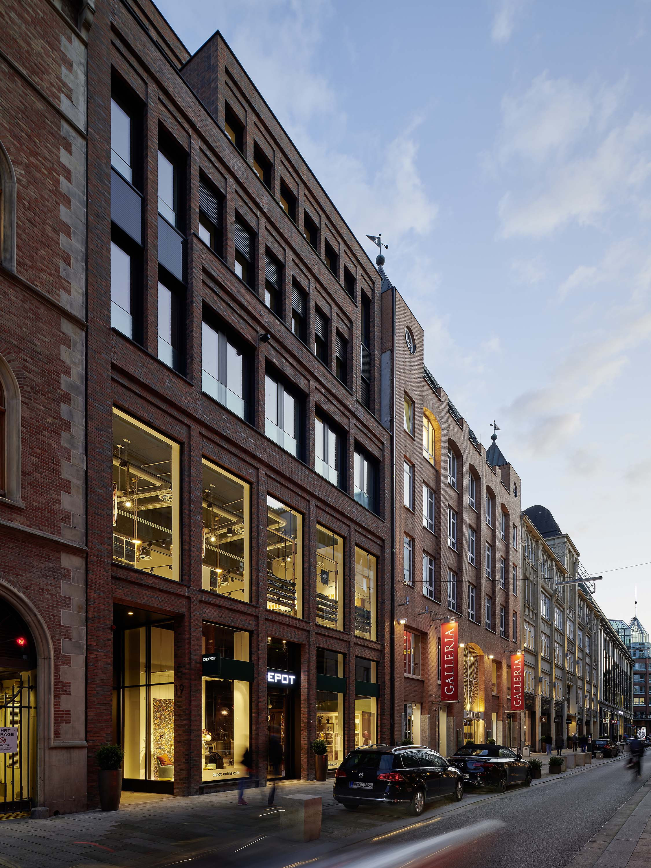 The rich architectural language of the surrounding area with its traditional brick buildings is reflected in the façades. Floor-to-ceiling windows with discreet anodized aluminium frames structure the surfaces. On the upper floors elegant glass balustrades are used as elements of French windows.