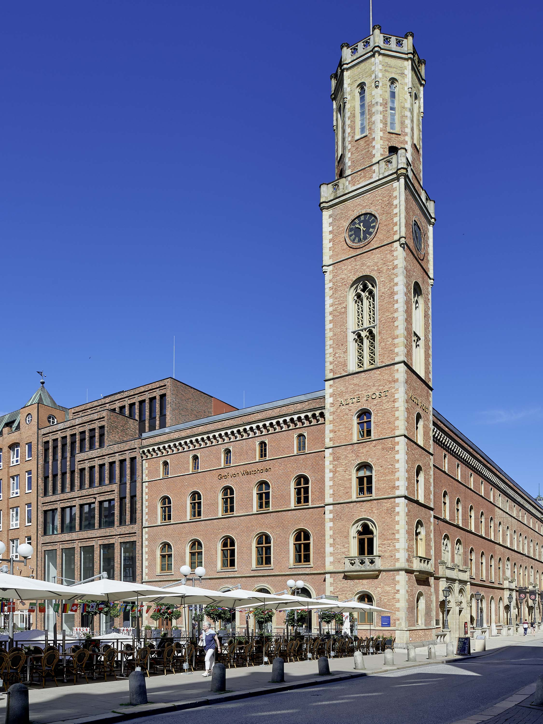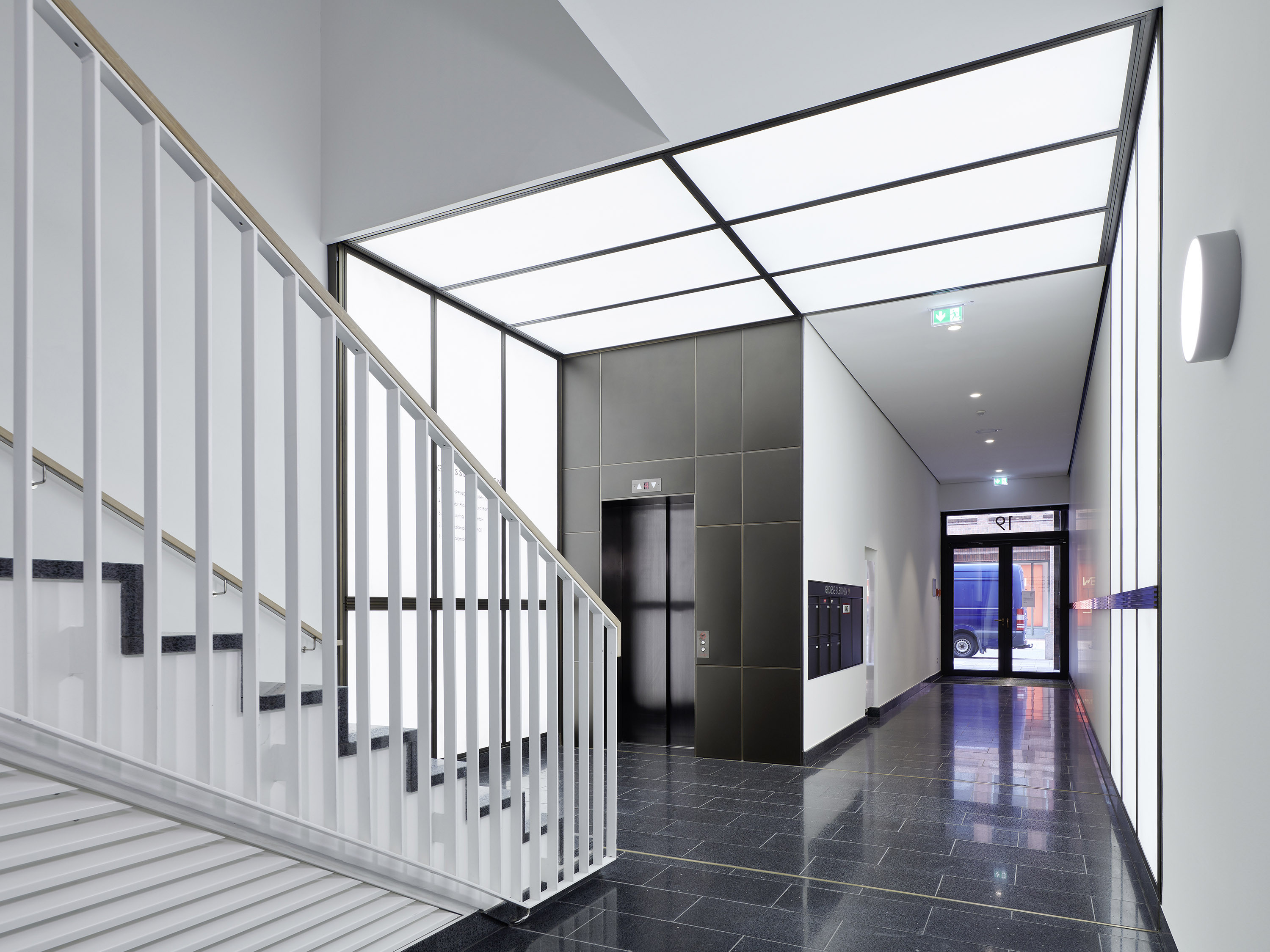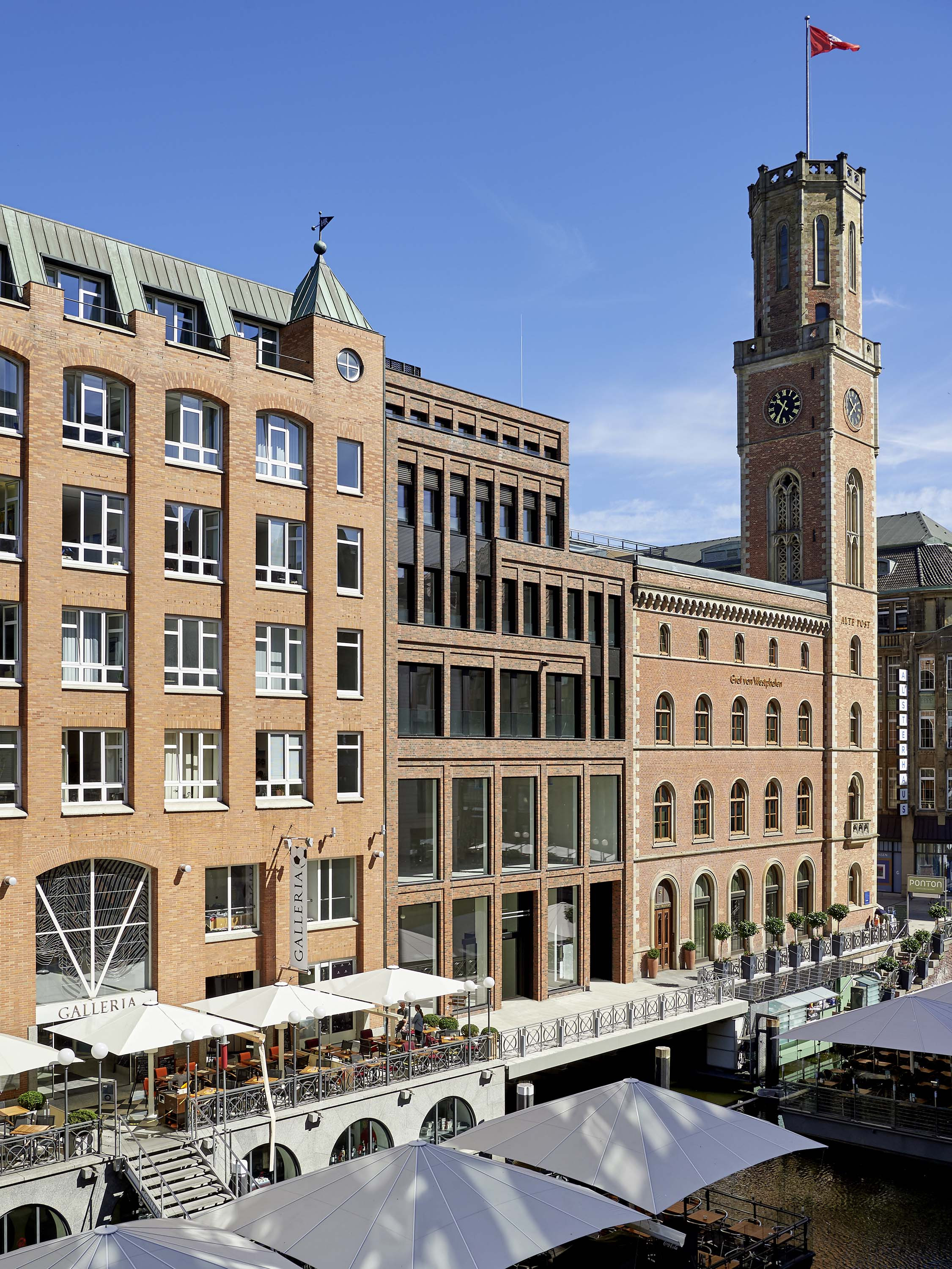 The rich architectural language of the surrounding area with its traditional brick buildings is reflected in the façades. Floor-to-ceiling windows with discreet anodized aluminium frames structure the surfaces. On the upper floors elegant glass balustrades are used as elements of French windows.