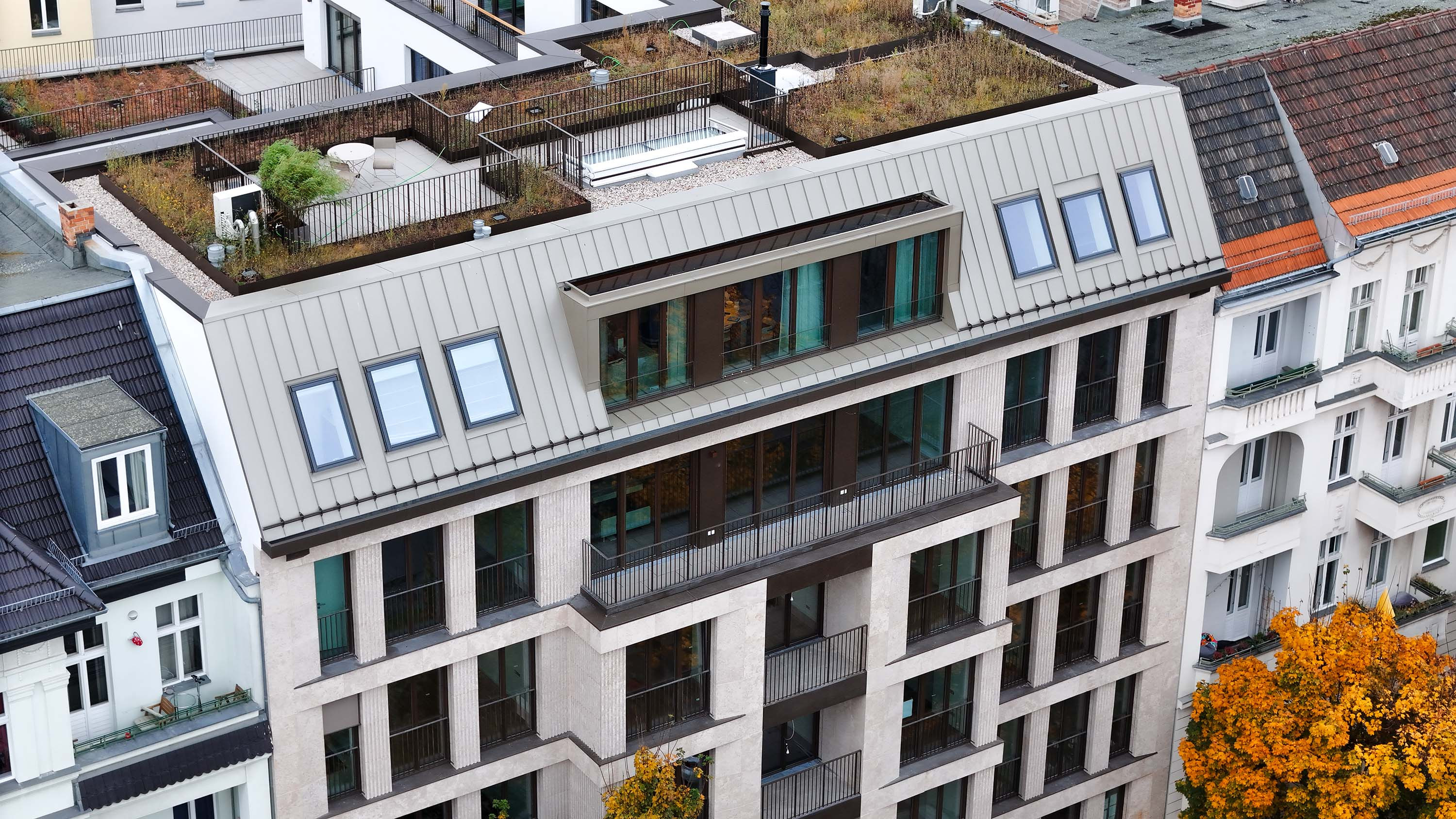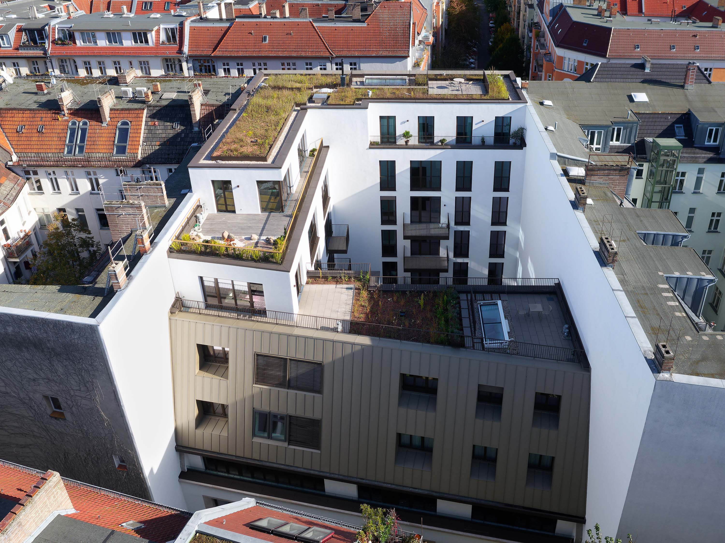 The U-shaped ensemble is conceptually based on the typical Berlin residential courtyard, consisting of a front building, side wings and a garden house, which enclose a green inner courtyard.