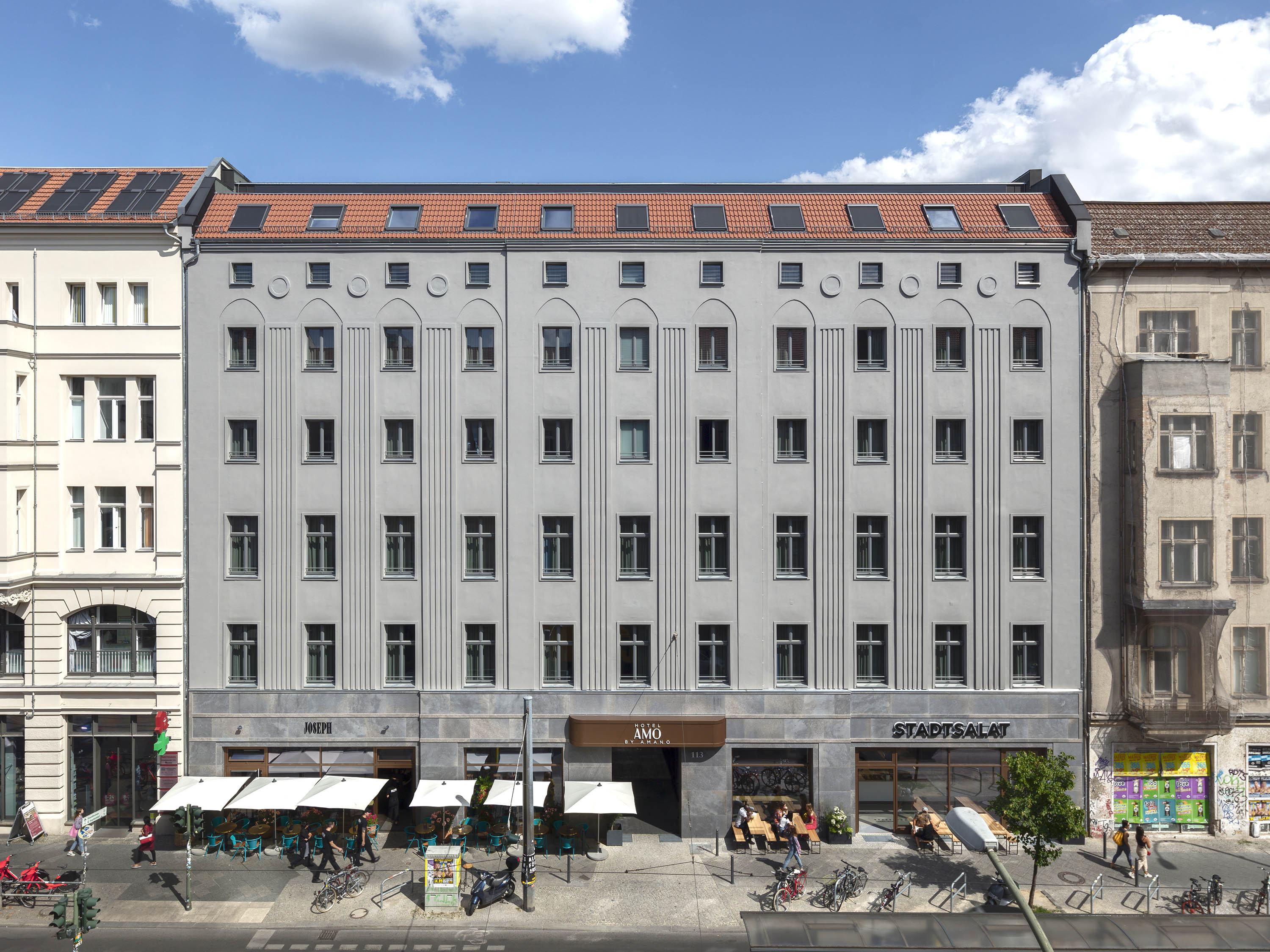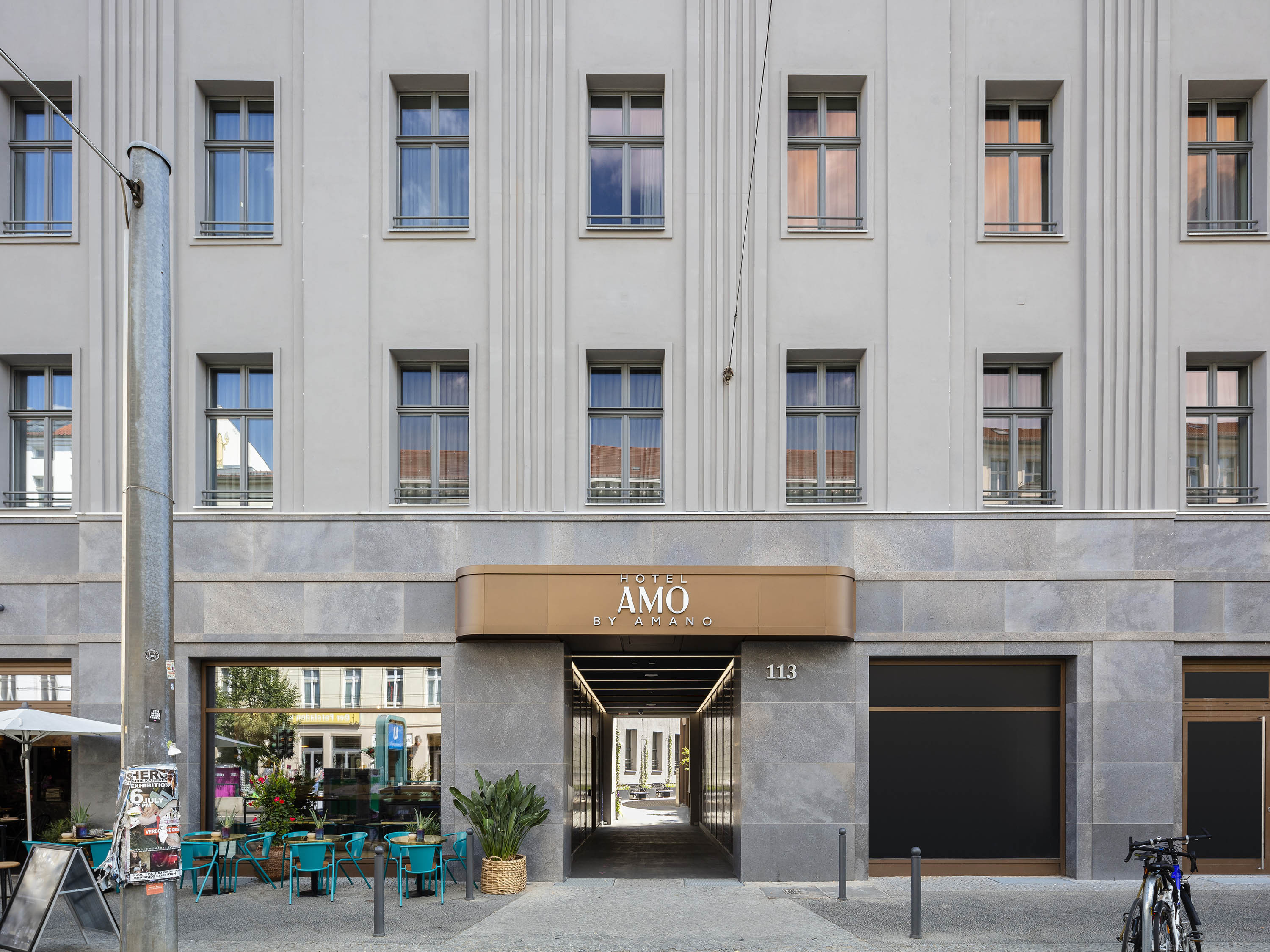 The five-storey volume with attic storey has a basement. The front building and side wings form a typical Berlin courtyard. In the upper floors and the ground floor 93 hotel rooms were built. Gastronomy and commercial units were planned in the ground floor of the front building.