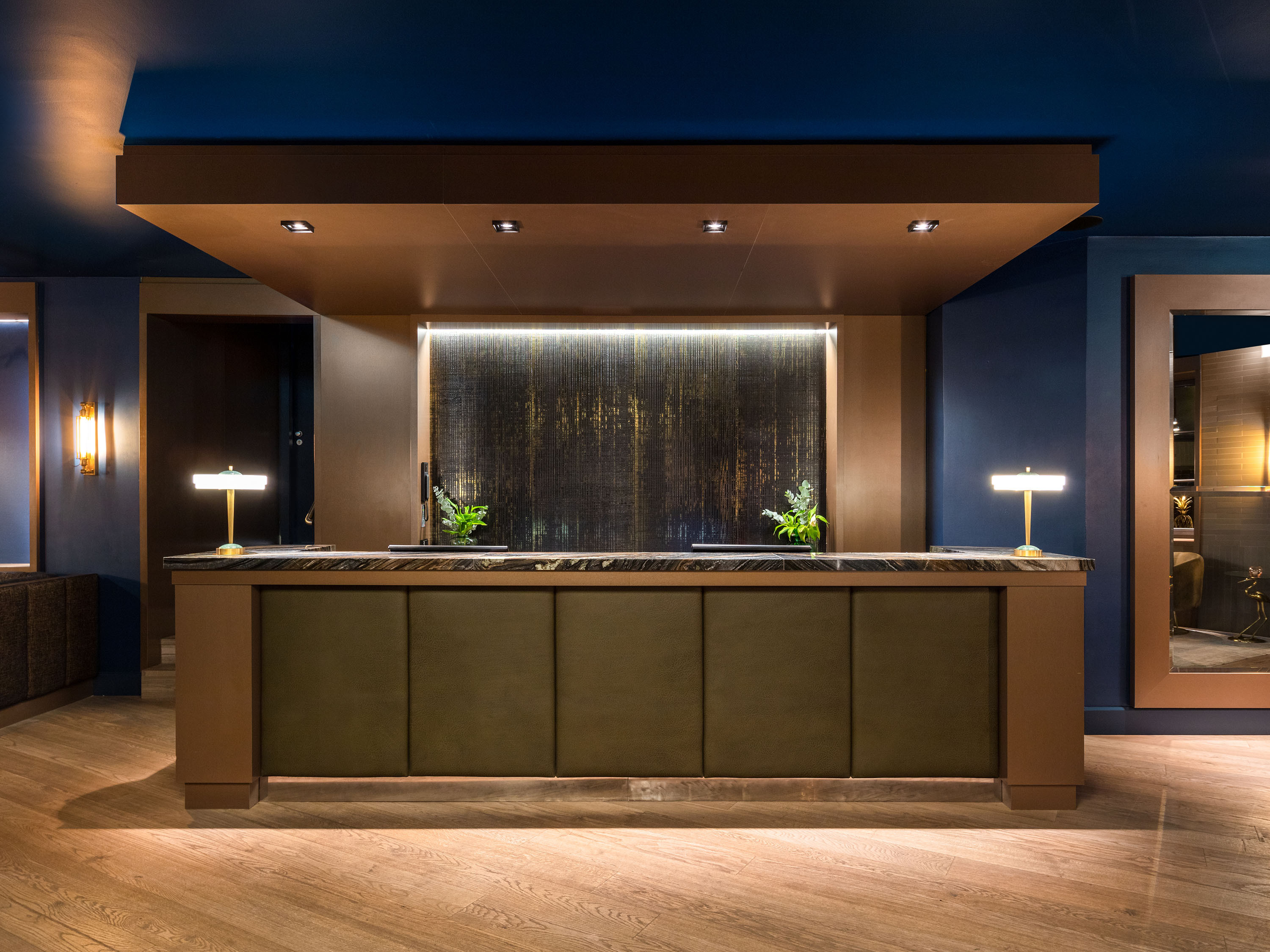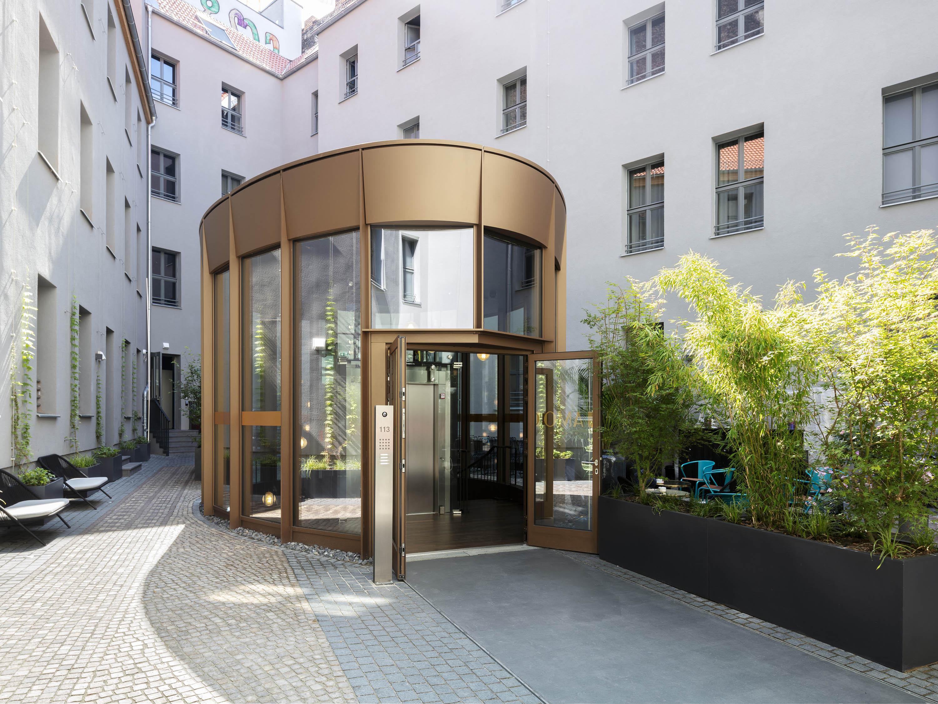 Access to the hotel lobby is from Friedrichstrasse via the courtyard entrance and the newly constructed, fully glazed bronze-coloured pavilion. The reception area, the breakfast area and the hotel bar are located in the basement.