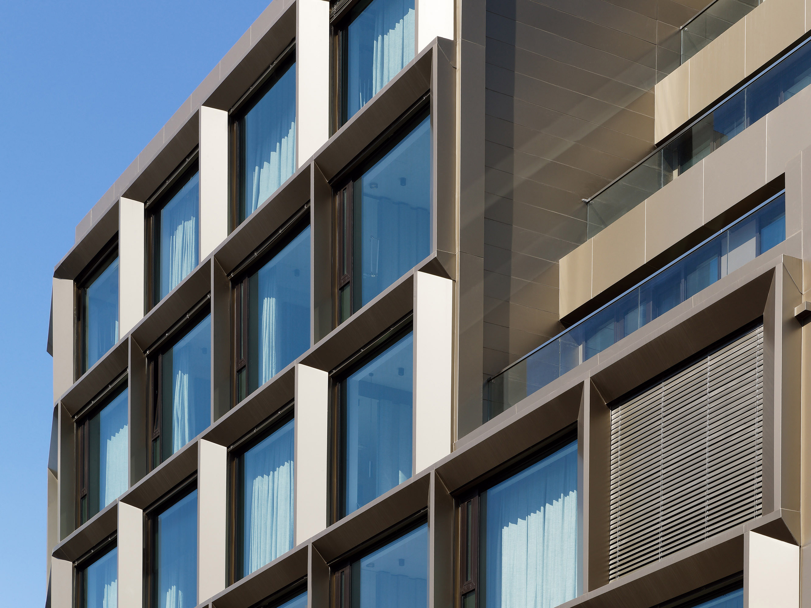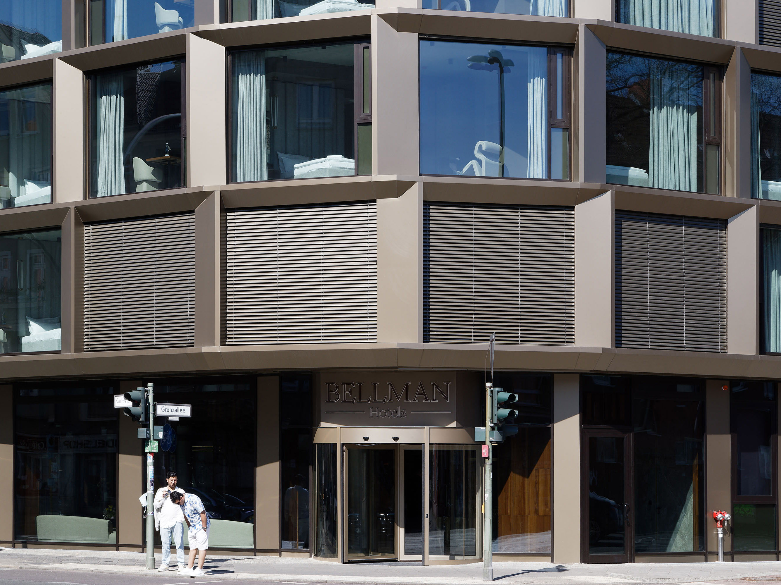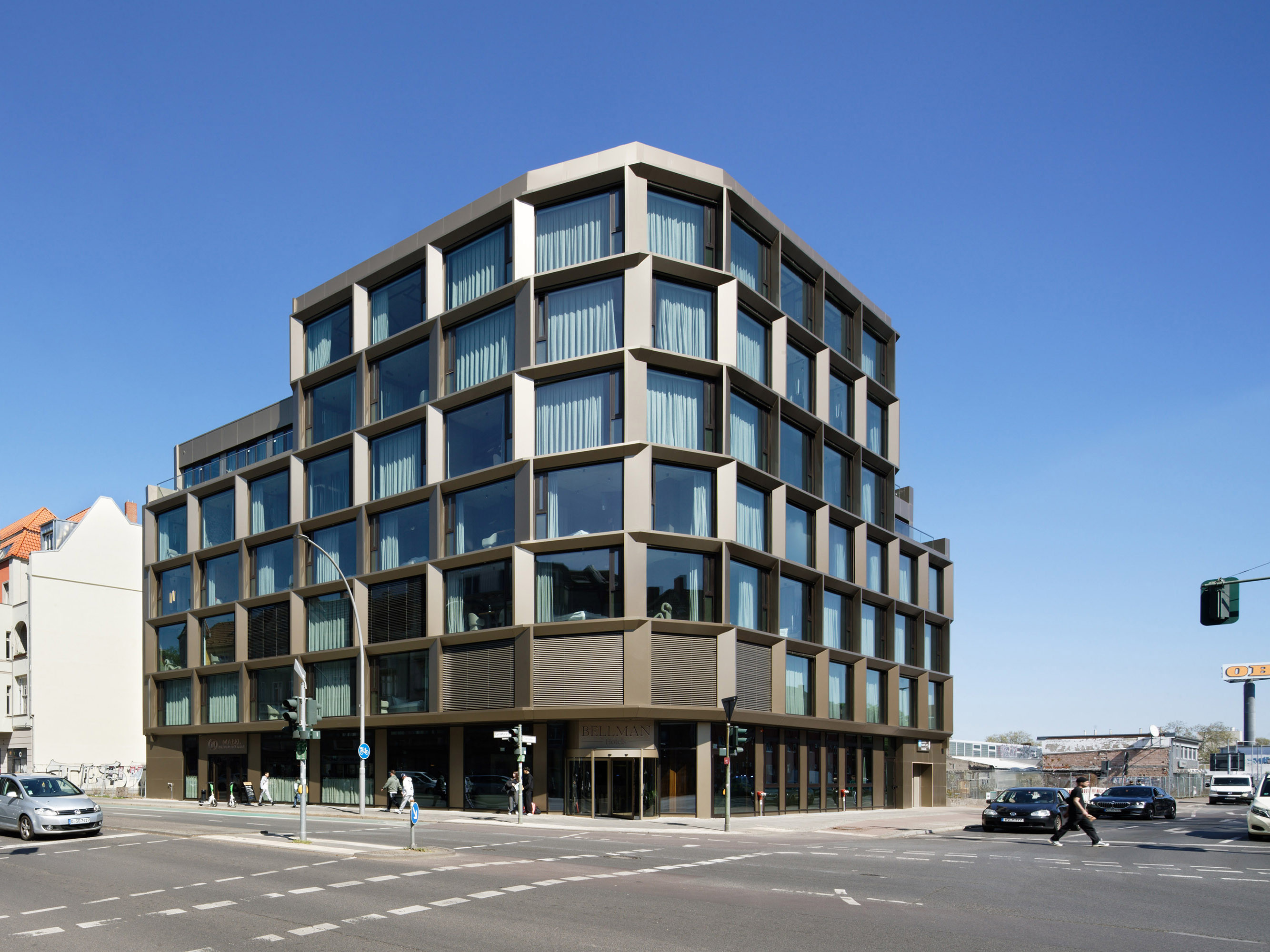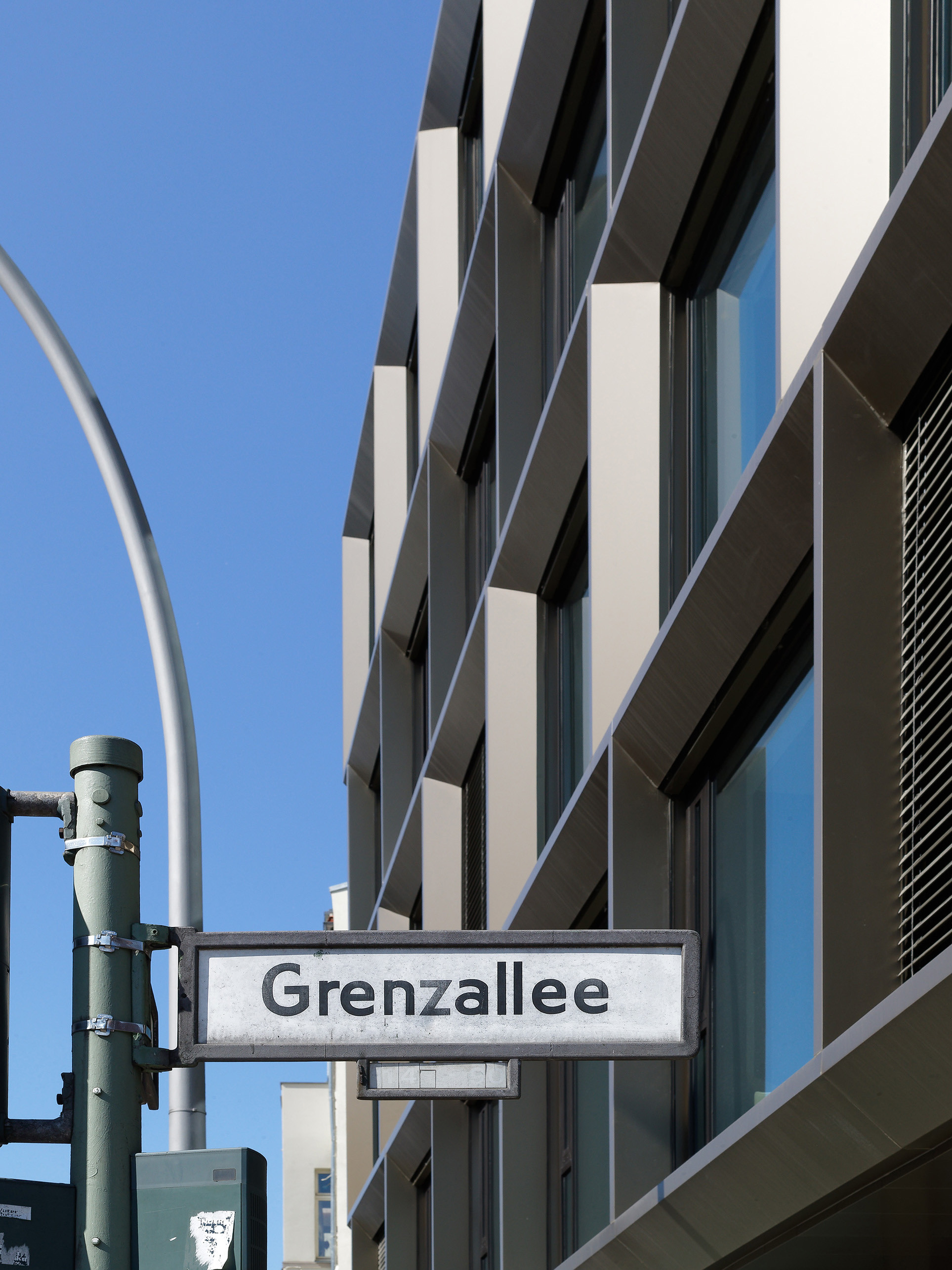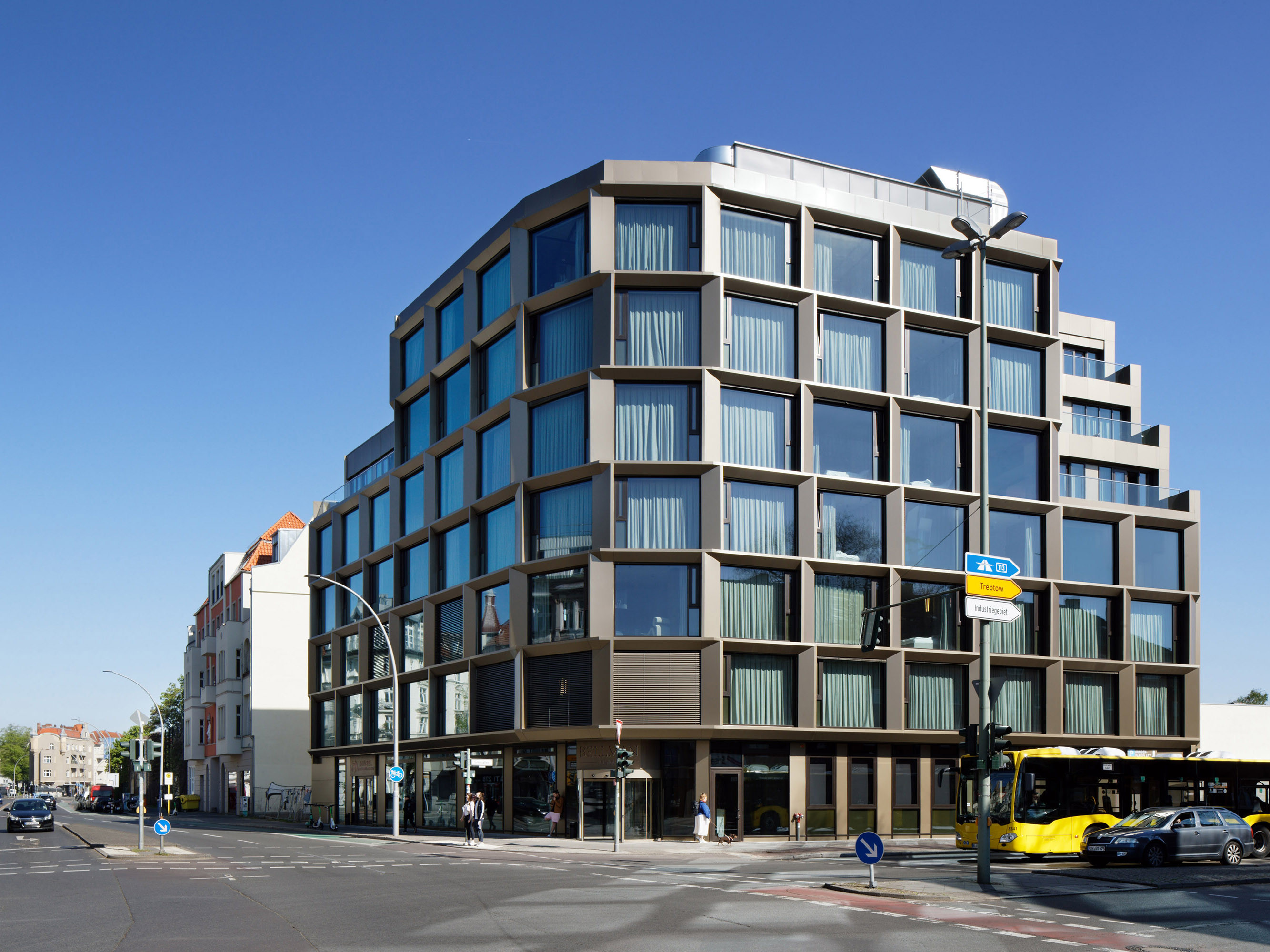 Inspired by the raw energy of New York's Meatpacking District, the bronze-coloured aluminium and glass façade makes an architectural statement in Berlin-Neukoelln.