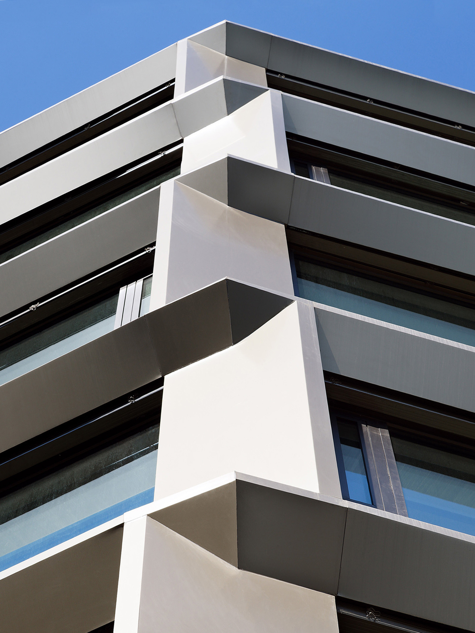 The storey-by-storey change in direction of the reveals of the curtain wall metal façade creates an exciting rhythm depending on the incidence of light and also ensures an unmistakable dynamic.
