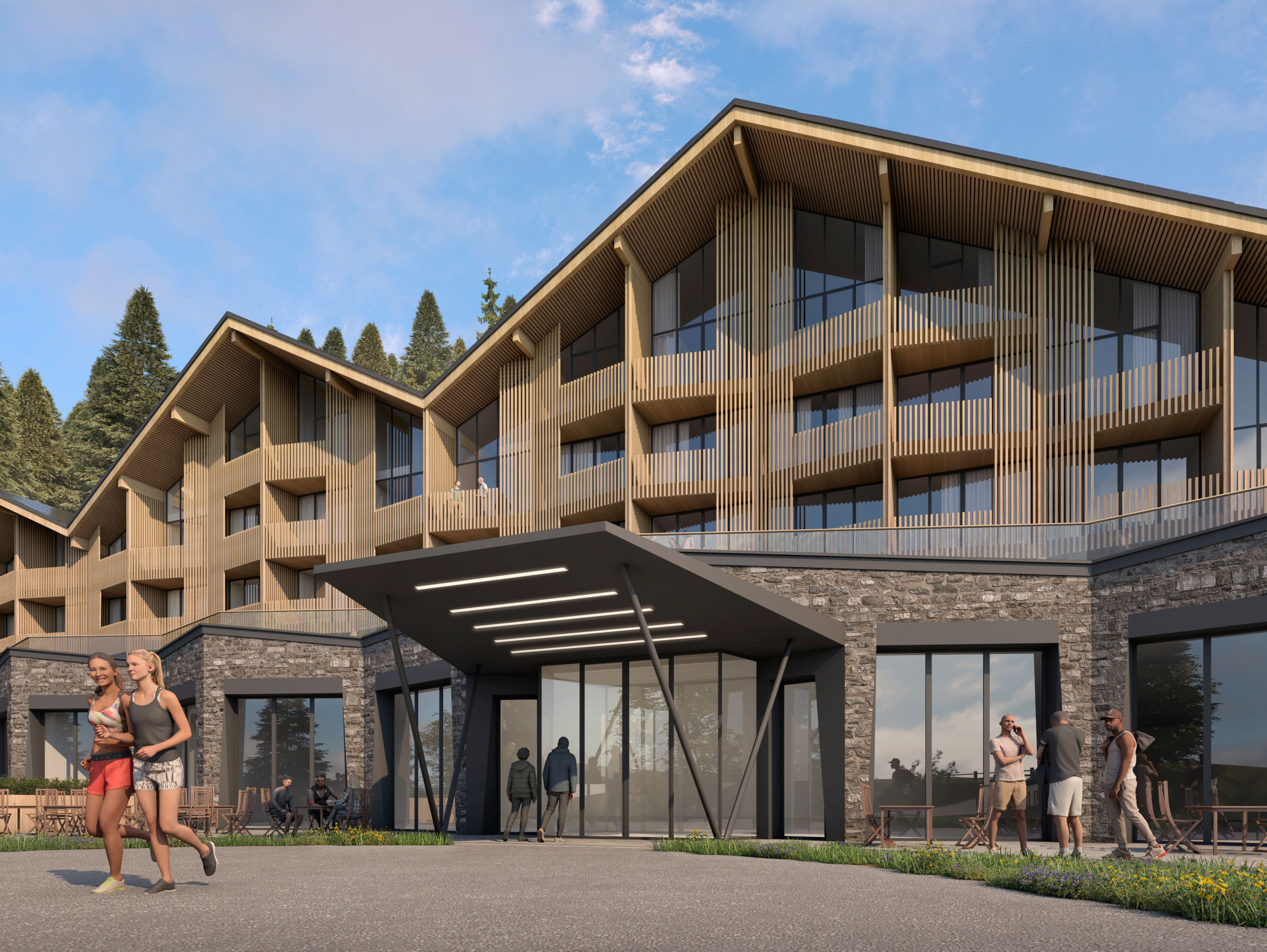The roof surfaces as well as the plinth façades of the first basement level will be clad with natural stone shingles. The first basement level will accommodate guest rooms, a spa, the pool area and the hotel’s back-of-house facilities. The pool area is oriented towards the exterior and includes a partially outdoor swimming pool and a terrace. A second basement level will house an underground car park with approximately 82 parking spaces.
