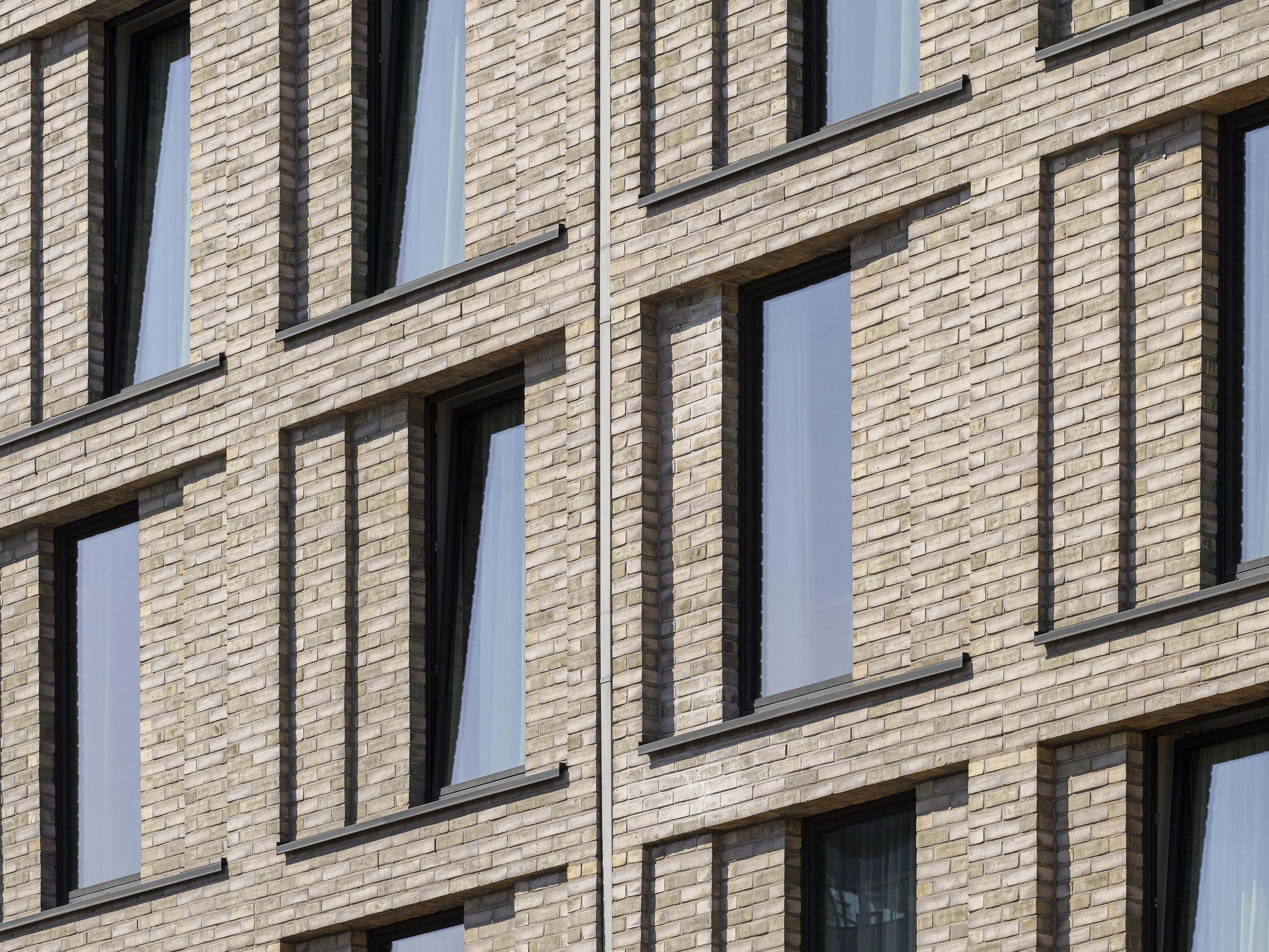 Clinker bricks were used in an iridescent beige-grey colour palette to clad the external façades. They only differ from each other in a subtle way in terms of their structure. Clear and strictly gridded, a slight movement in the façade tectonics becomes clear at second glance, with the main accent falling on the design of the floor-to-ceiling windows.
