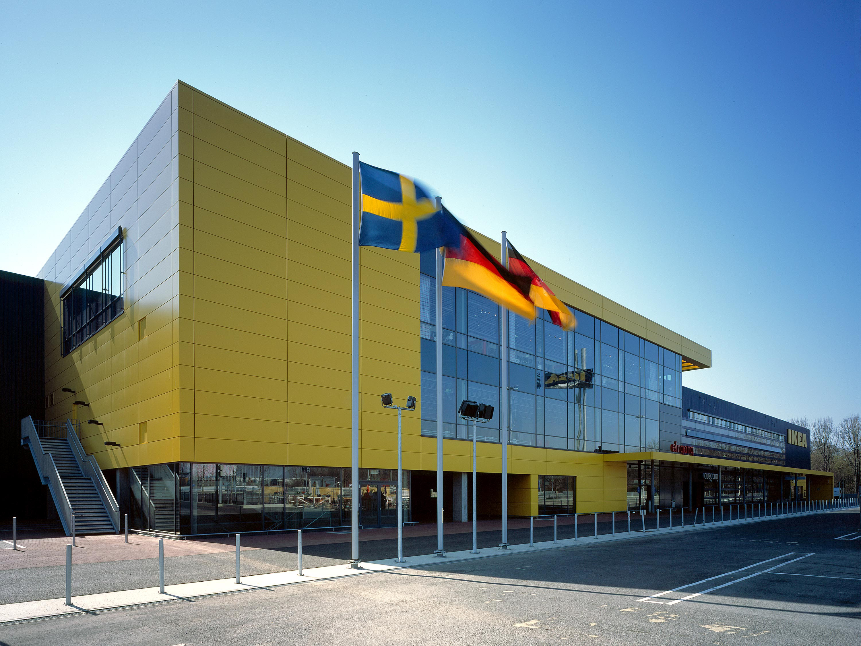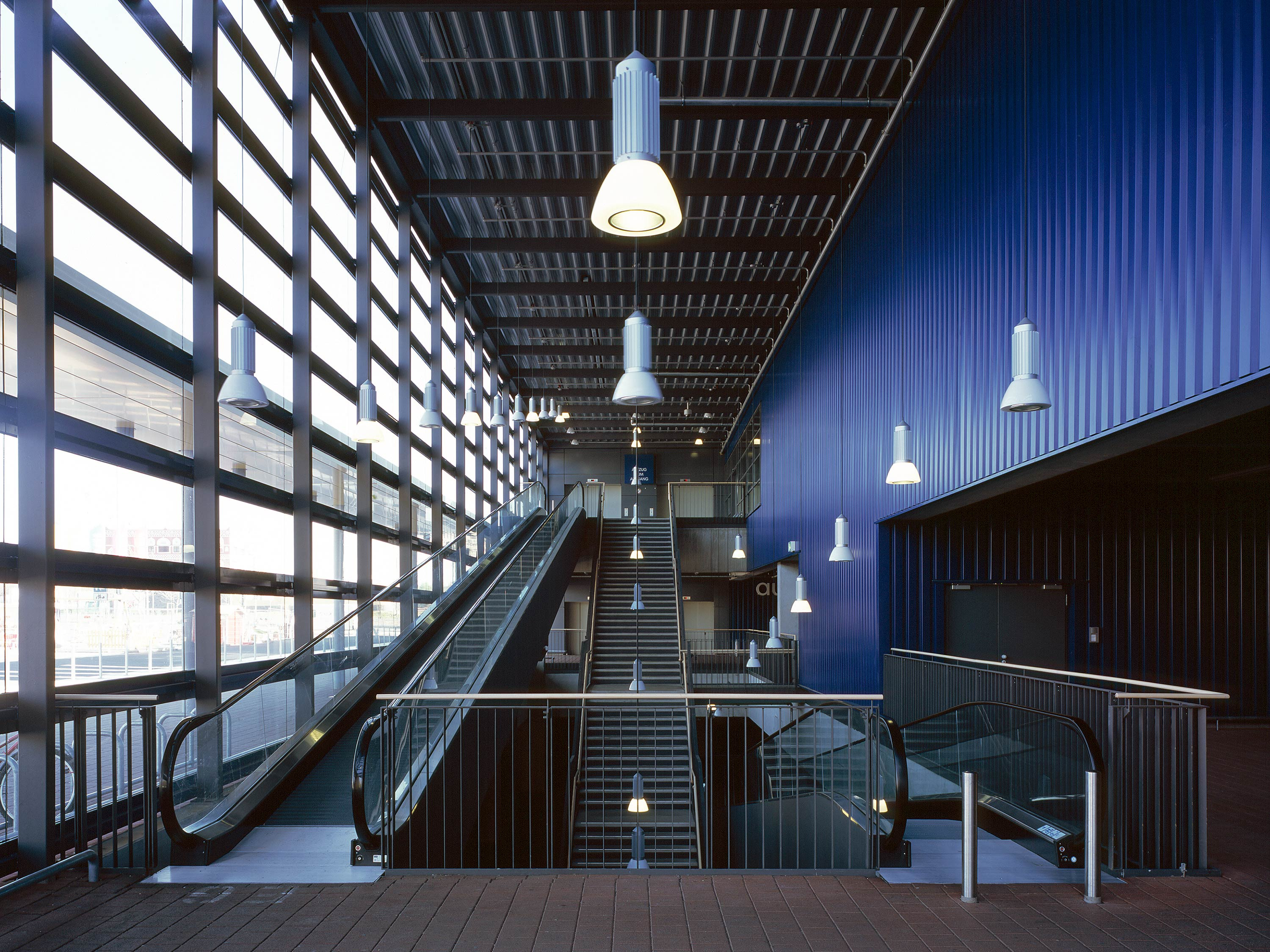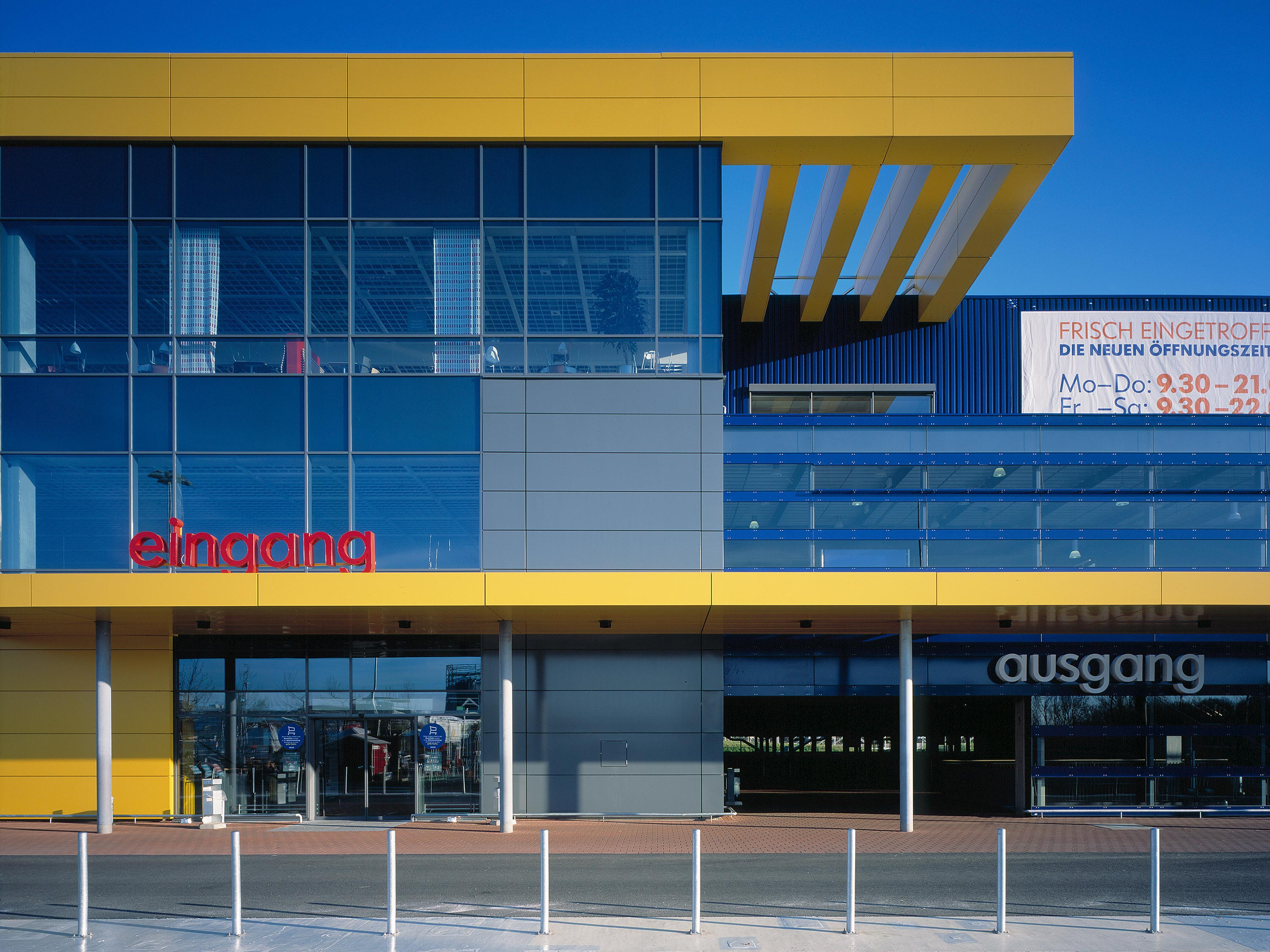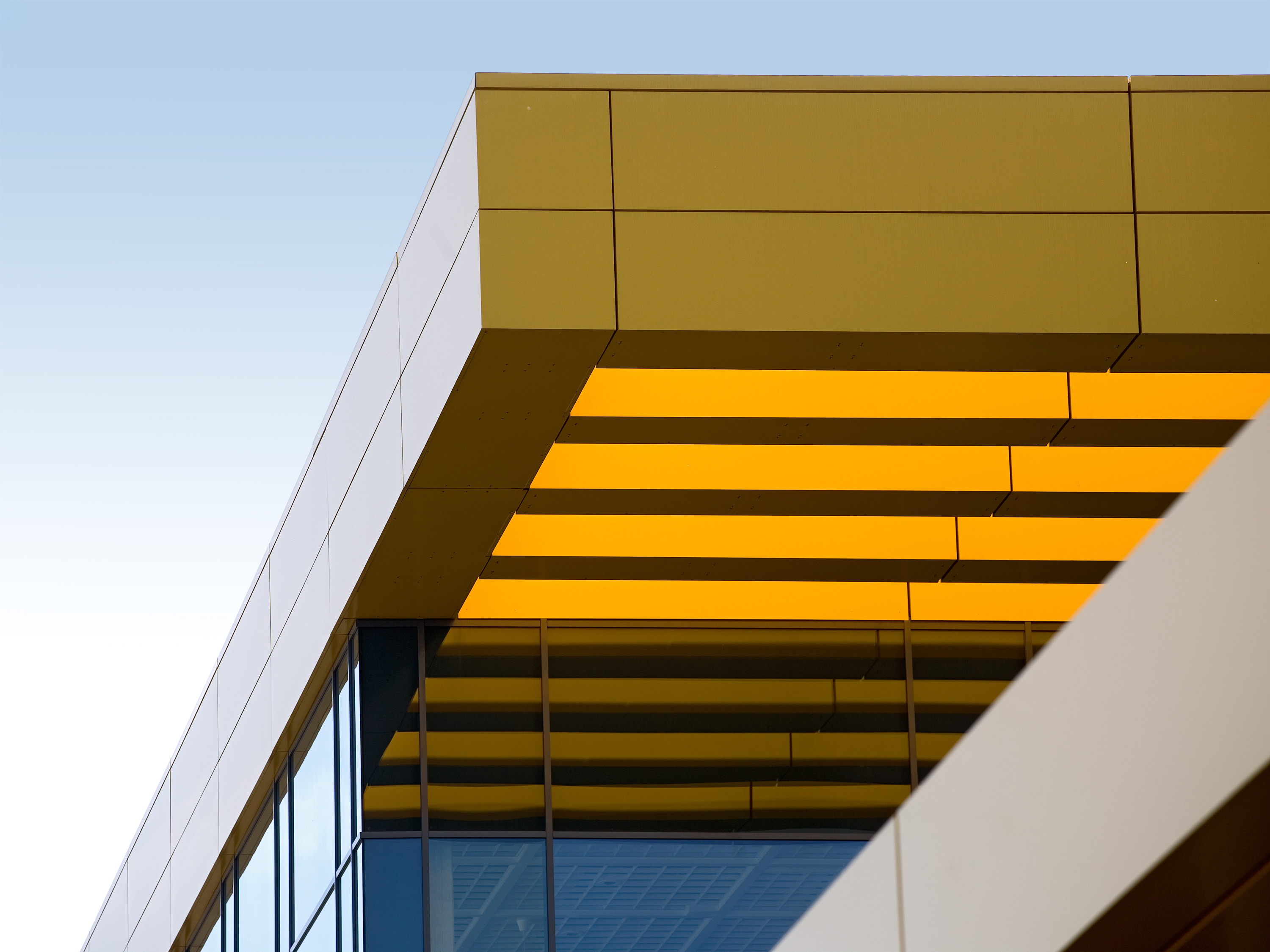 The façade design of colored trapezoidal sheet metal was designed in accordance with the company's corporate identity. The main entrance area and the restaurant above are highlighted by a protruding, generously glazed structure.