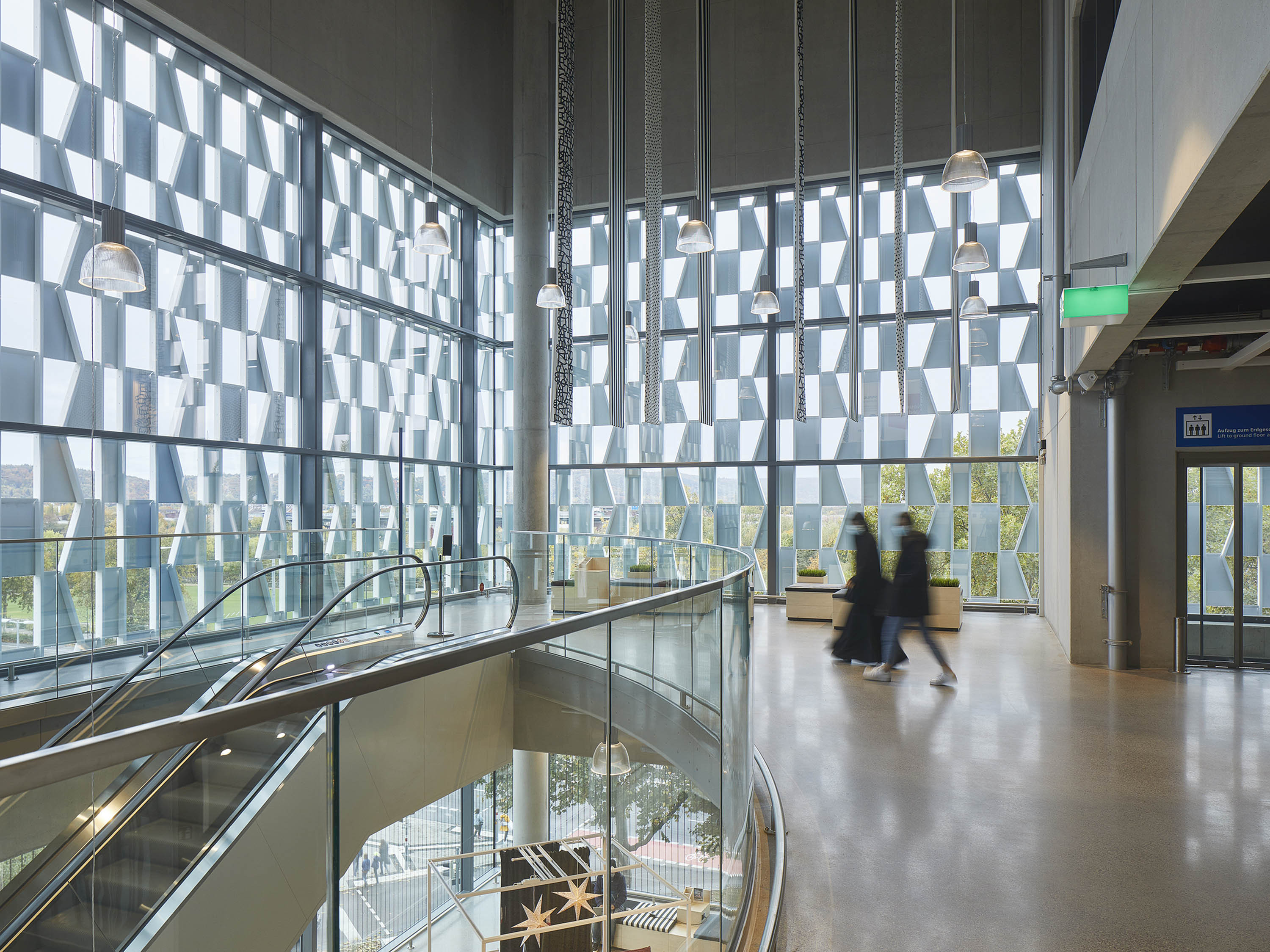The building is divided into two above-ground storeys with an inserted mezzanine floor, which together form the actual IKEA store. The large, three-storey garage with its bright and openly designed parking levels offers space for approx. 1,250 car parking spaces.