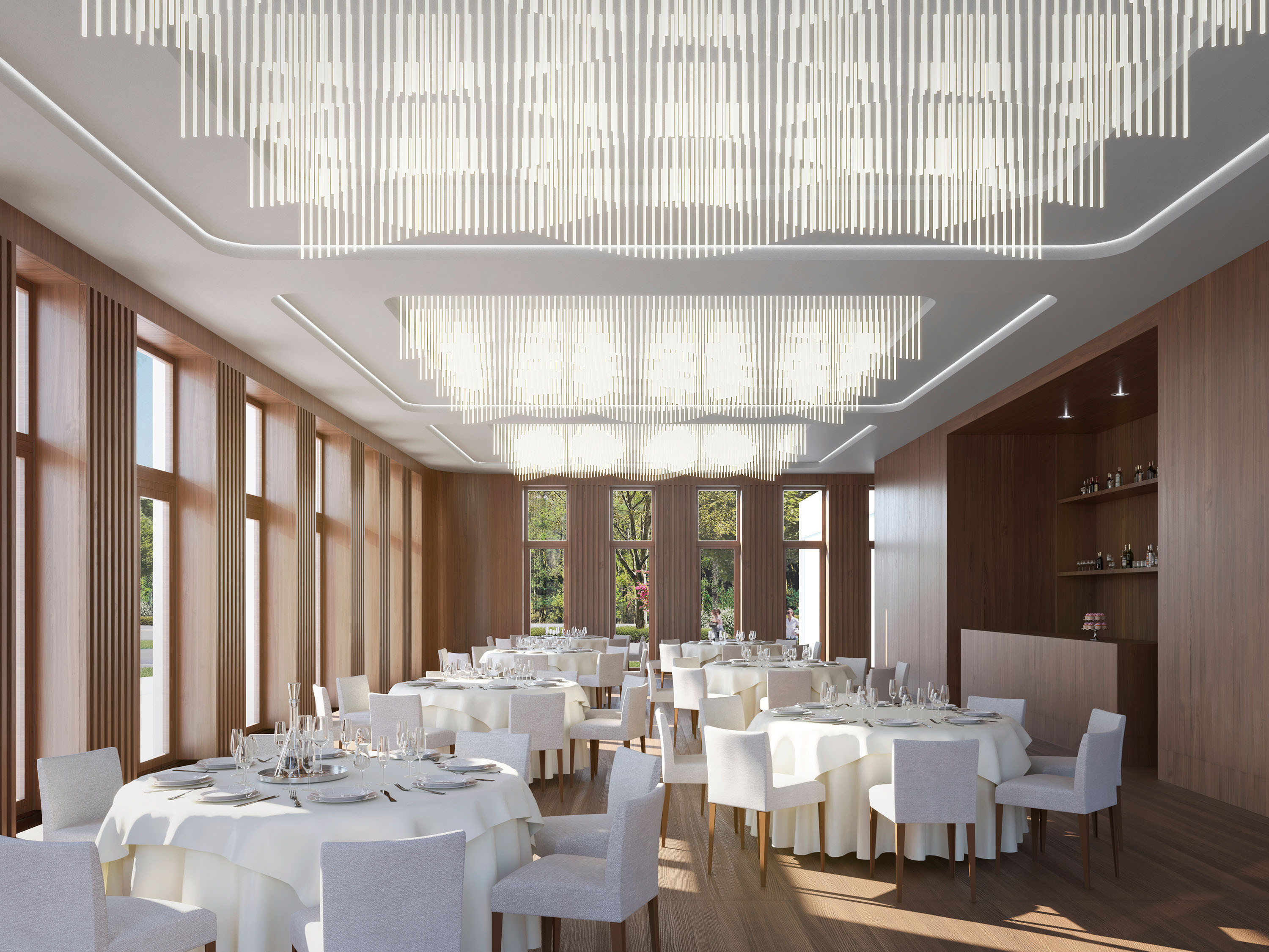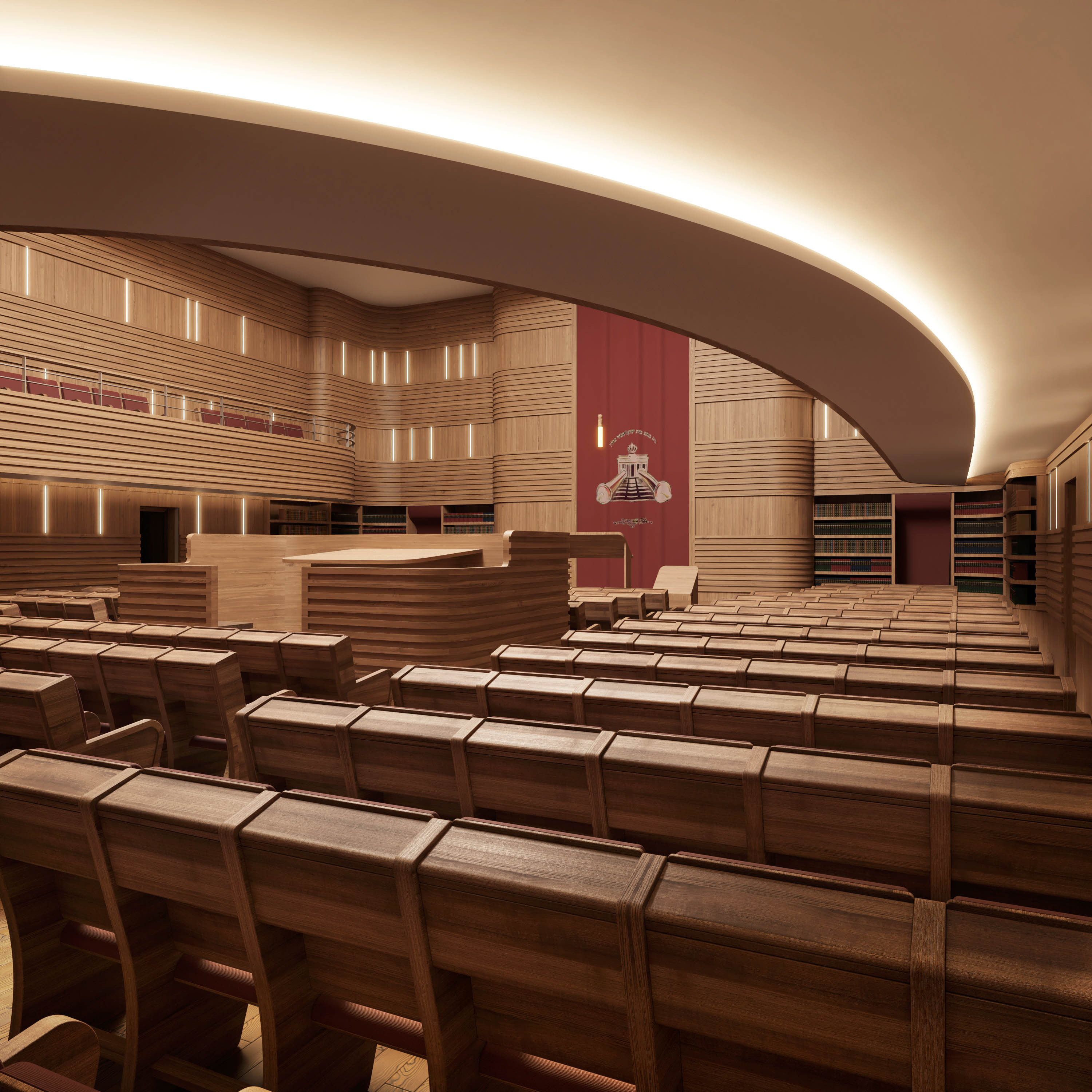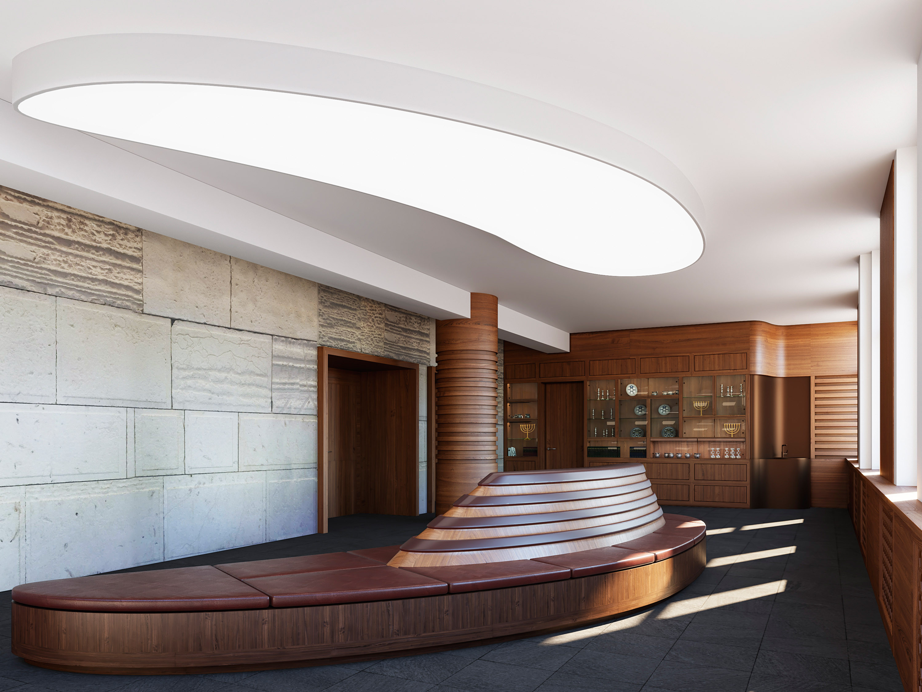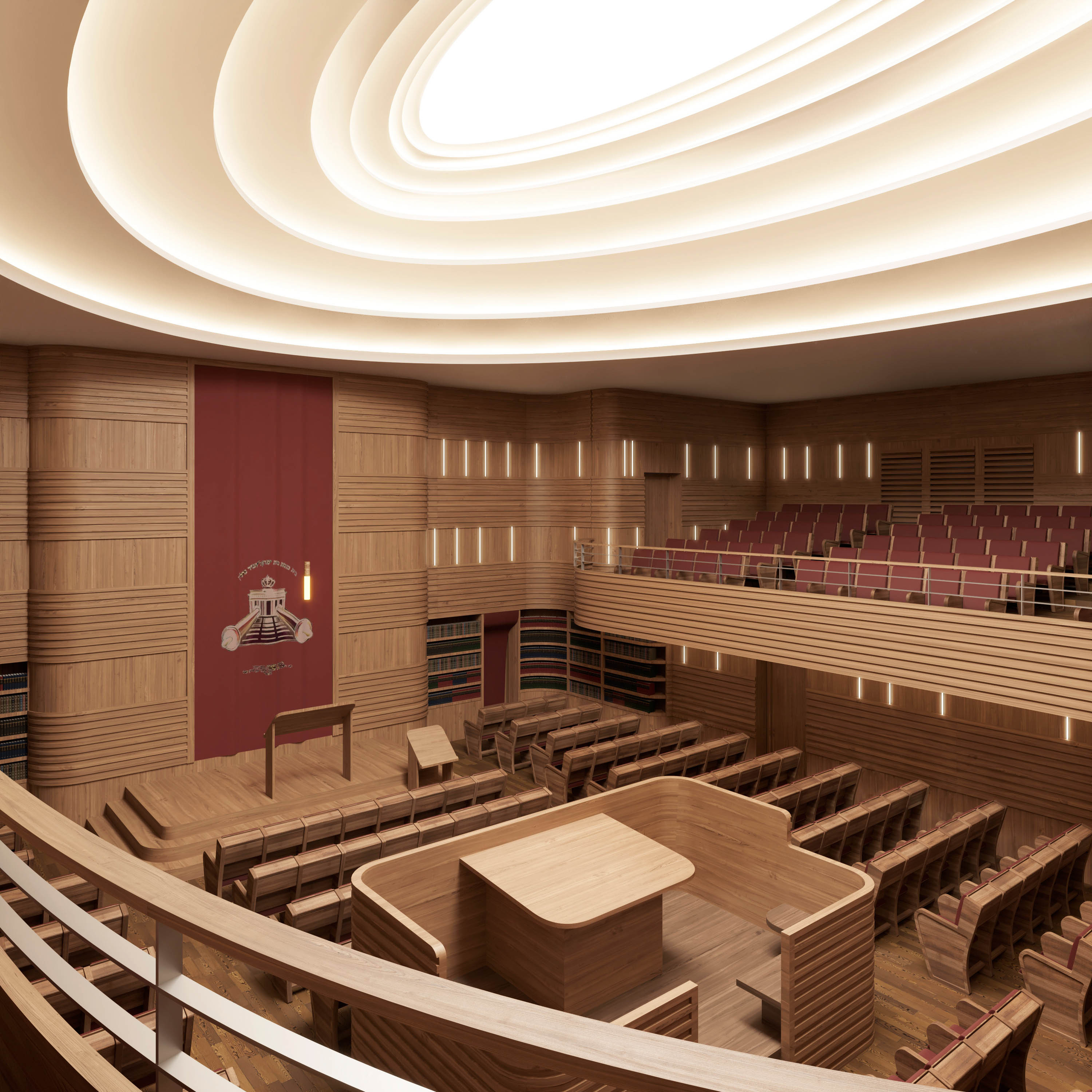 In the centre of the staggered hall ceiling, an oval skylight allows daylight to enter. The synagogue offers space for up to 488 people, 180 seats in the gallery, 280 in the lower main room and 28 in a divisible "Small Synagogue".