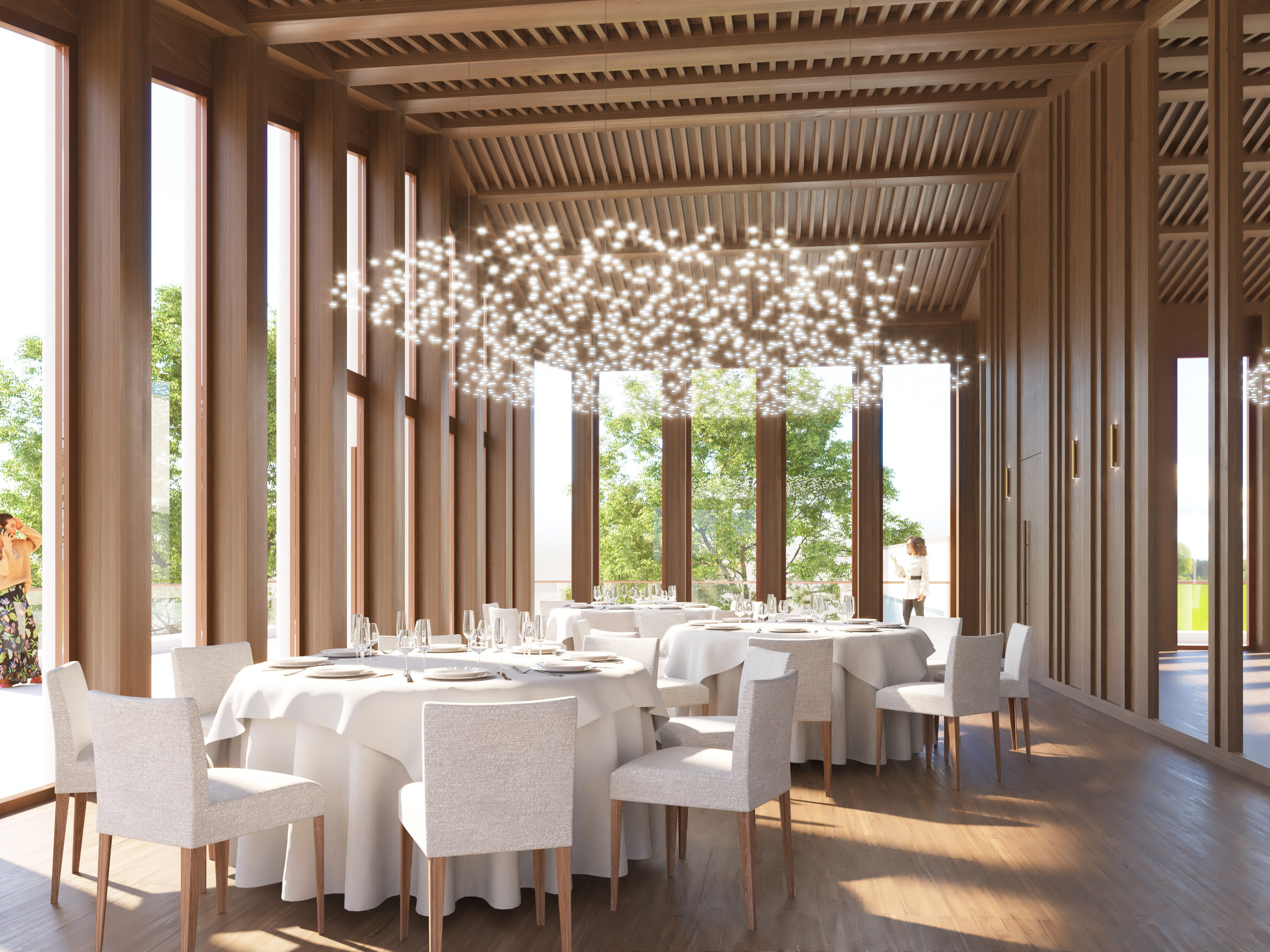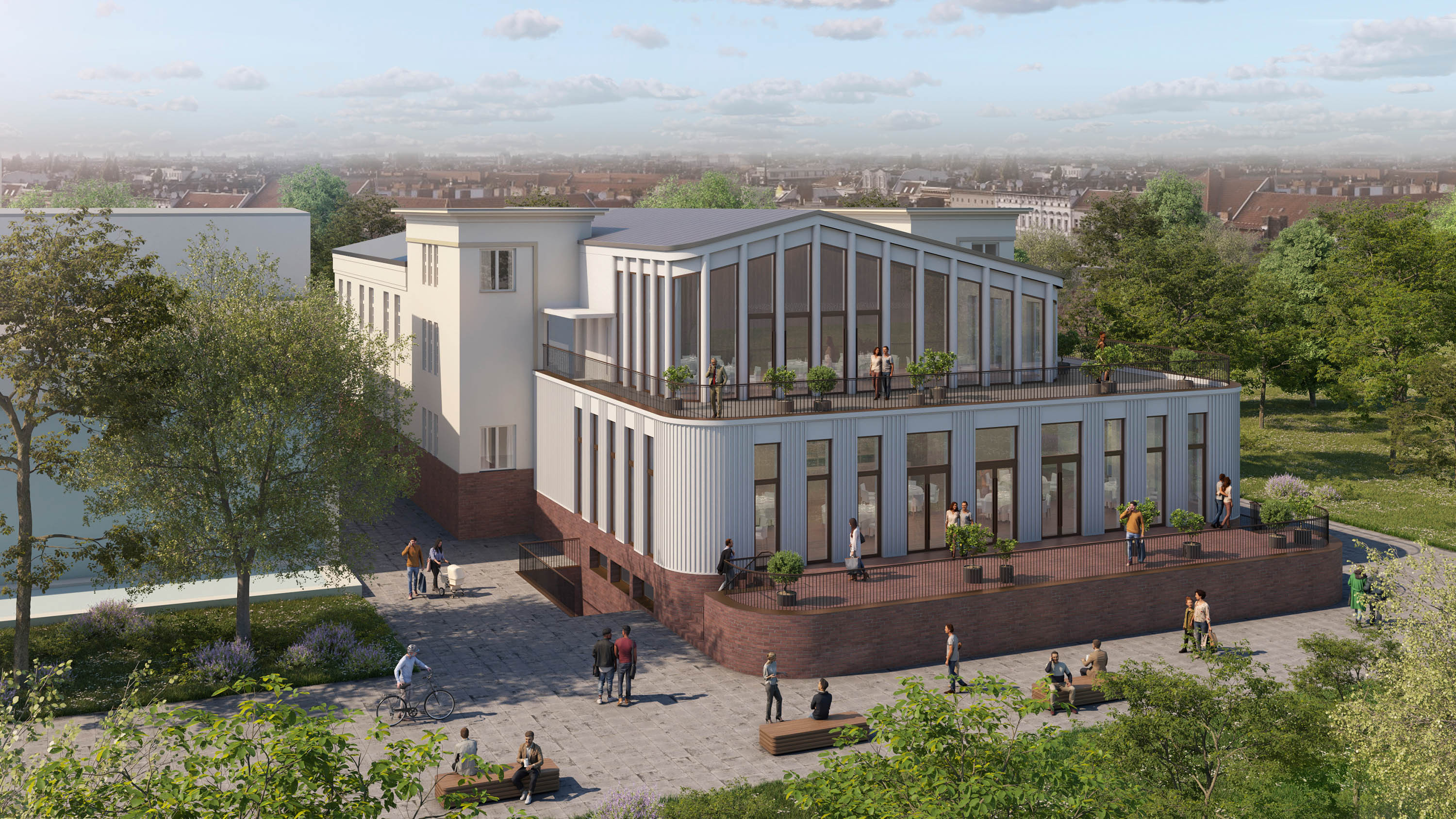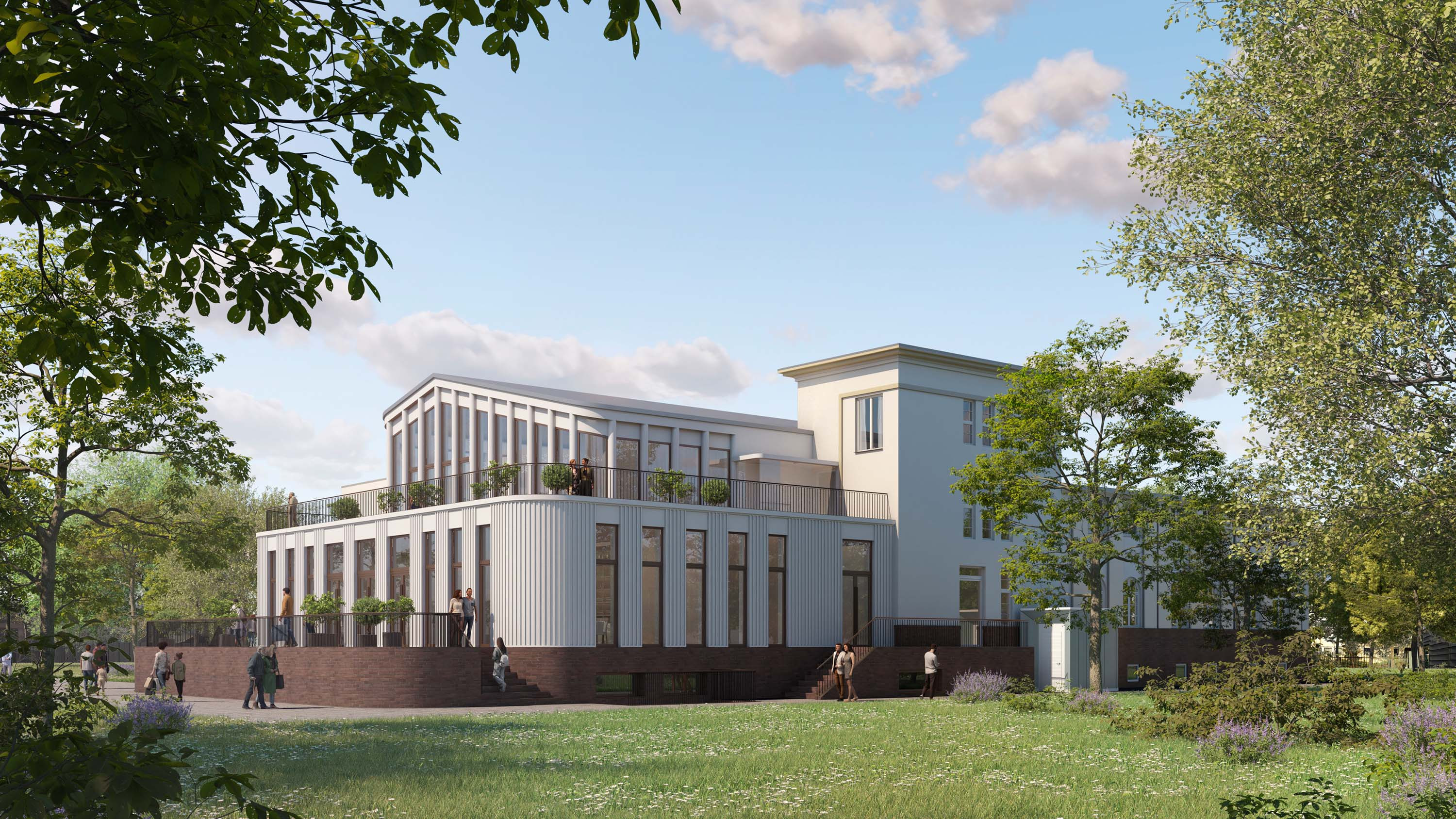 The community hall will also be enlarged and will be housed in a new two-storey extension with a terrace in front, which opens the hall into the garden area. The connecting element with the existing building is the base of rust-red brickwork on which the extension rests. The roof of the hall will also be designed as a terrace.