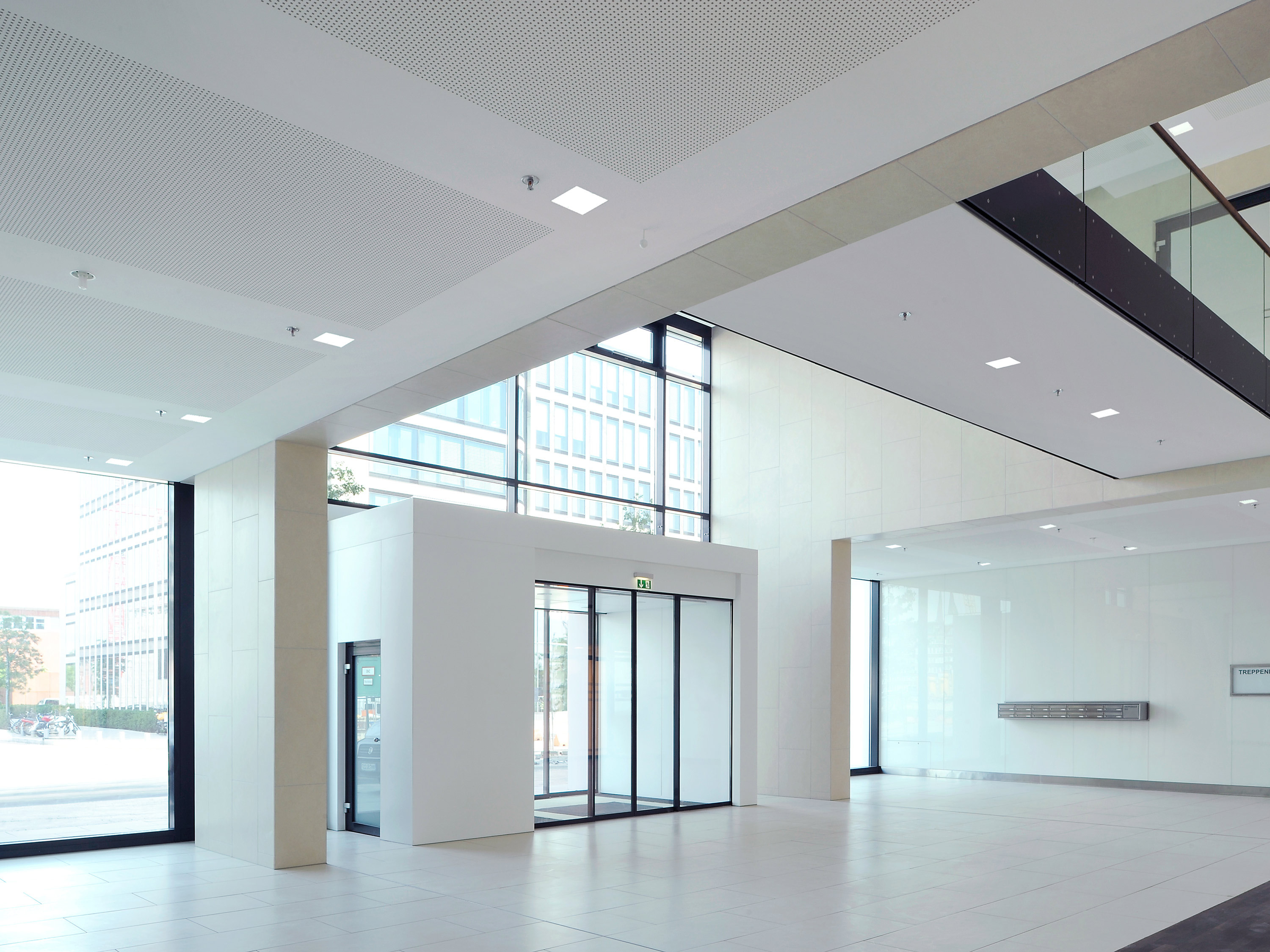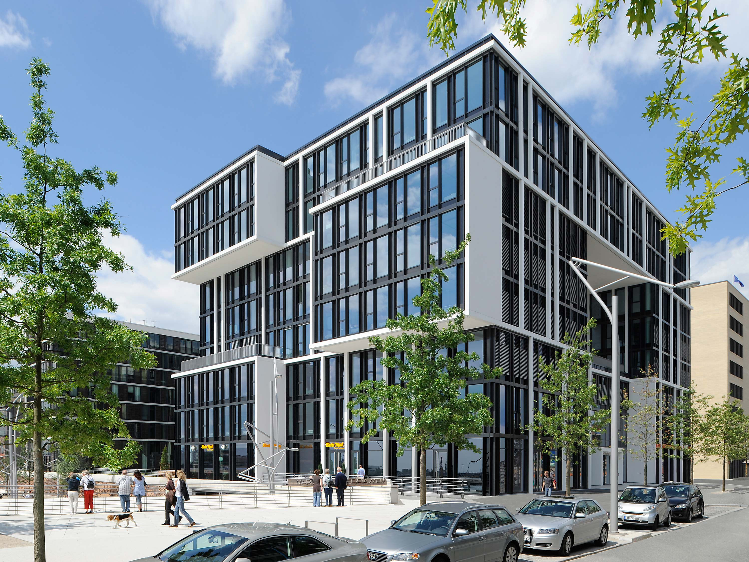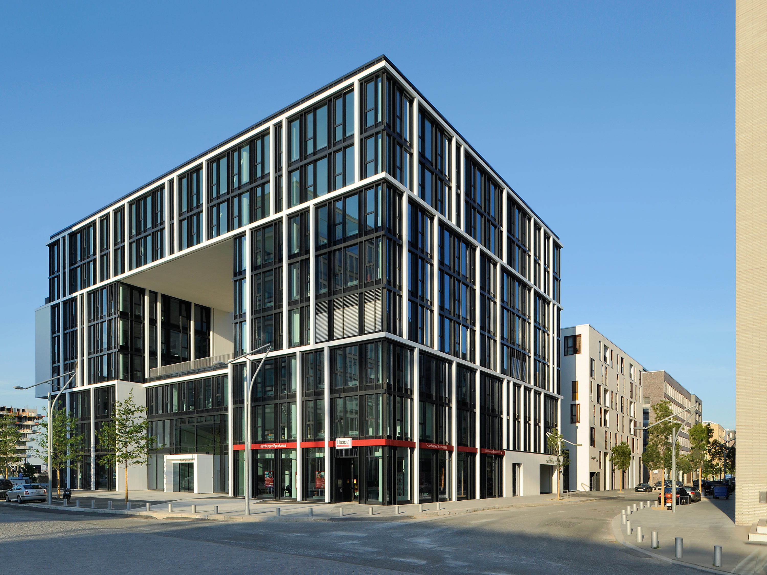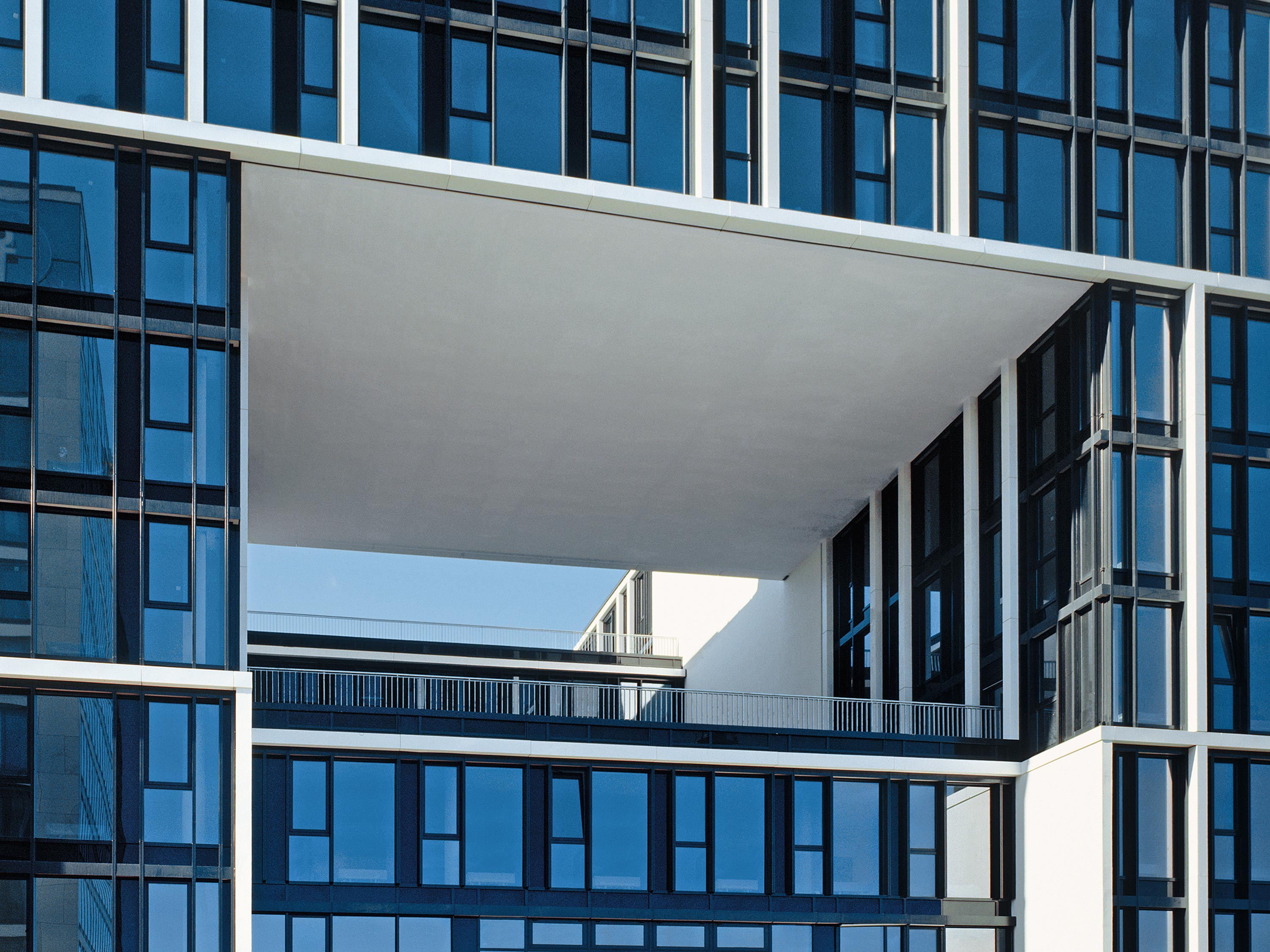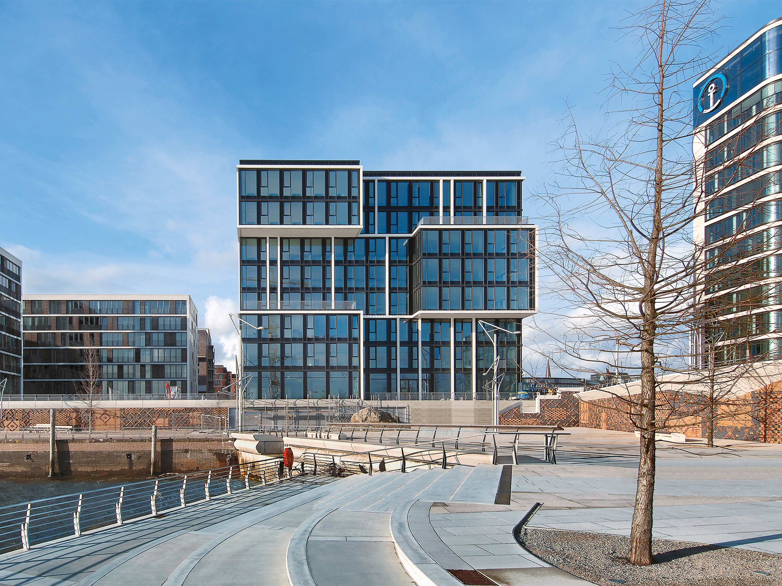 The cubature is a volume that is broken up in many different ways, allowing views, spaces and framed “city sections” to be experienced. On the water side, three multi-storey building parts protrude in front of the facade and provide a 180° panoramic view freely on the maritime port environment.