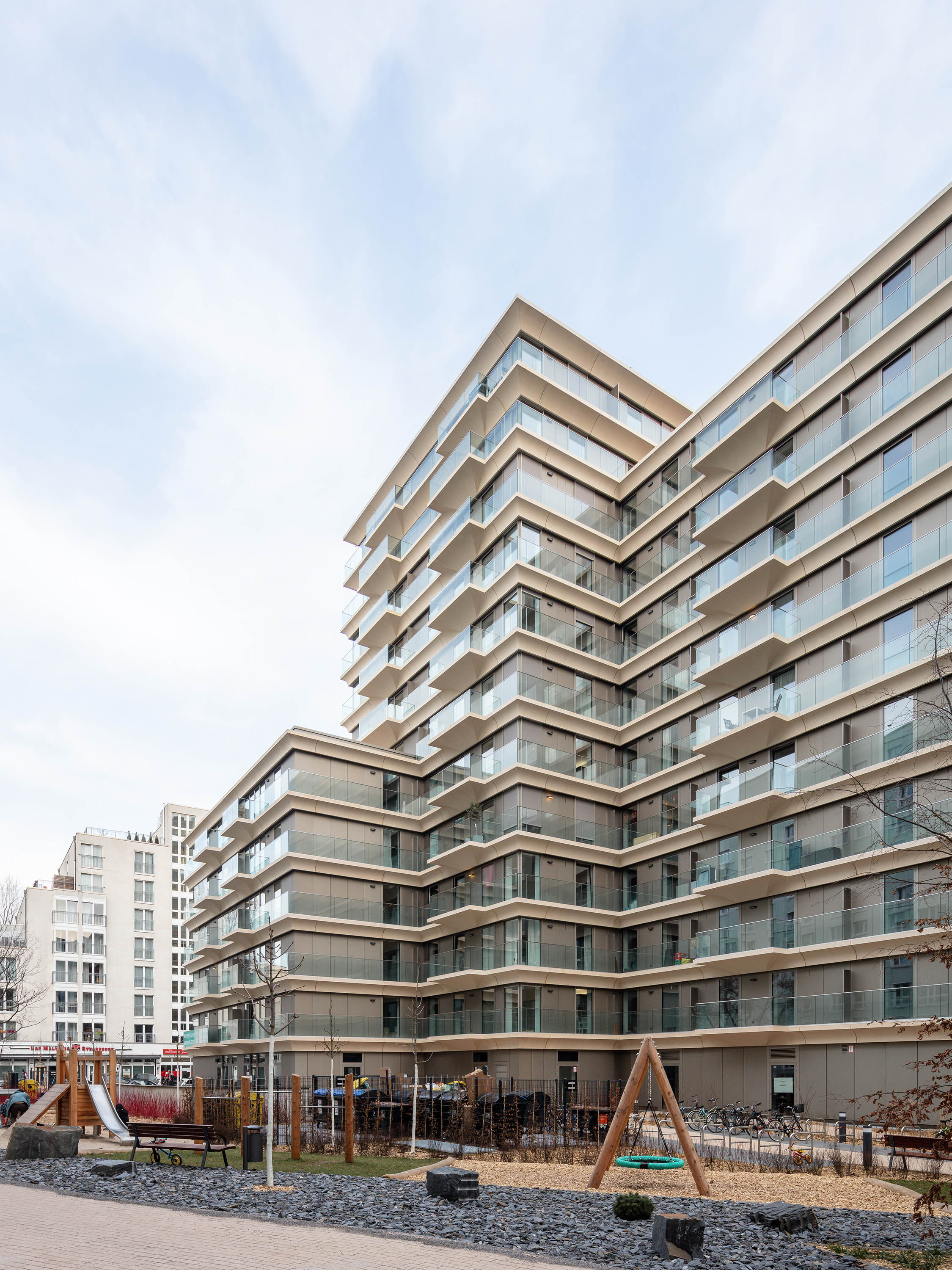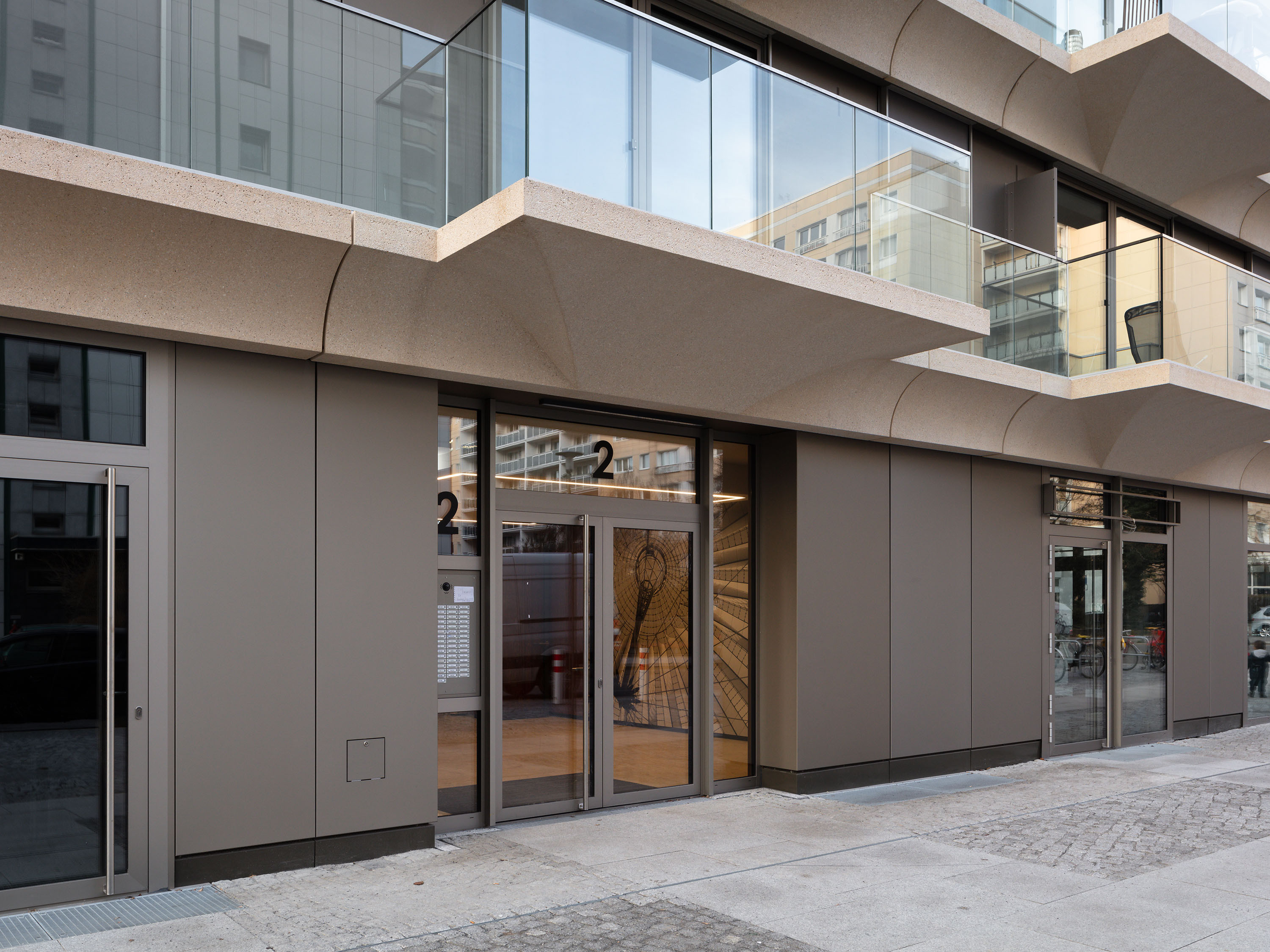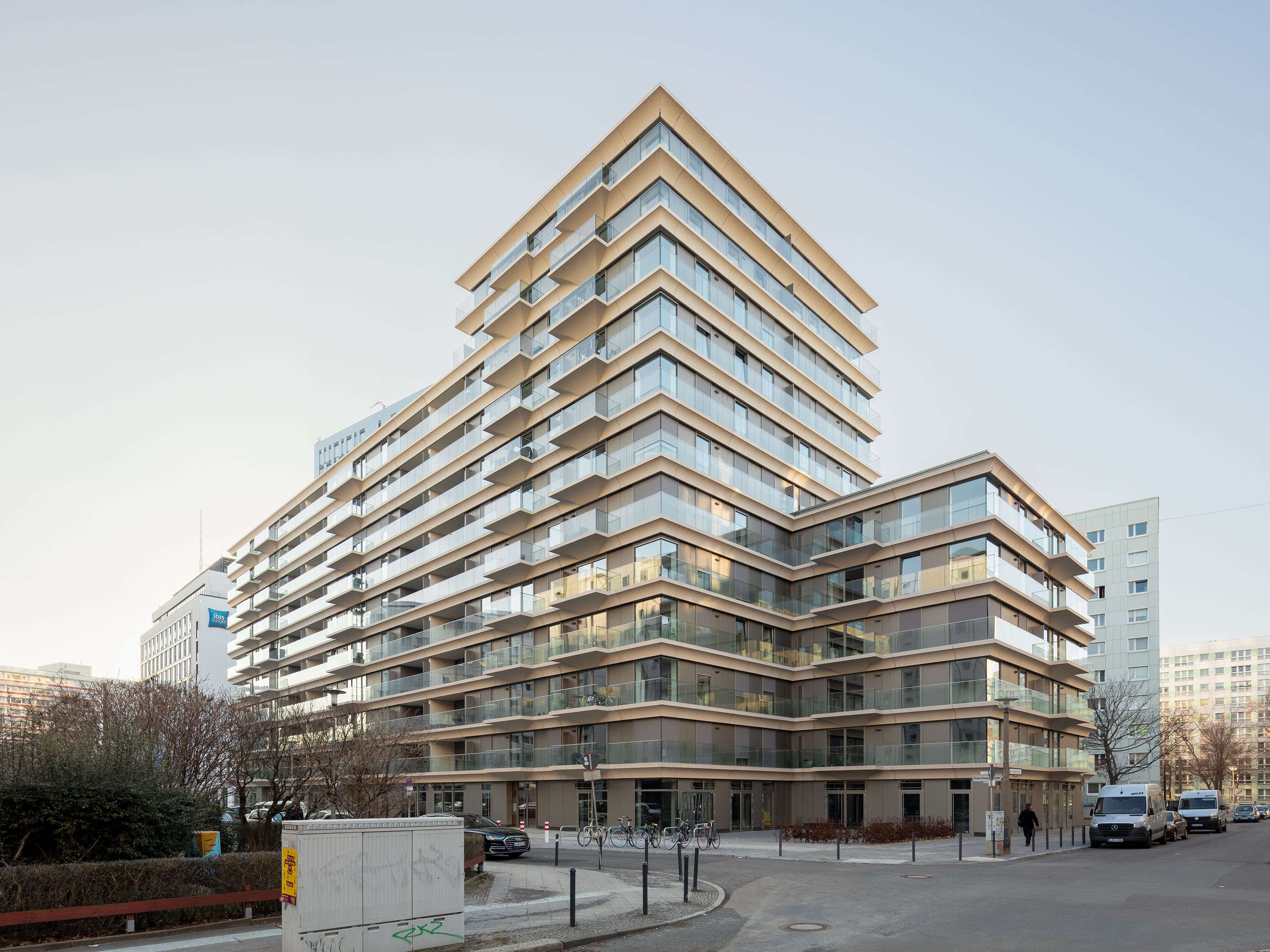 The residential complex consists of a ten-storey block, which is marked by two further storeys in the shape of a tower. A six-storey, staggered front building brings the eaves height back to the historical Berlin dimensions.