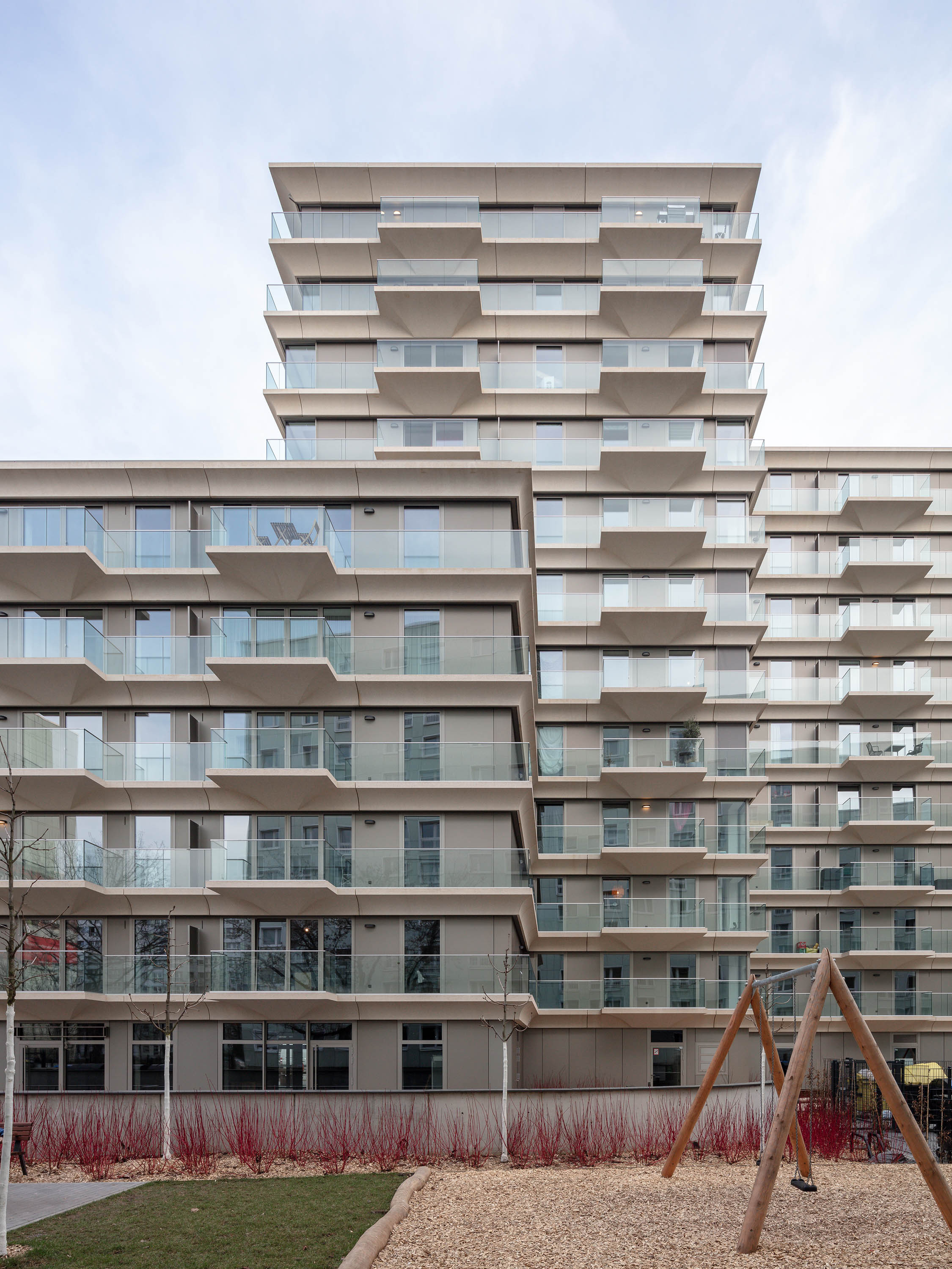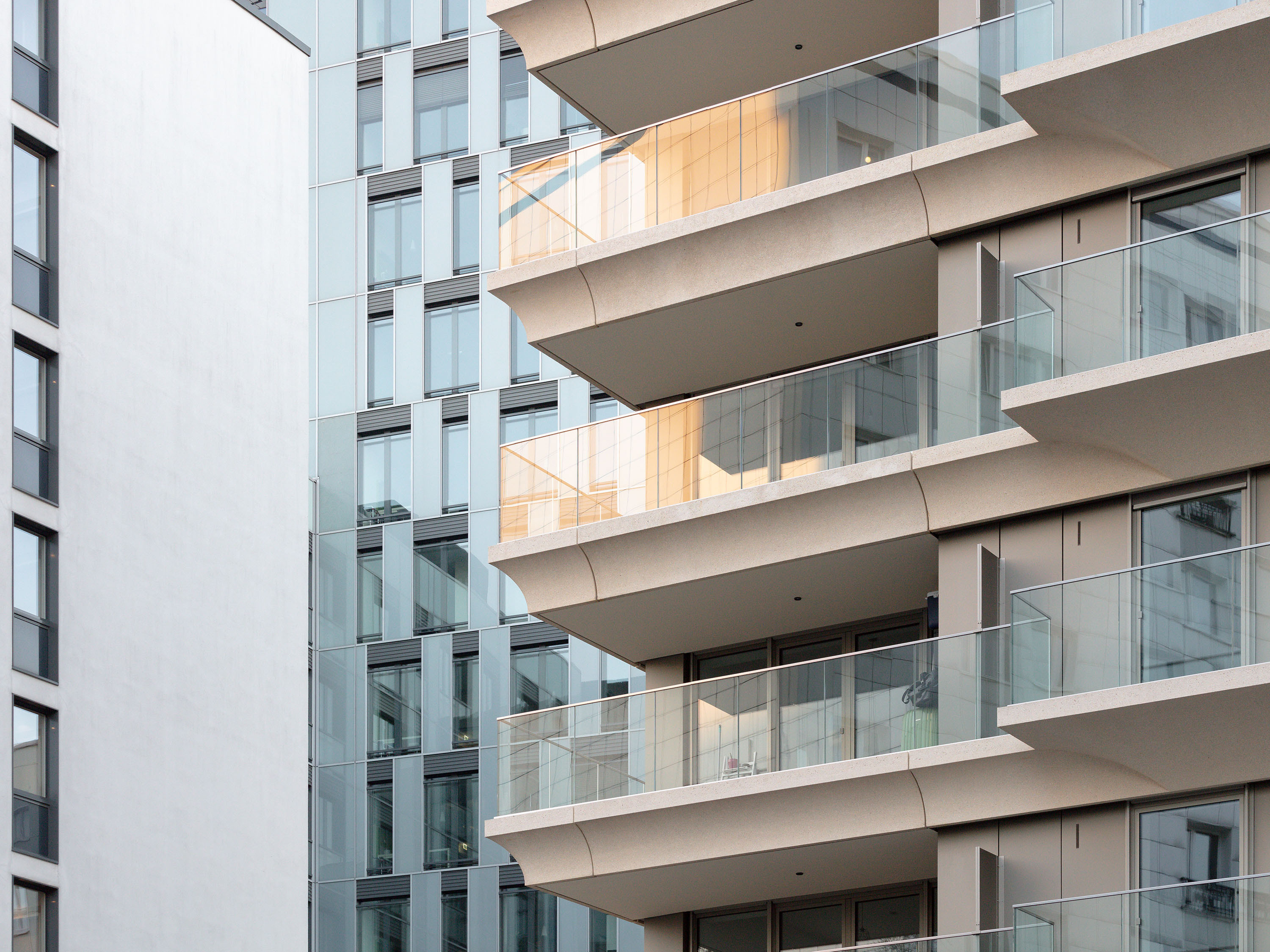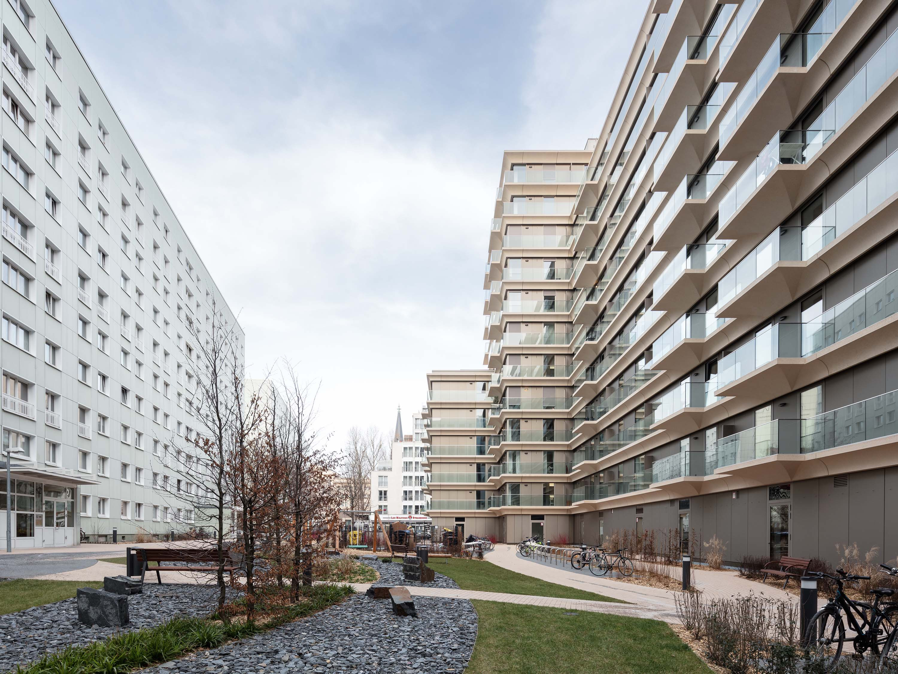 The residential complex consists of a ten-storey block, which is marked by two further storeys in the shape of a tower. A six-storey, staggered front building brings the eaves height back to the historical Berlin dimensions.