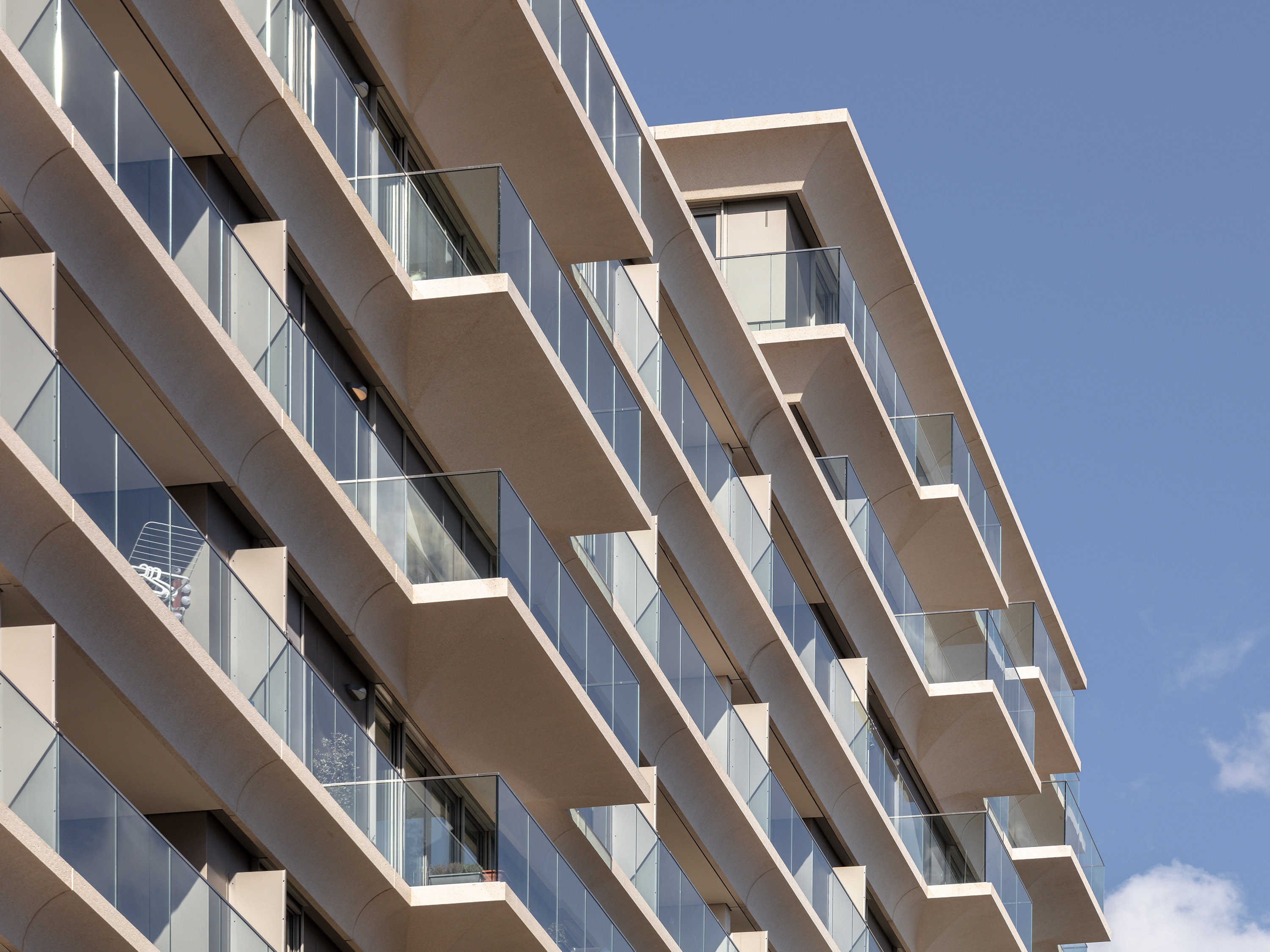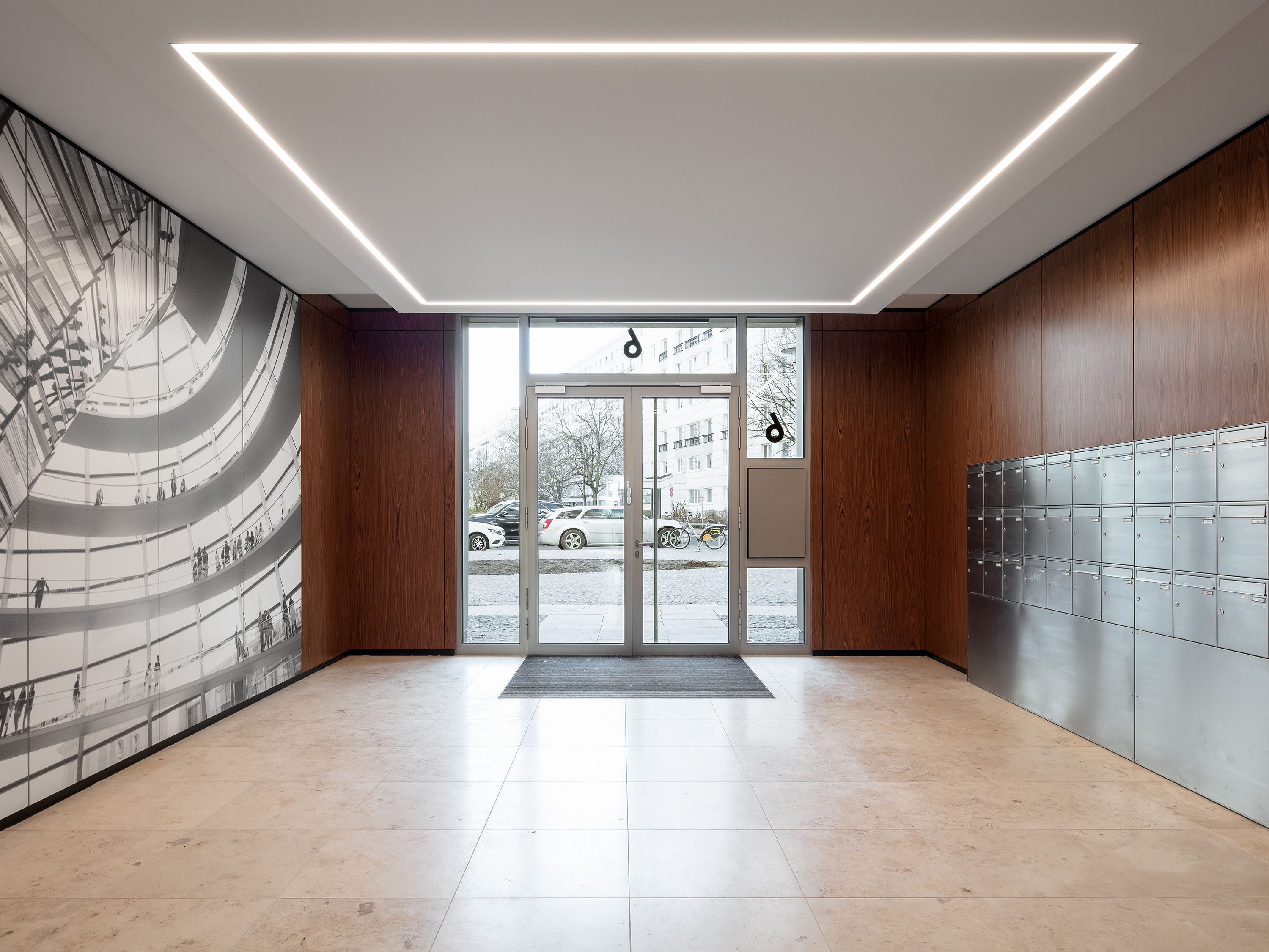 Regardless of its large dimensions, the building presents itself light and open through its room-high, generous window fronts and an openly designed, flat glazed ground floor. The lavishly designed, cove-like cornice strips made of coloured architectural concrete form a flowing line with the balconies, loggias and floor-to-ceiling windows and lend the facade matrix additional plasticity and tension.