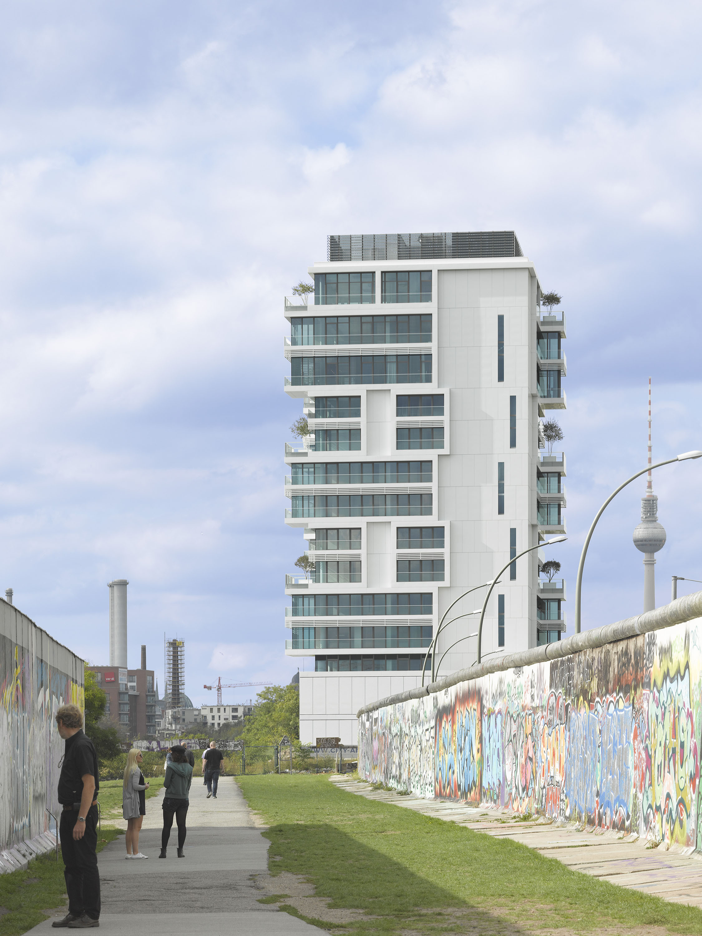 The 14-storey residential tower is formed out of sculptural elements whose manifold functions appear to be visibly stacked. The relief-like details, which are visible from all angles, provide a visual attraction with the variation from hollow volumes to cantilevers.