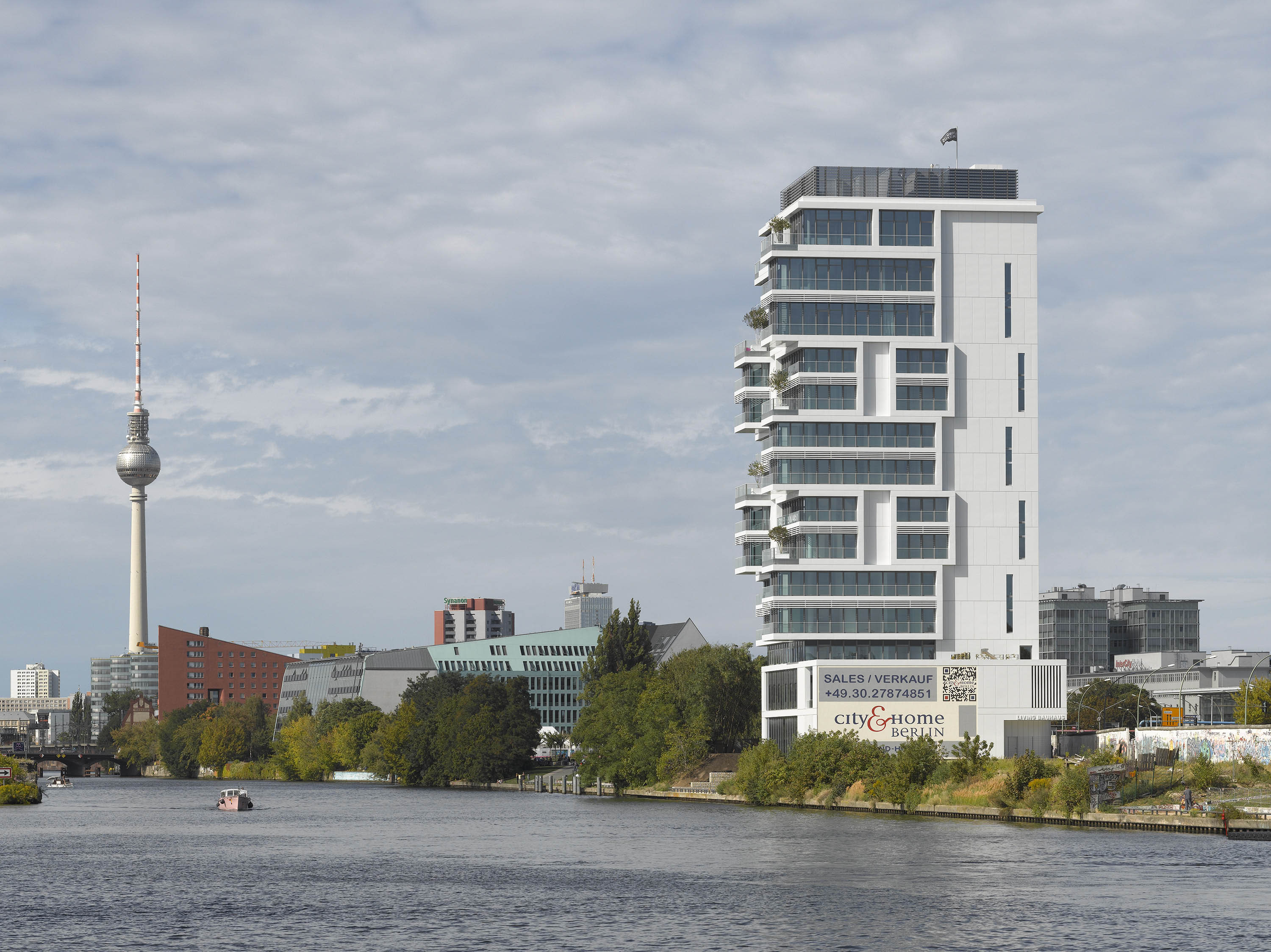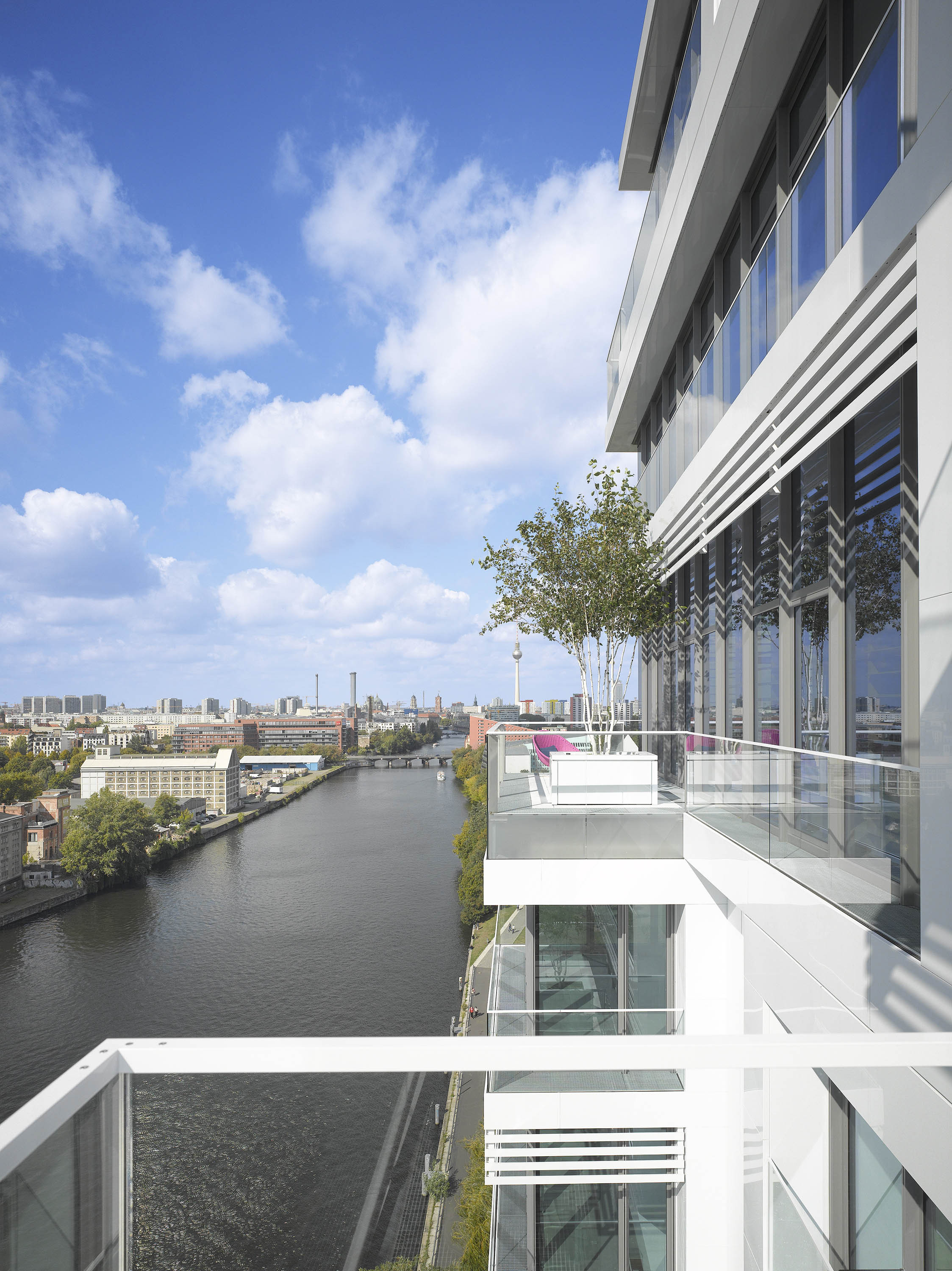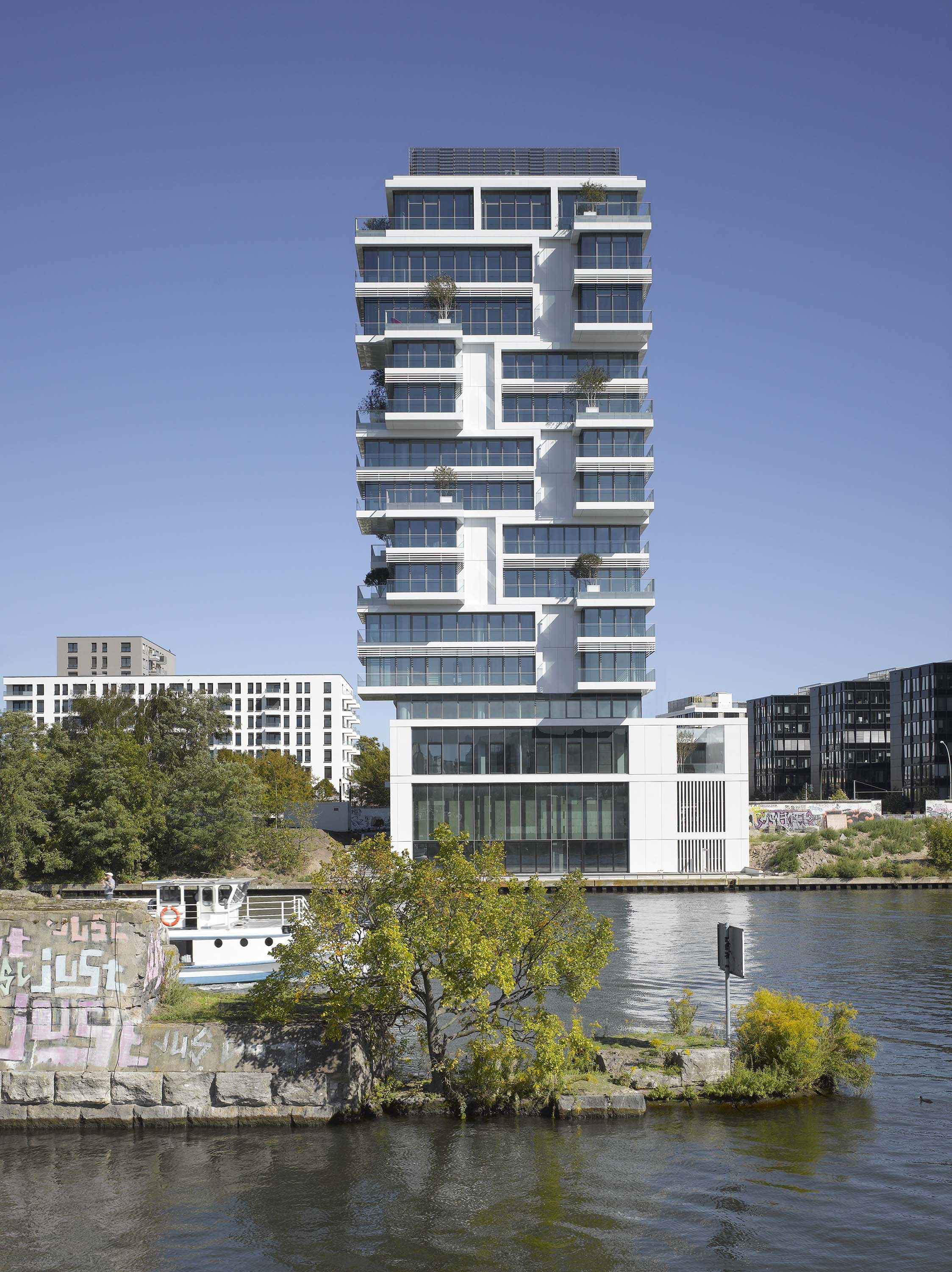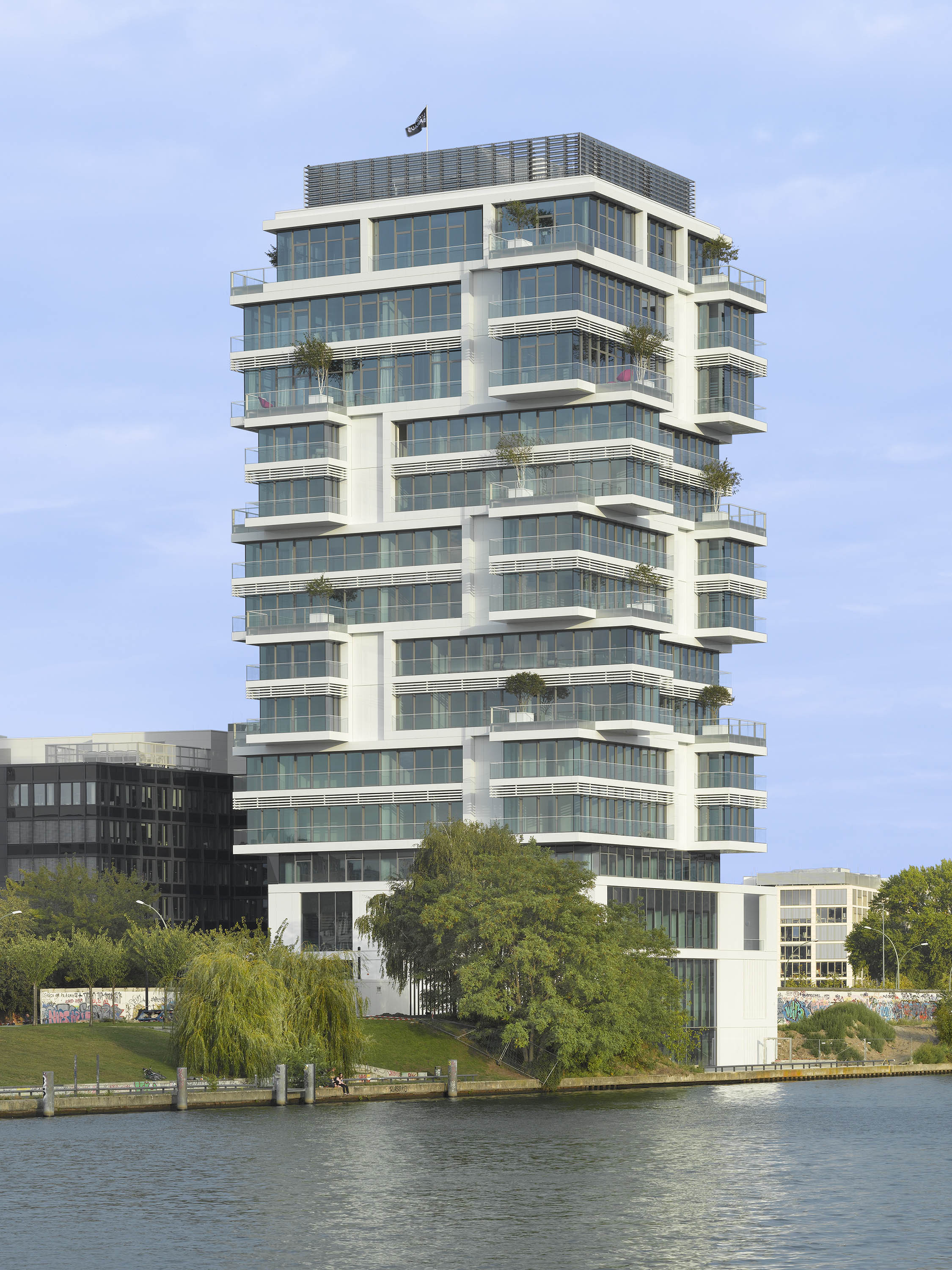 Being set on pedestal, which is clad with metal panels, the facade of the tower is emphasized by its generously glazed surface. The two-story shaped entrance hall is also used as a gallery. The greened lavish balconies and terraces are designed in the tradition of a vertical garden, beginning at the waterside and partially continuing along the tower.