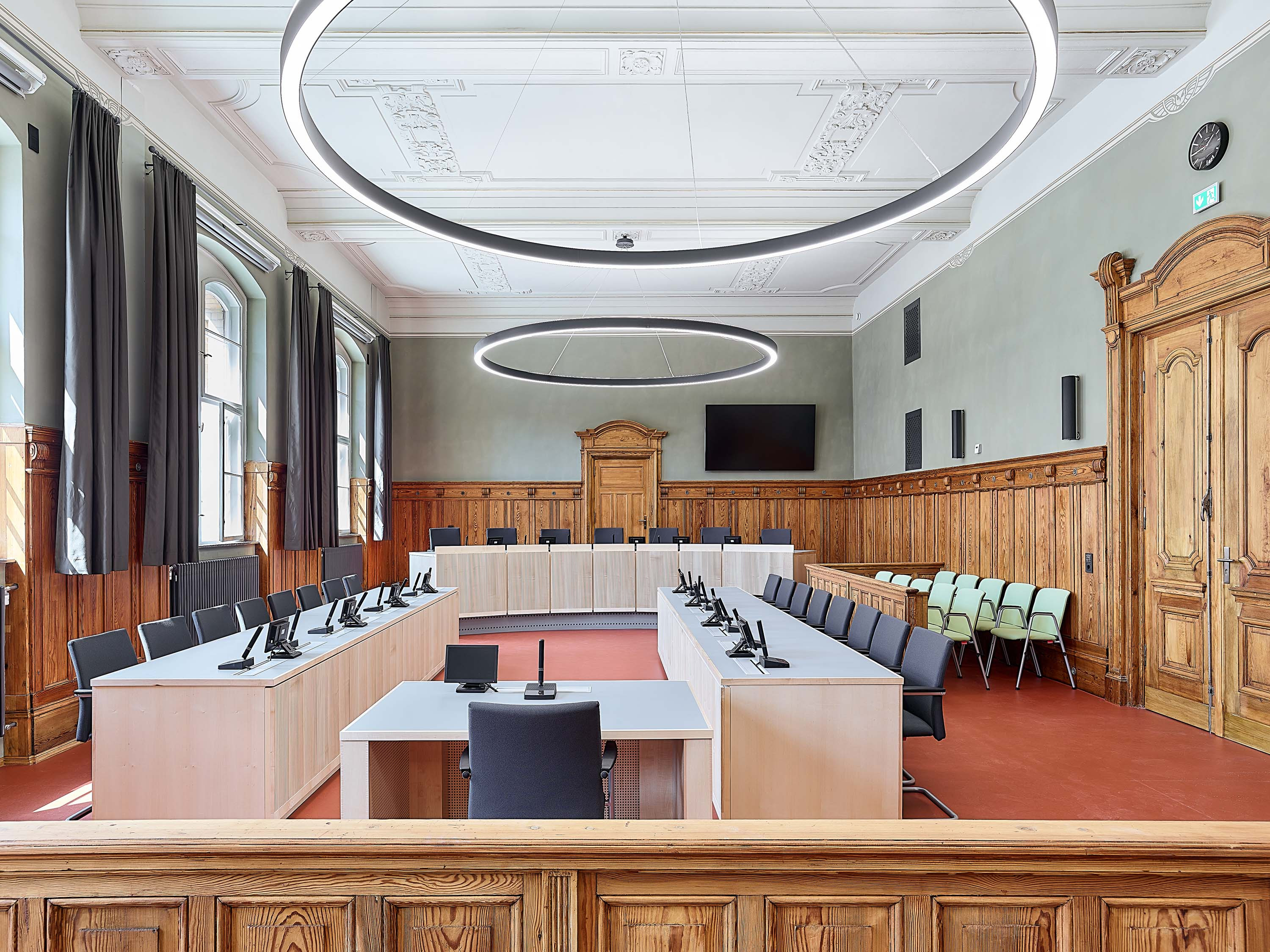 The general refurbishment successfully reconciled the high demands of monument conservation and restoration with the current requirements for modern data, communication and security technology, sound insulation and room acoustics as well as a contemporary energy-efficient extension.