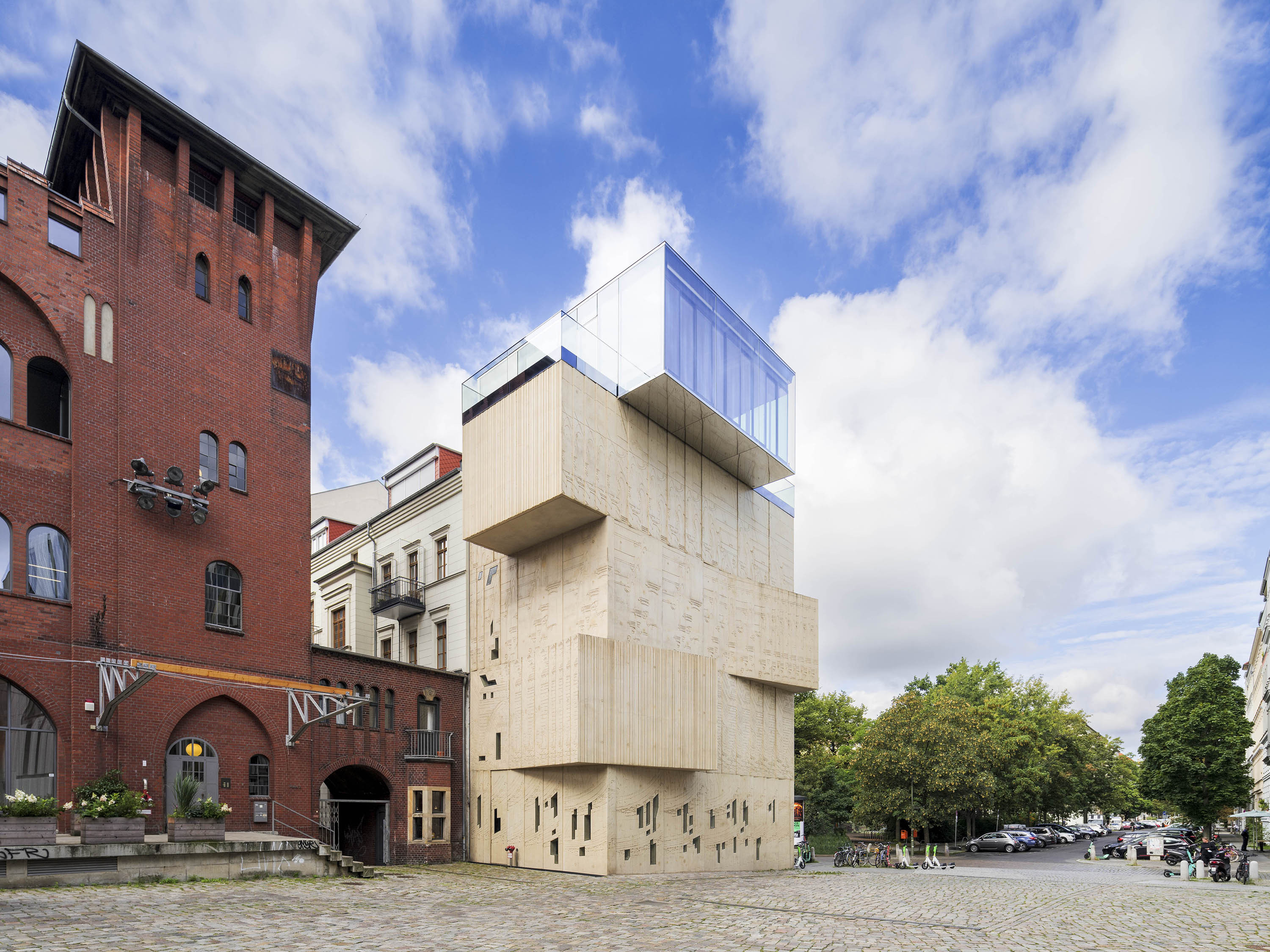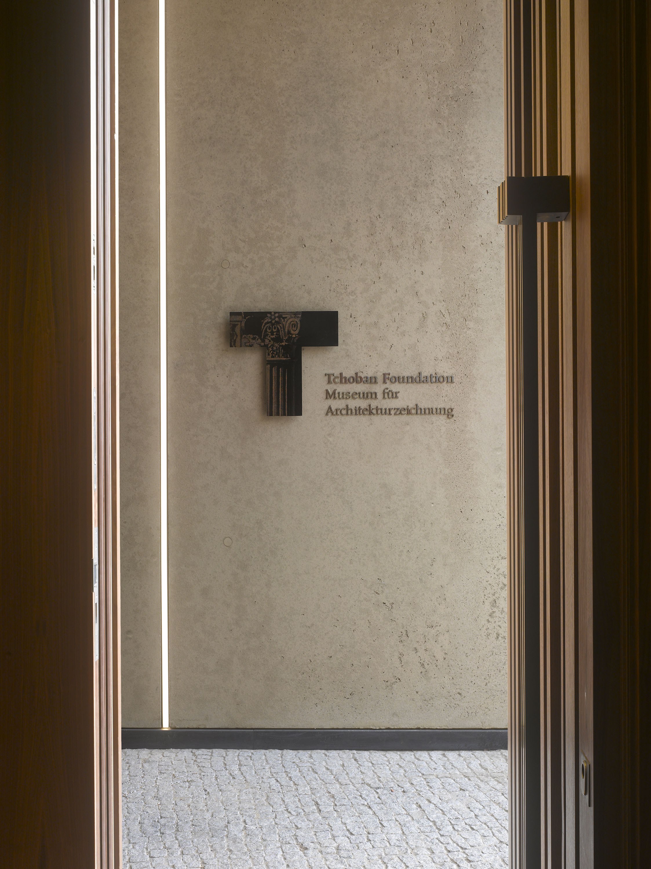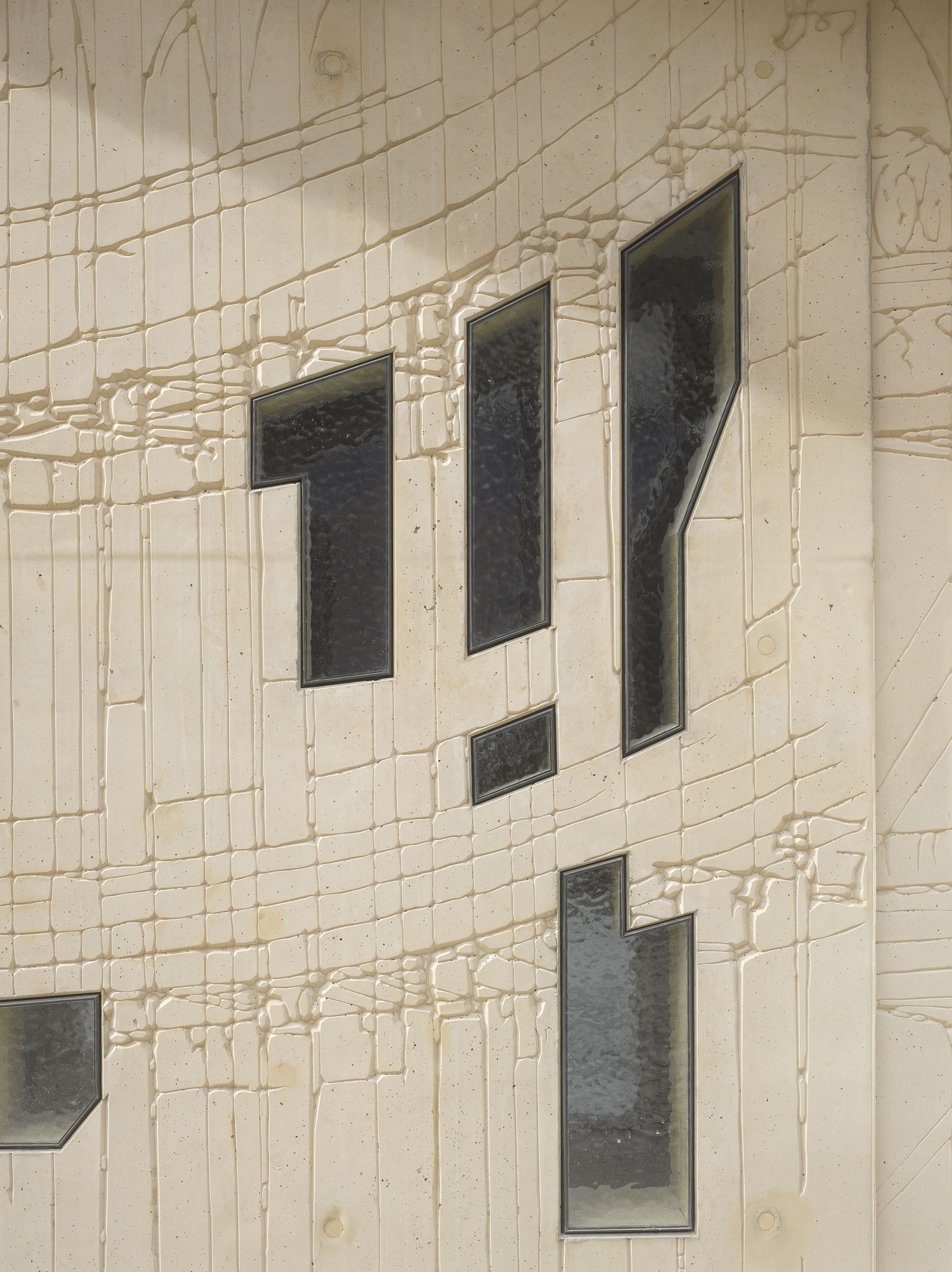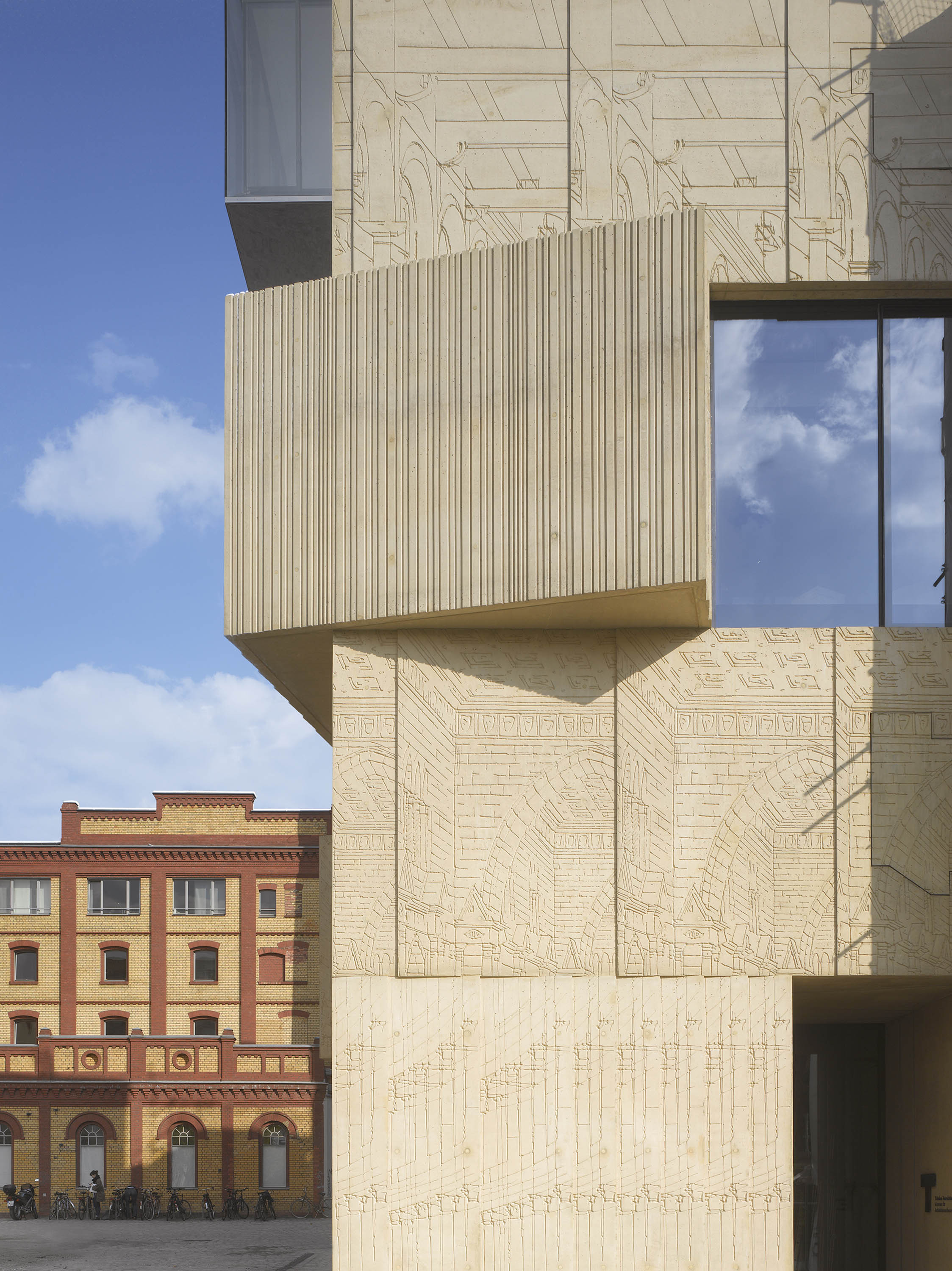 As an indication of its function, the sand-coloured concrete façade displays large-format fragments of historical architectural drawings, which were produced on site using plastic mould formwork.