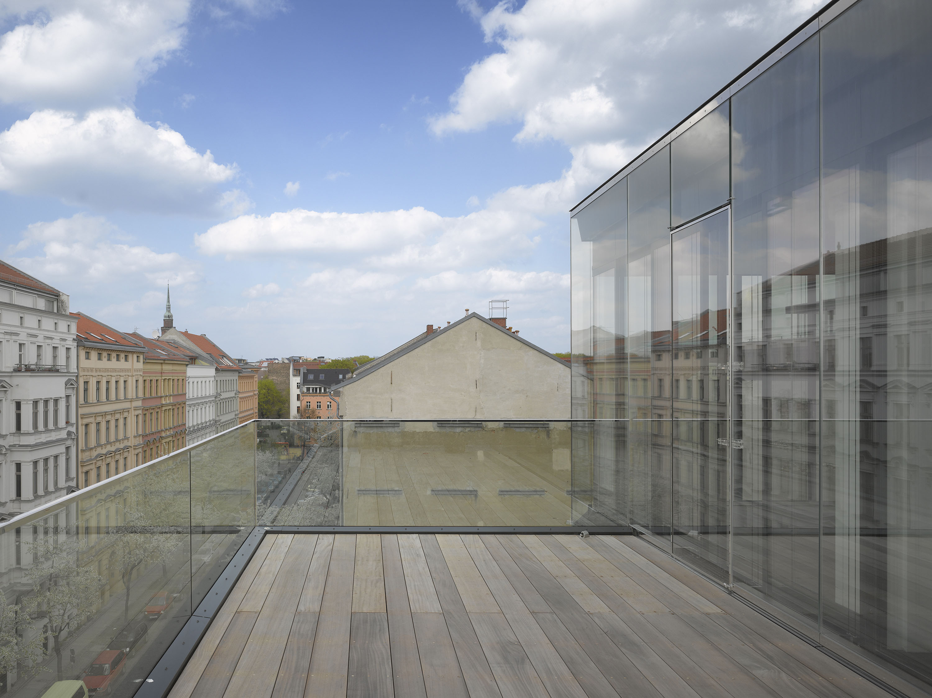 Two large openings in the street façade were designed as an entrance niche and a glazed loggia. The interior is divided into storeys: Reception and library on the ground floor, two exhibition areas above, the archive on the third floor and the and a meeting area with terraces on top.