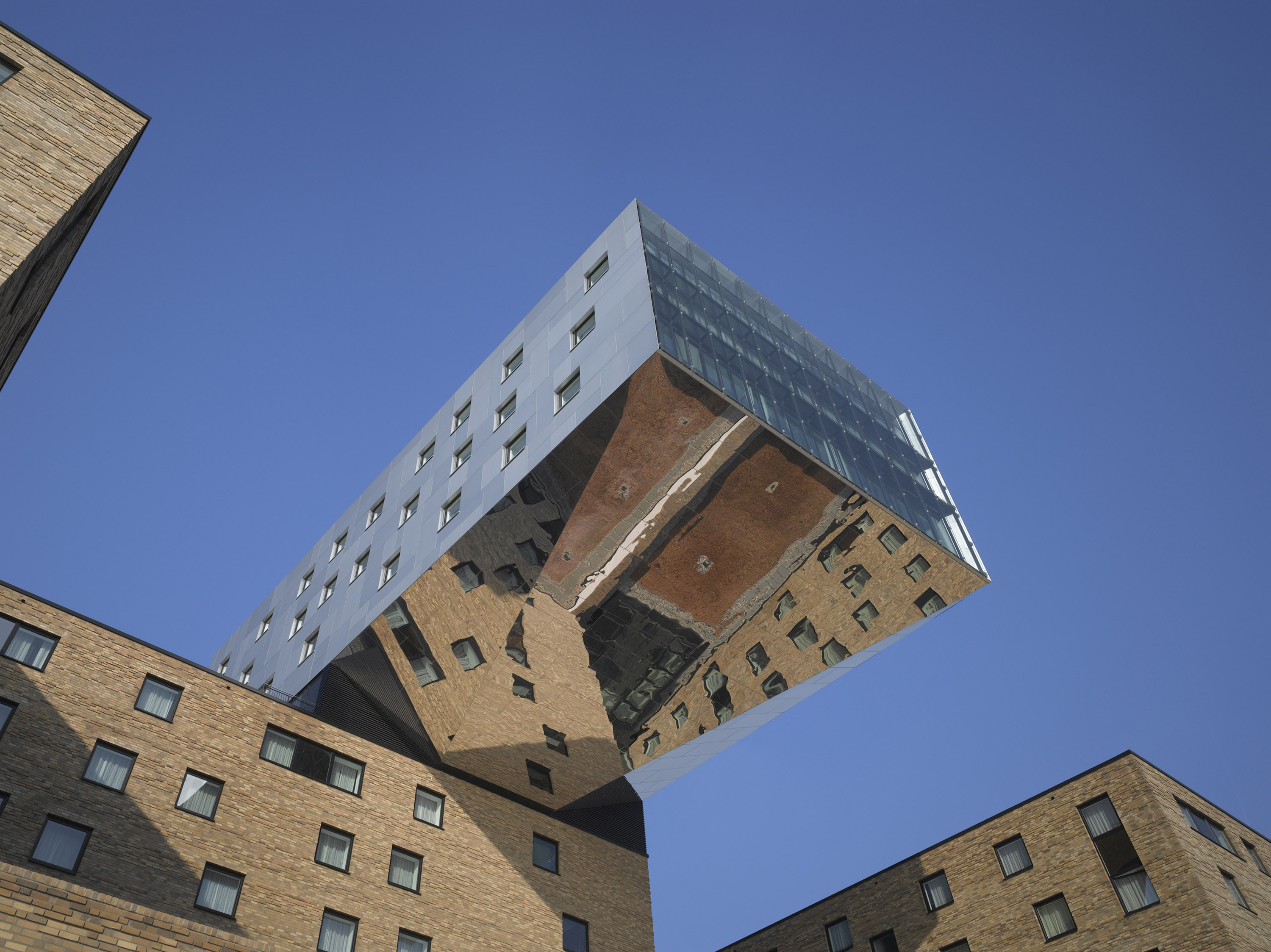 The building volume is divided into two blocks, each of which opens onto the water in a U-shape. Both cubatures are divided into seven storeys and connected to each other via a glass link. Above this, a further four storeys were built in the western block, of which the upper three storeys are realised as a structure cantilevering out to the river side by around twenty-one metres and are spectacularly reminiscent of a crane house.