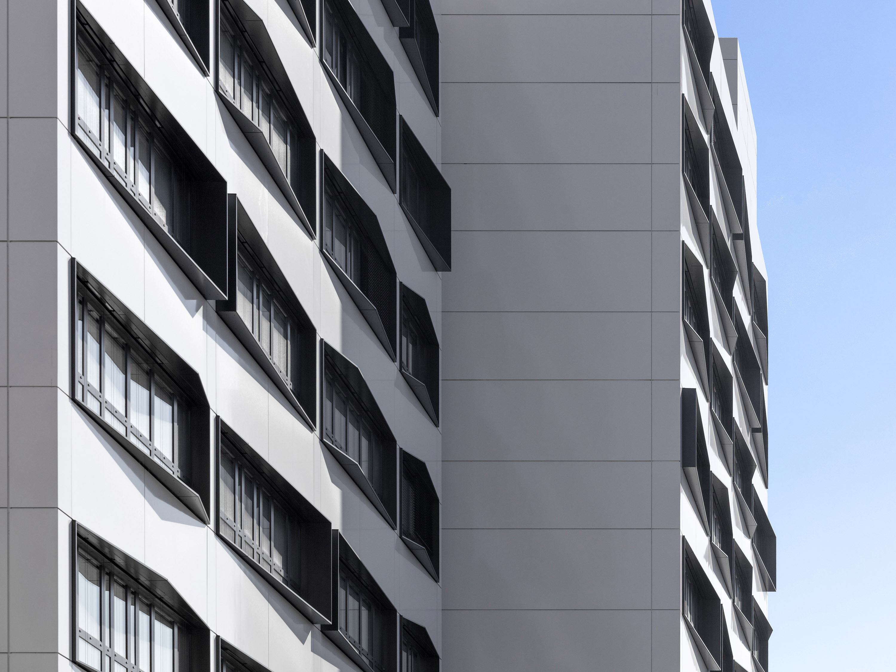 The new, rear-ventilated, curtain façade consists of large-format, highly weather-resistant, powder-coated, white aluminium sheet cassettes. These are structured by widely projecting window reveal boxes made individually from extruded aluminium profiles. The single-storey façade of the car park facing Wilhelmsaue was clad with pre-faced aluminium louvres.