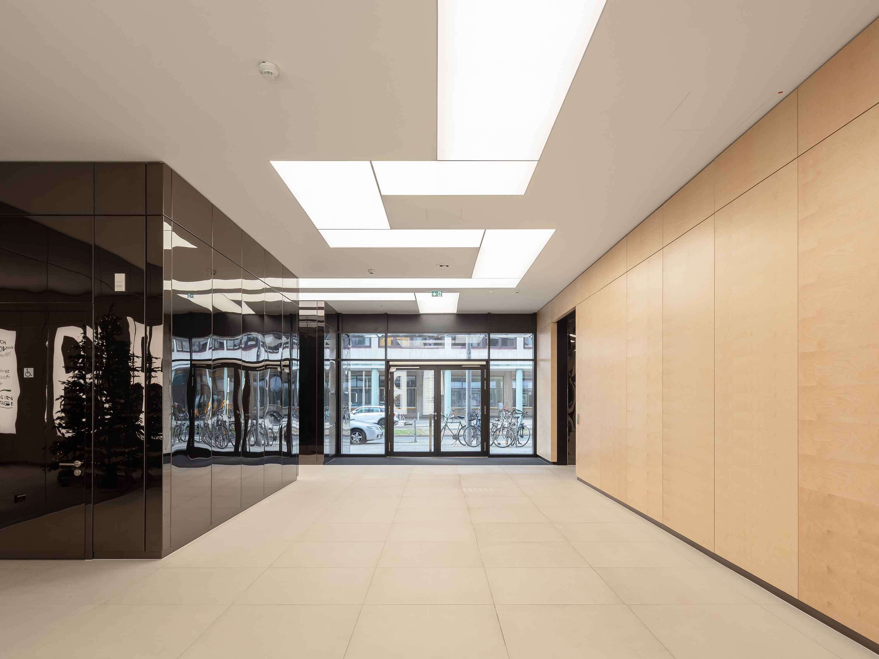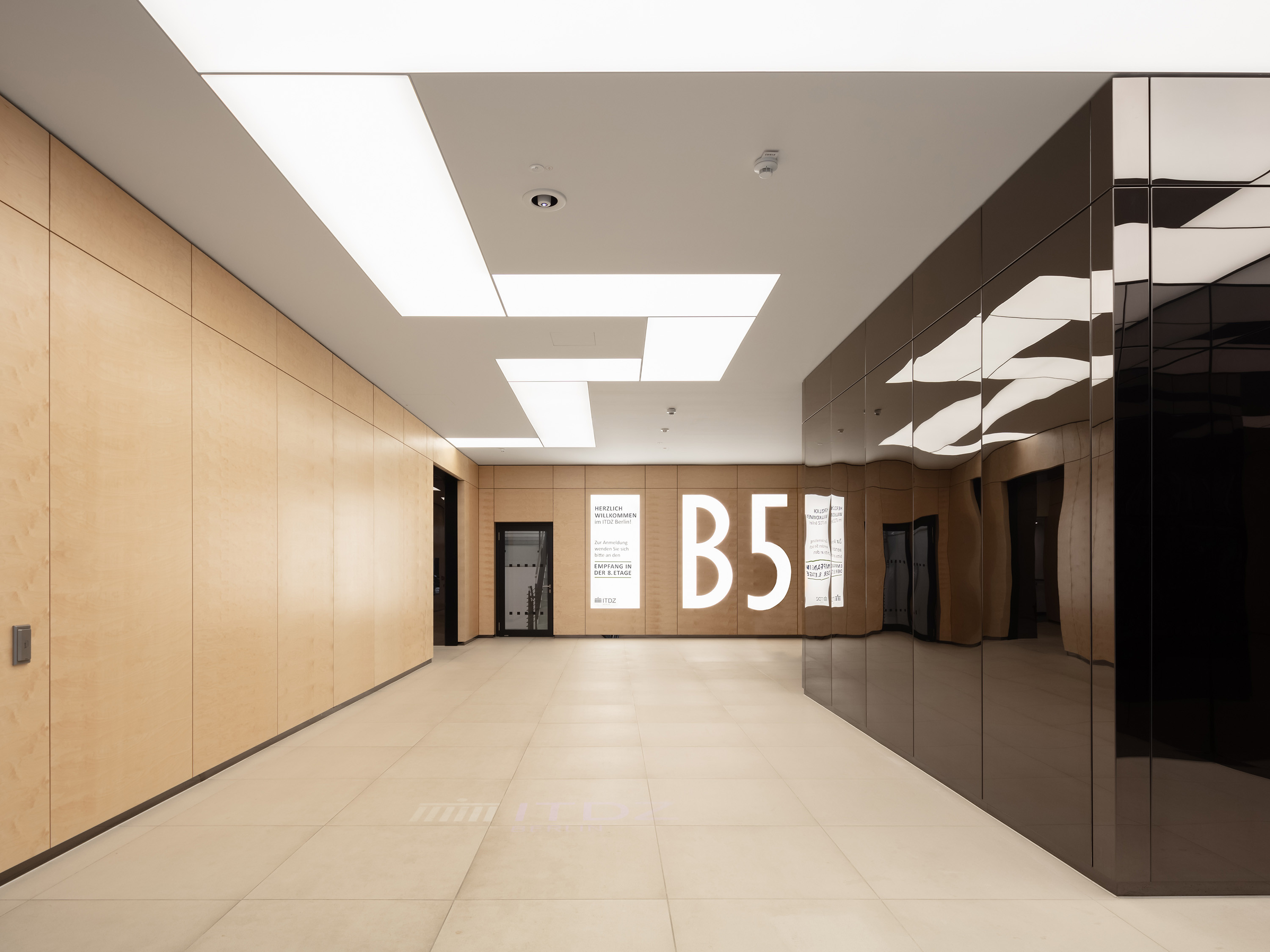 As part of the extensive refurbishment of the nine-storey office building complex, the office floors of initially two of the four building sections were converted, equipped with a pressure-ventilated stairwell and a fire brigade lift, the building services were modernised across the board and the underground car park was sealed by installing a new, partially lowered floor slab.