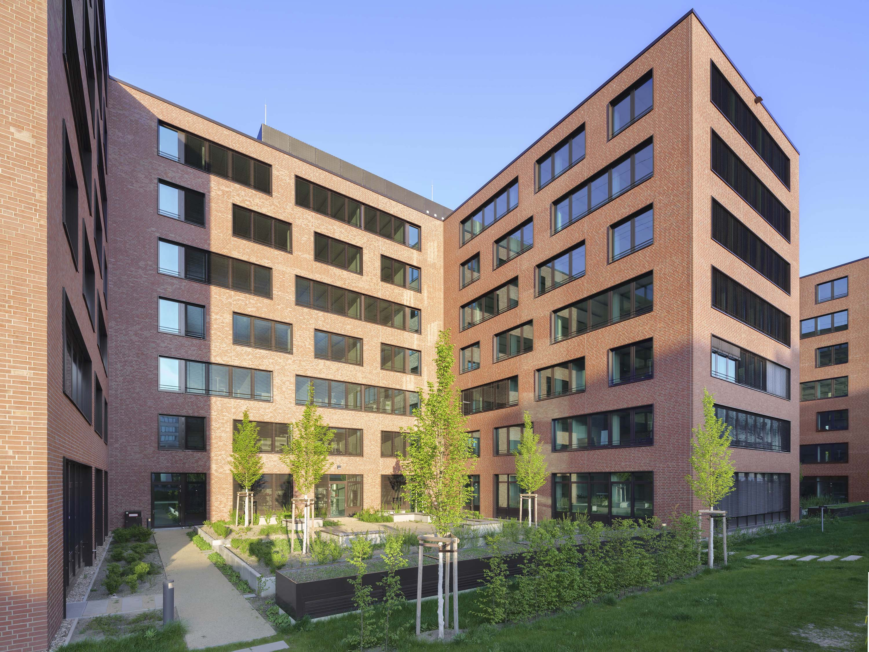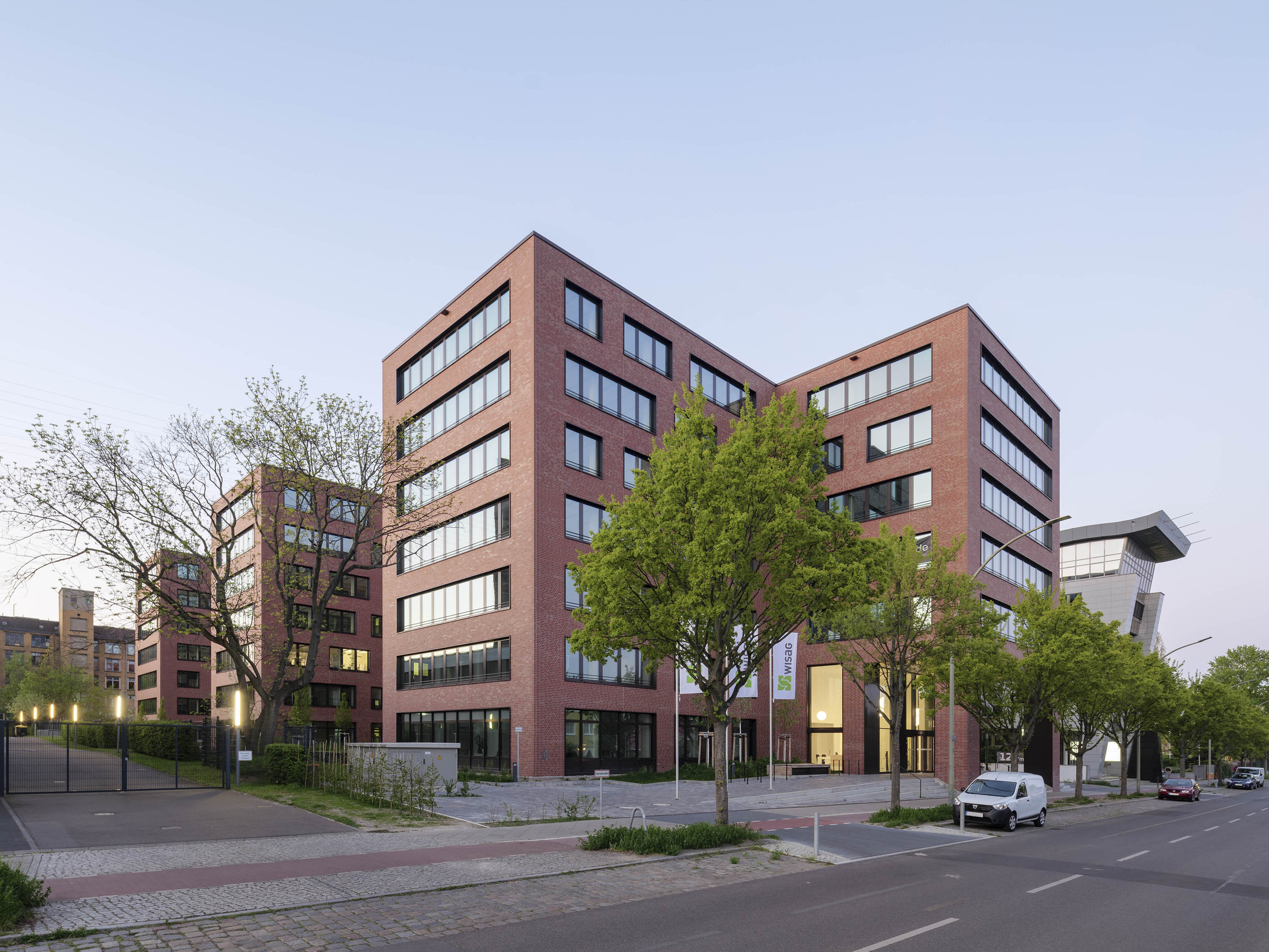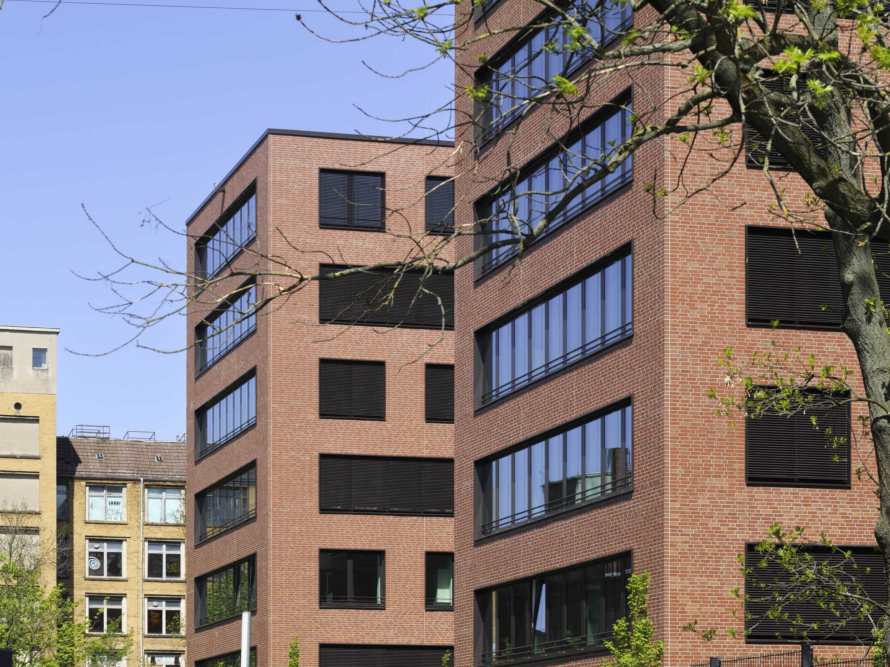 The "ALEX" building consists of a seven-storey block from which three transverse blocks of equal height extend to the west. The striking façade is finished in red brick. Architecturally, it ties in with the historical neighbouring buildings and is a reference to the industrial location of Lichtenberg in terms of cubature, colour and materiality. The storeys are divided by horizontal bands of windows, which are interrupted in places, giving the façade a varied appearance.