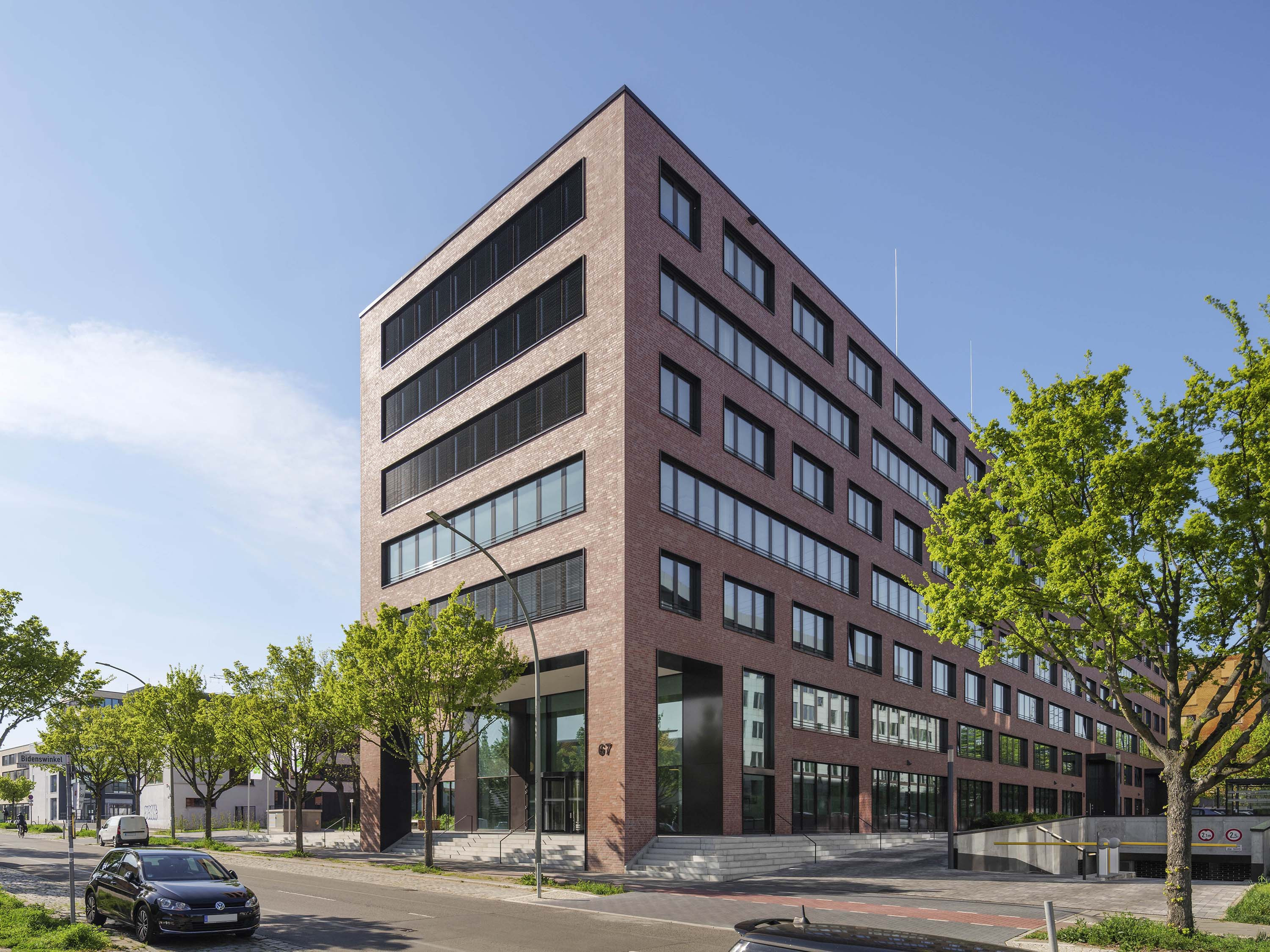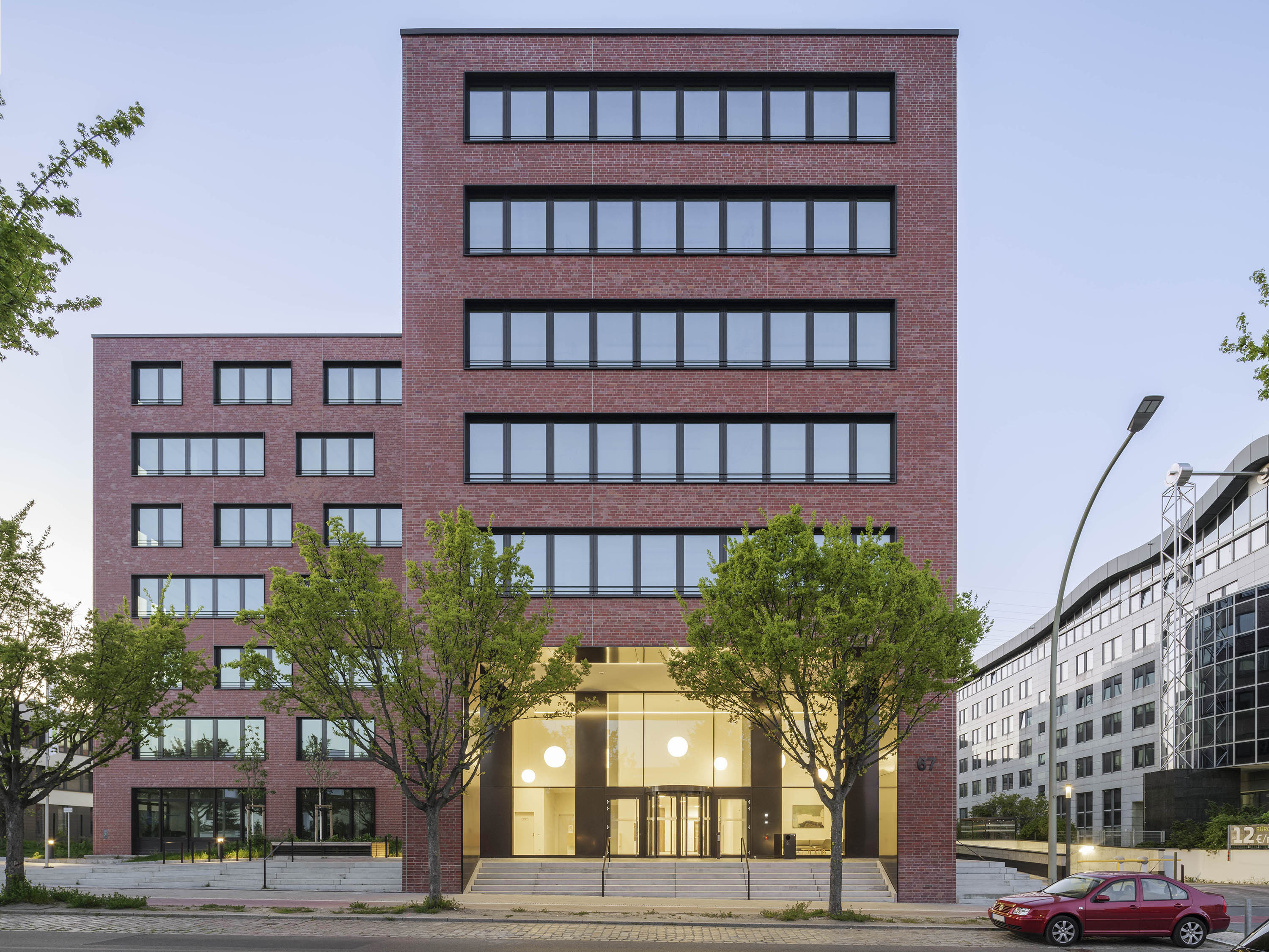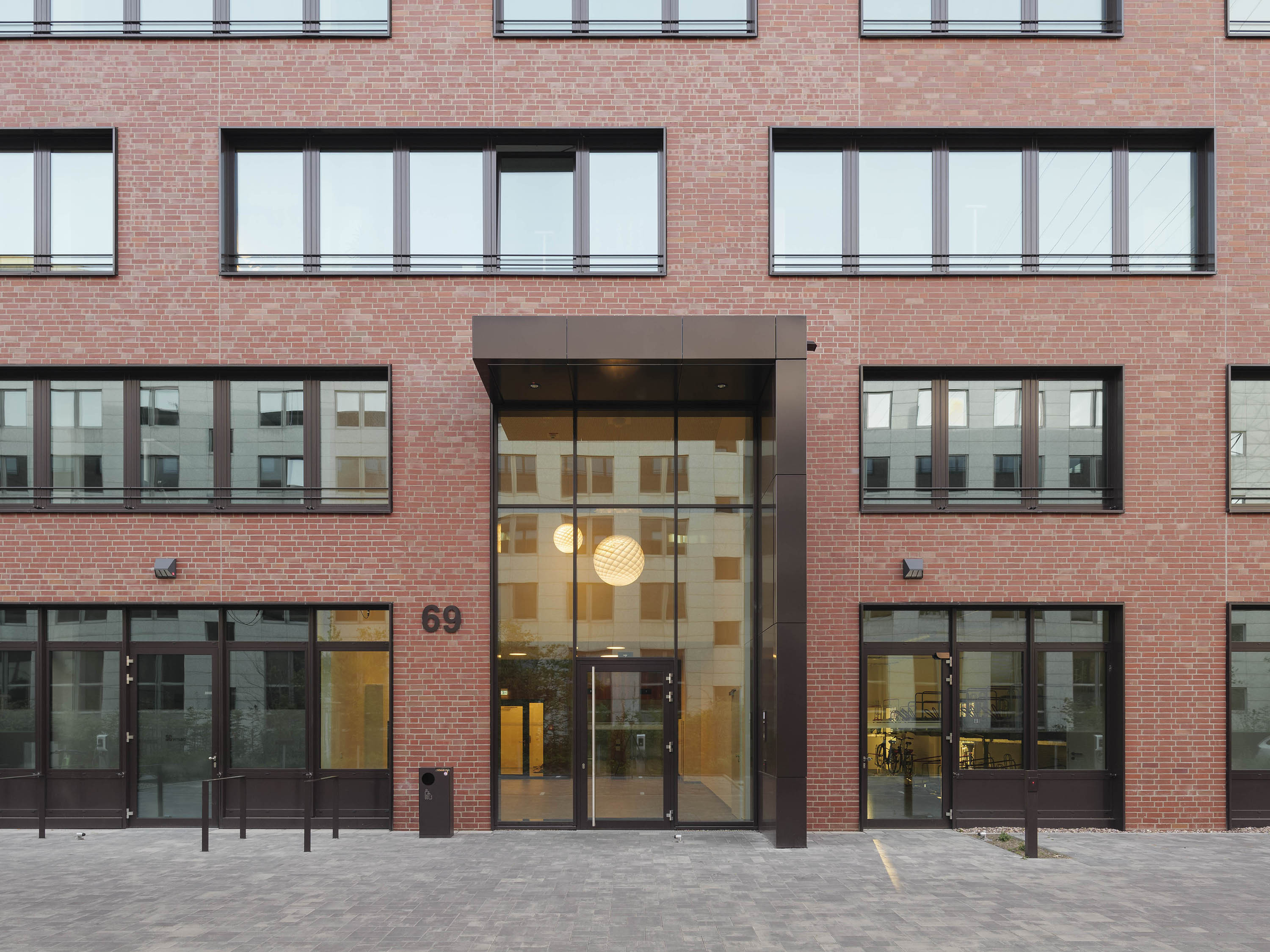 The "ALEX" building consists of a seven-storey block from which three transverse blocks of equal height extend to the west. The striking façade is finished in red brick. Architecturally, it ties in with the historical neighbouring buildings and is a reference to the industrial location of Lichtenberg in terms of cubature, colour and materiality. The storeys are divided by horizontal bands of windows, which are interrupted in places, giving the façade a varied appearance.