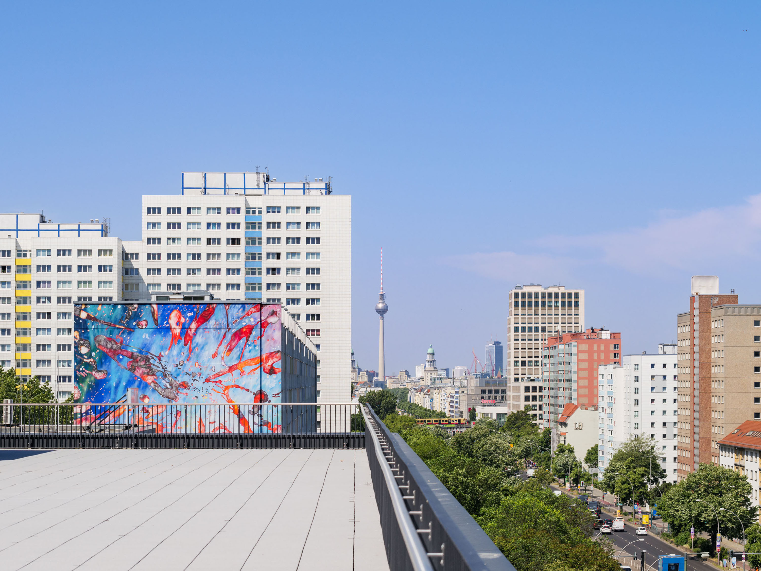 The square inner courtyard is landscaped and equipped with seating and a pavilion. The horizontal end of the building is formed by a flat roof, partially greened and with a roof terrace suitable for events, which offers a panoramic view towards Frankfurter Tor and the television tower.