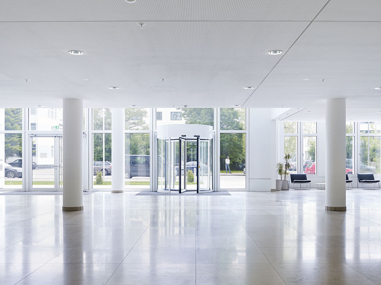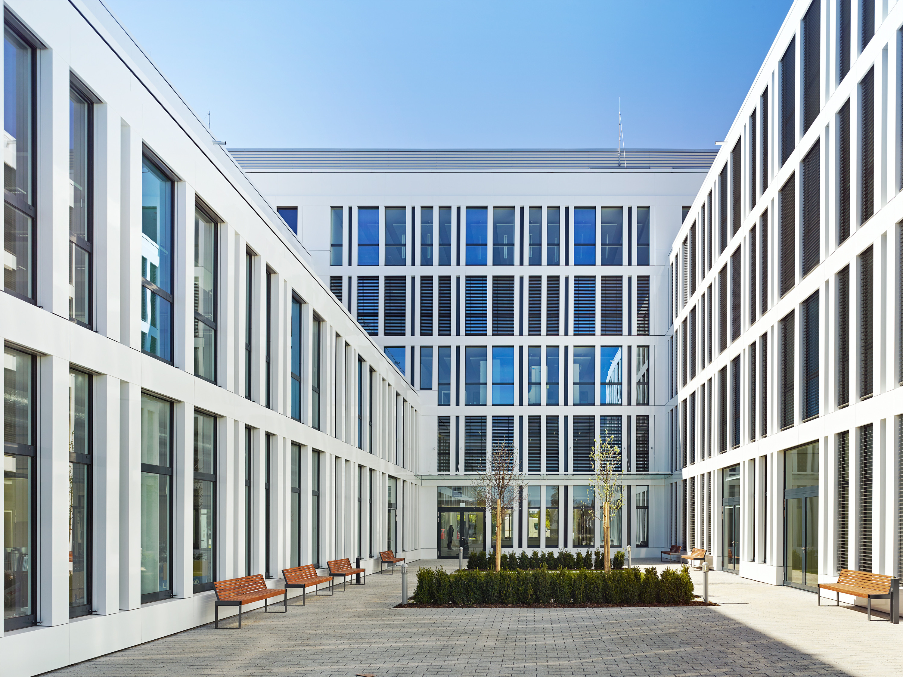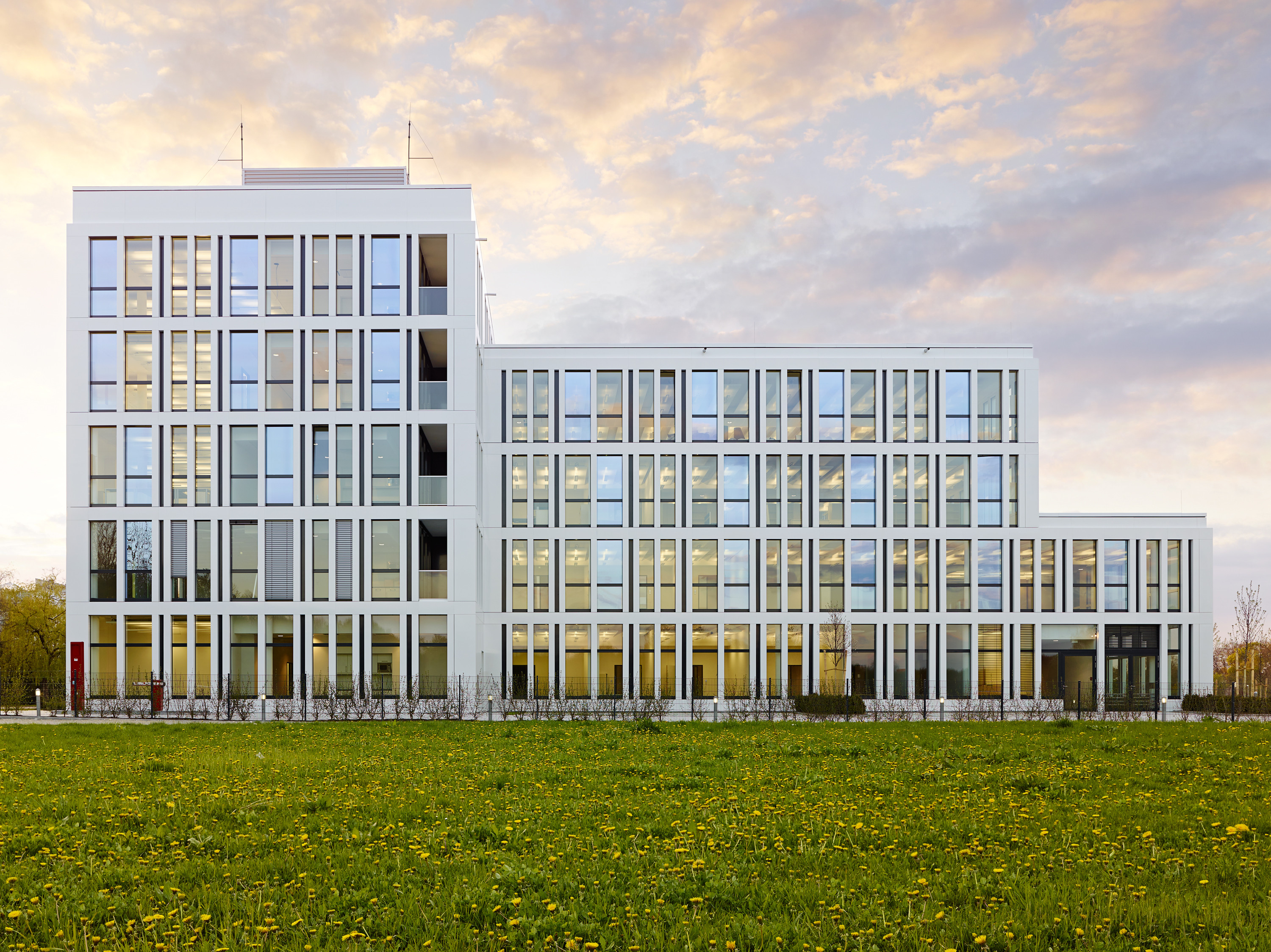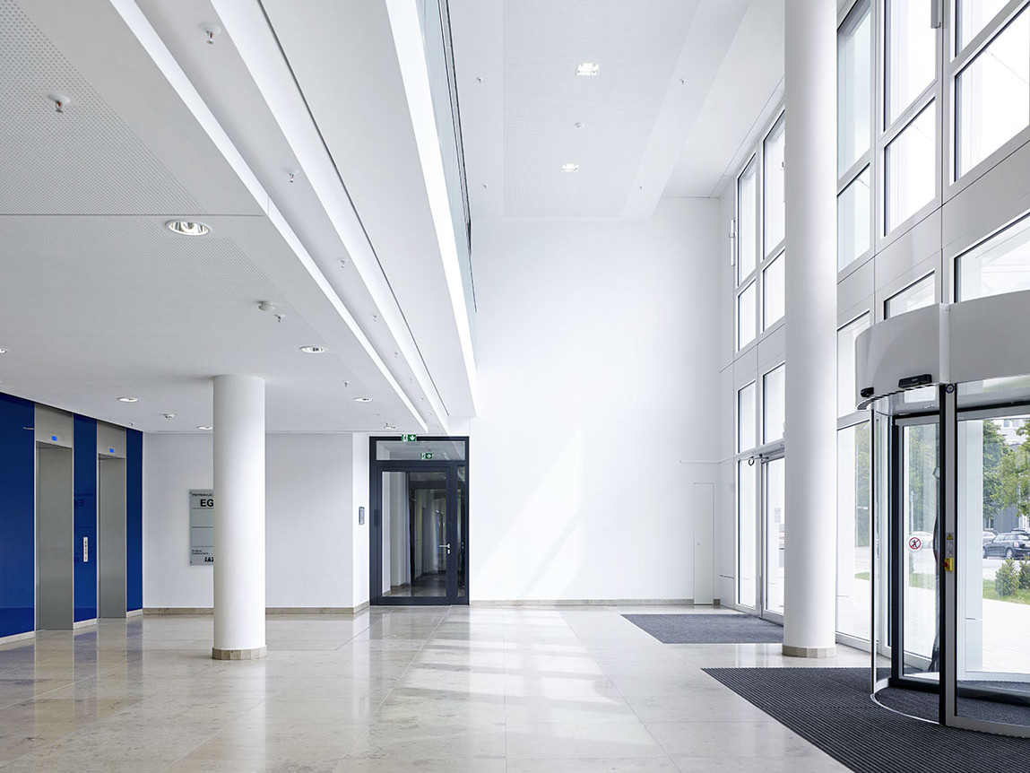 The building is clad with an outer shell of metal and glass elements, the grid of which allows for a flexible arrangement of partition walls.