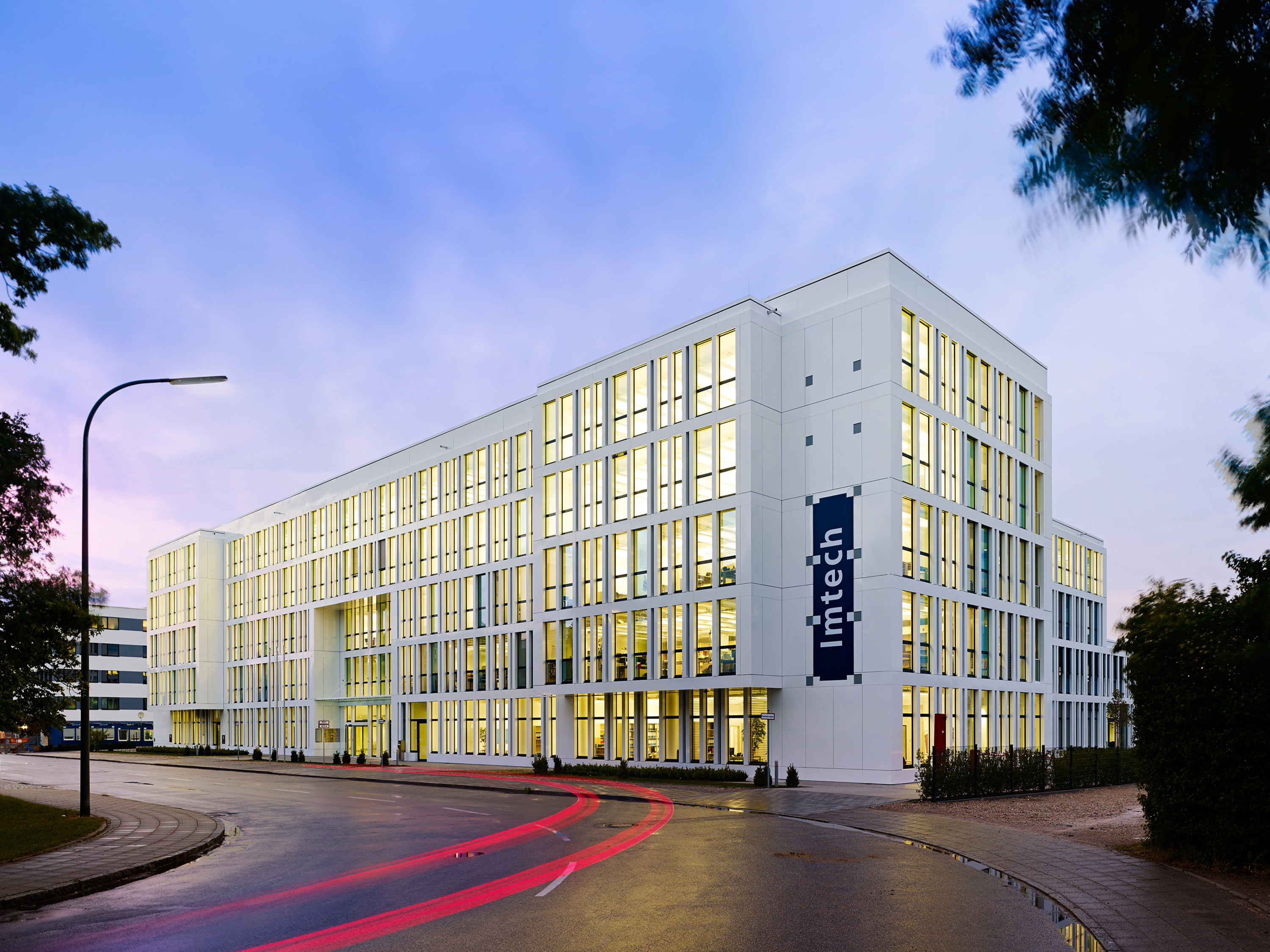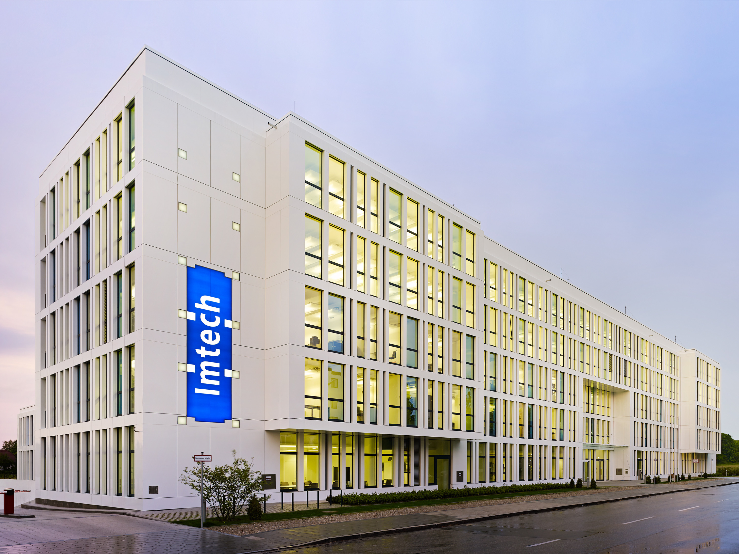 As an integral design element, the two ends of the main wing were given illuminated surfaces flush with the façade on the street side, the arrangement of which represents the company logo of the user Imtech and emphasises the corporate design.