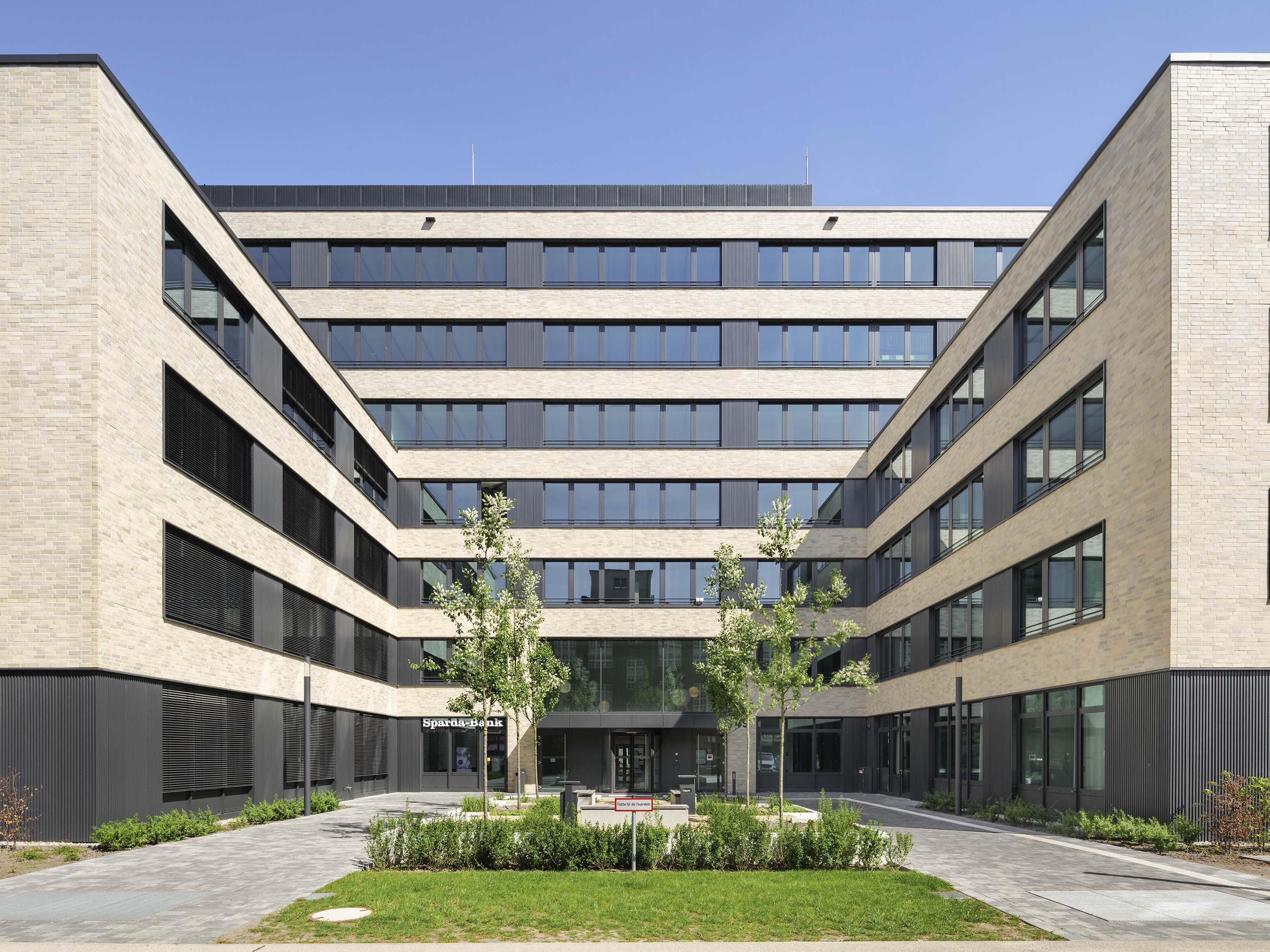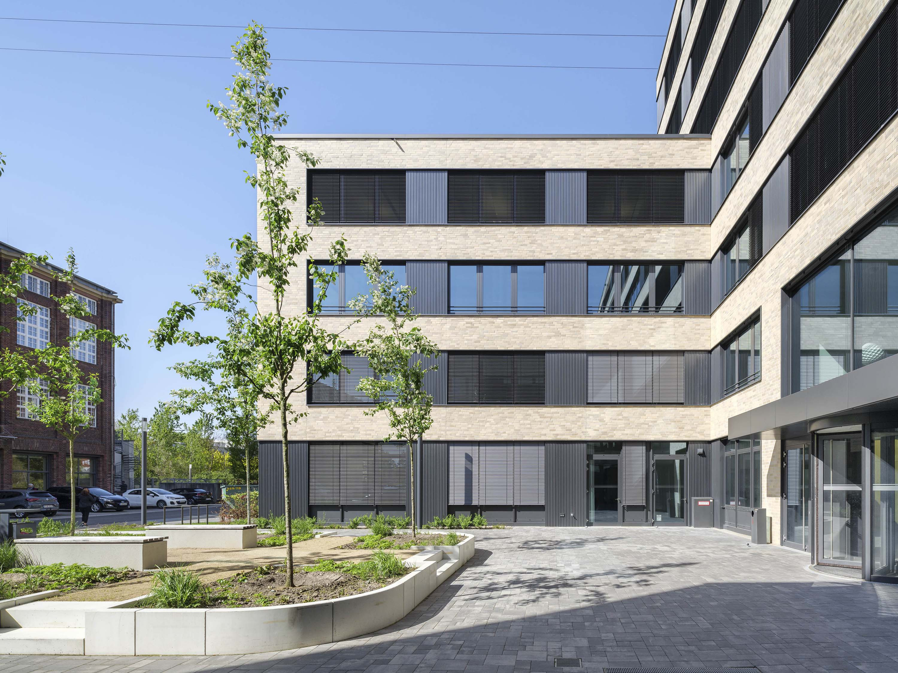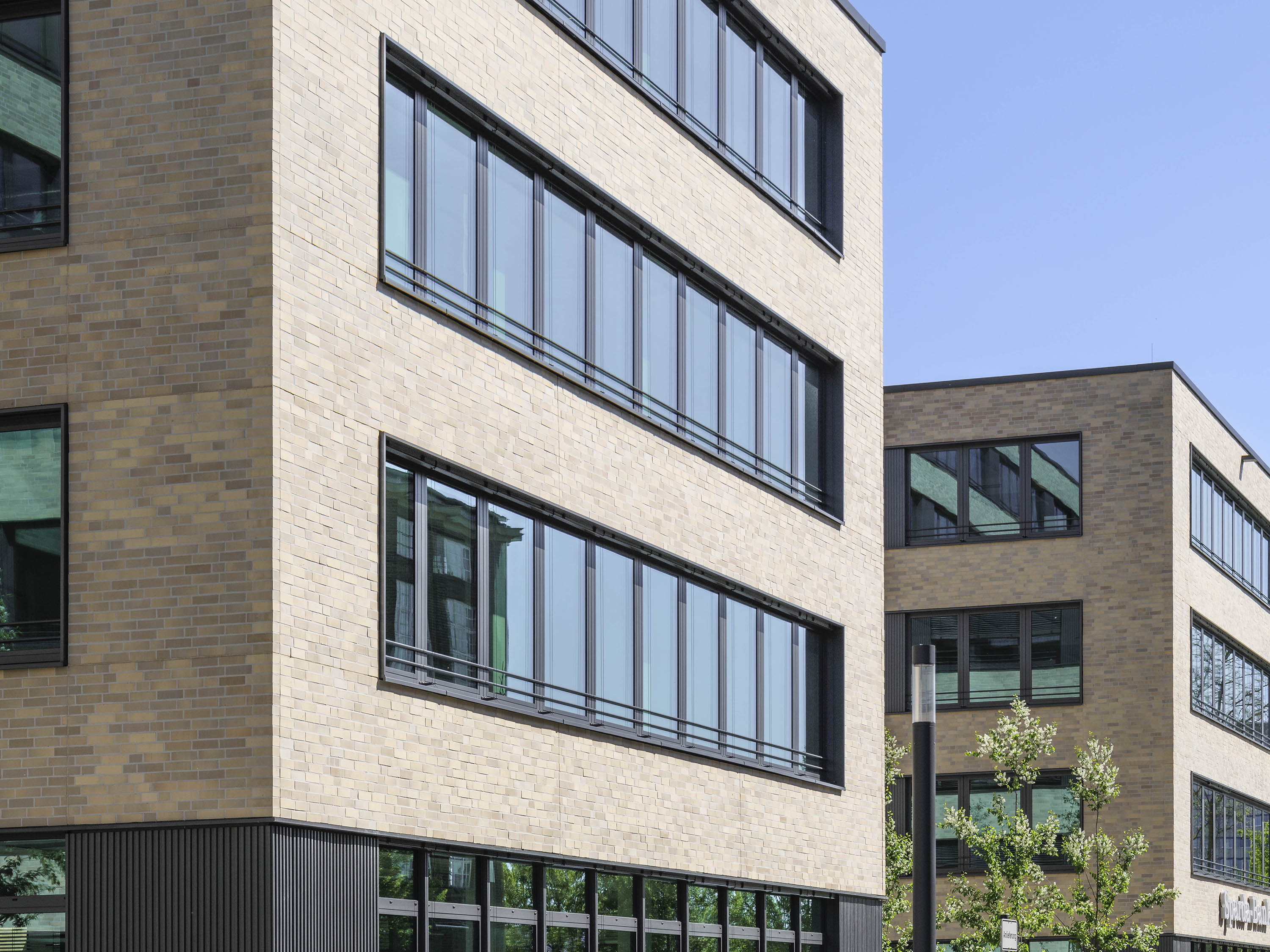 The cubature of the "LEO" building consists of three transverse, three-storey wings, which are connected longitudinally by a seven-storey building section. The rental areas are designed to be flexible, allowing both a cellular office layout and an open-plan variant. The exterior façade of the "LEO" building is structured by a grey-beige mottled brick slip façade. The supports between the ribbon windows were planned as relief sheet metal panelling.