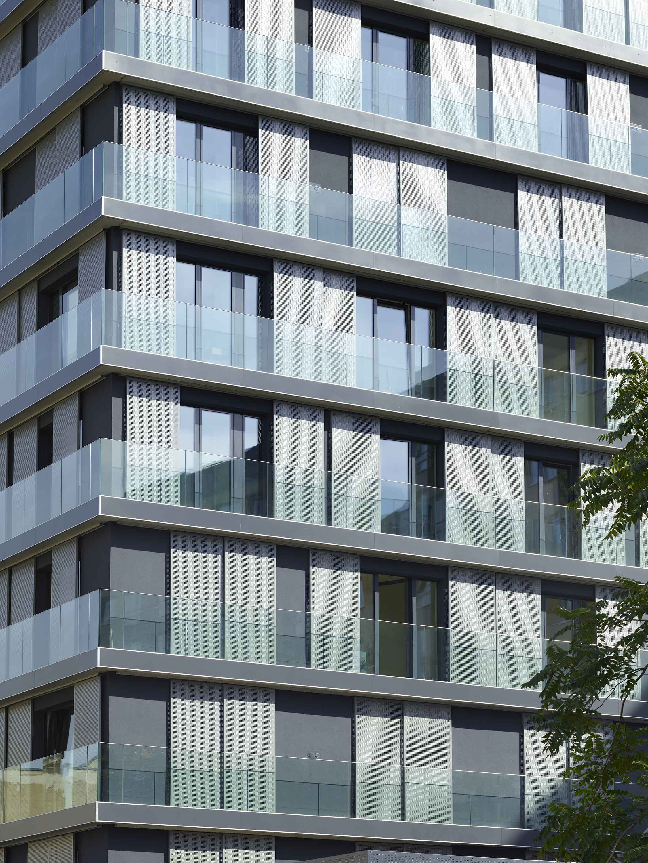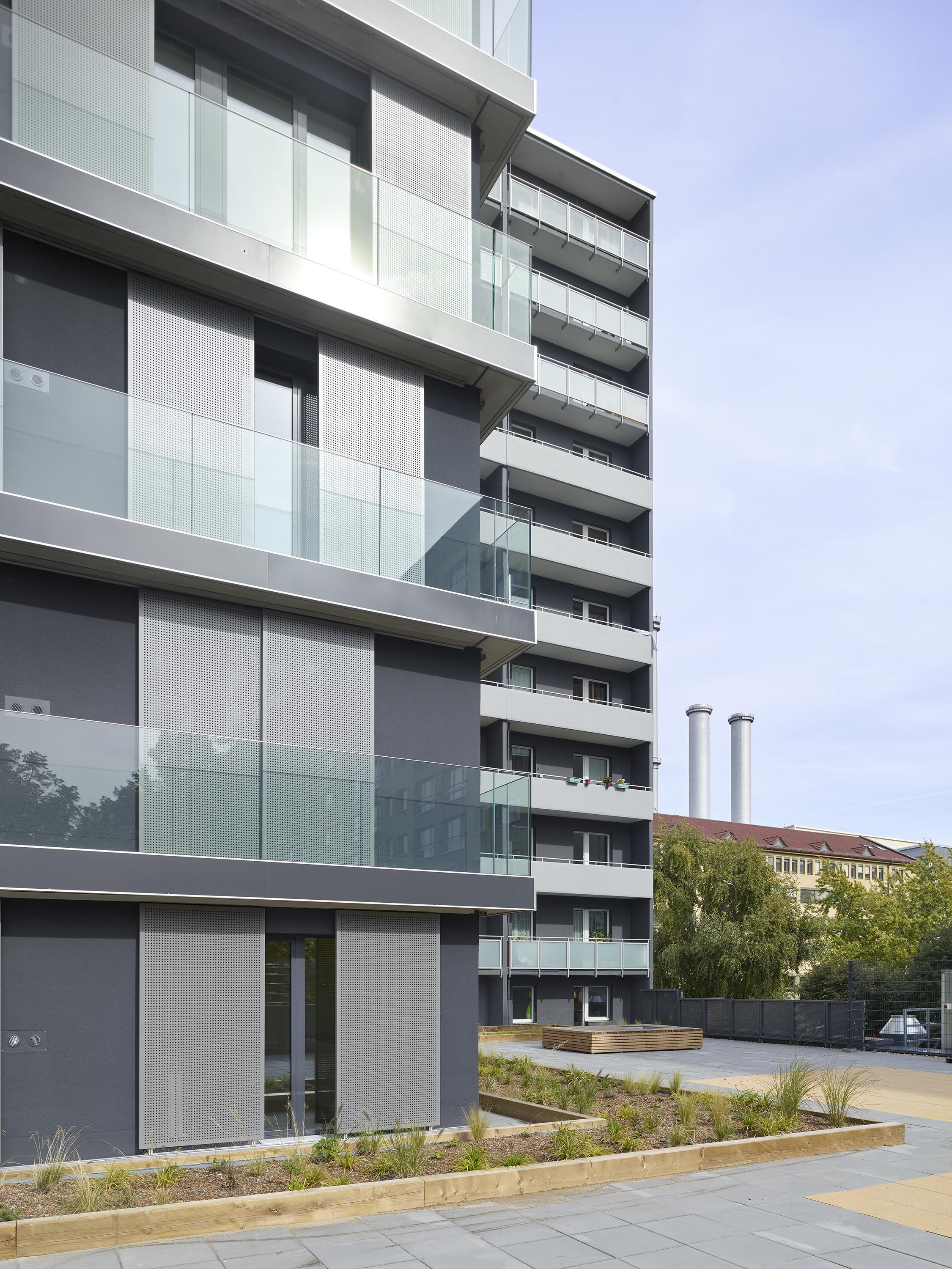 The façades of the new residential tower are clad with light-coloured Alucobond panels in the area adjacent to the existing building, the colour of which harmonises with the colouring of the existing façades.